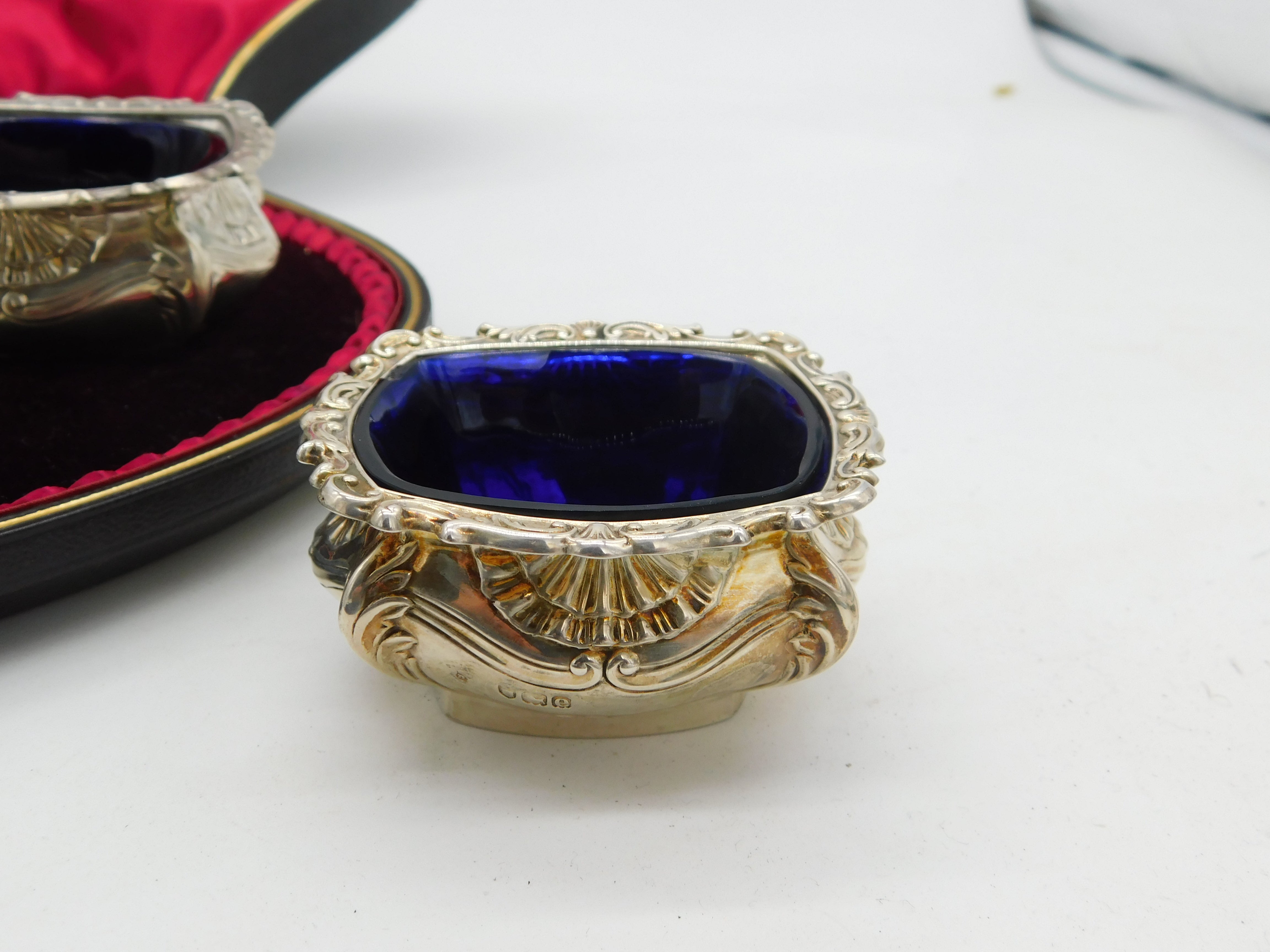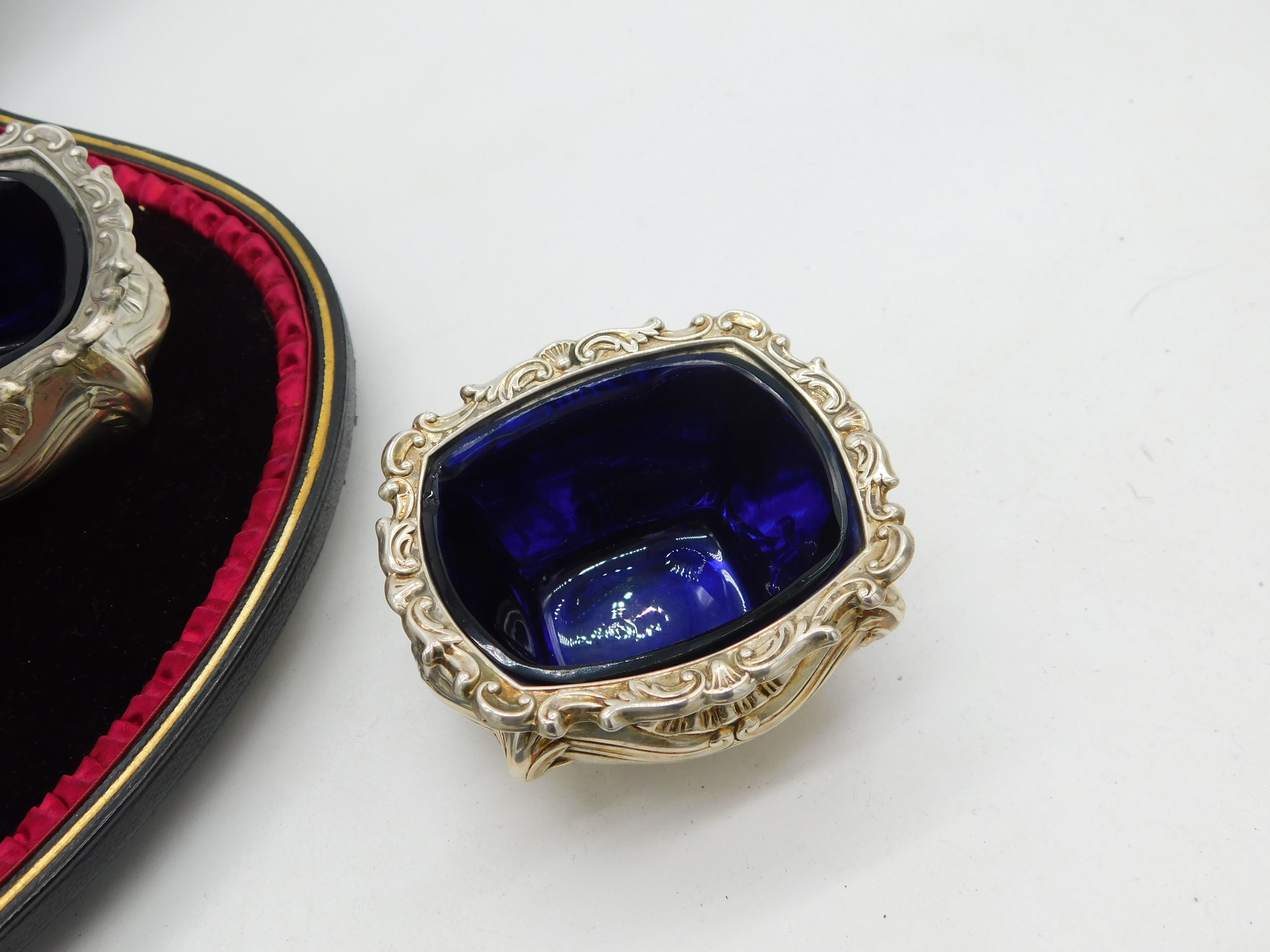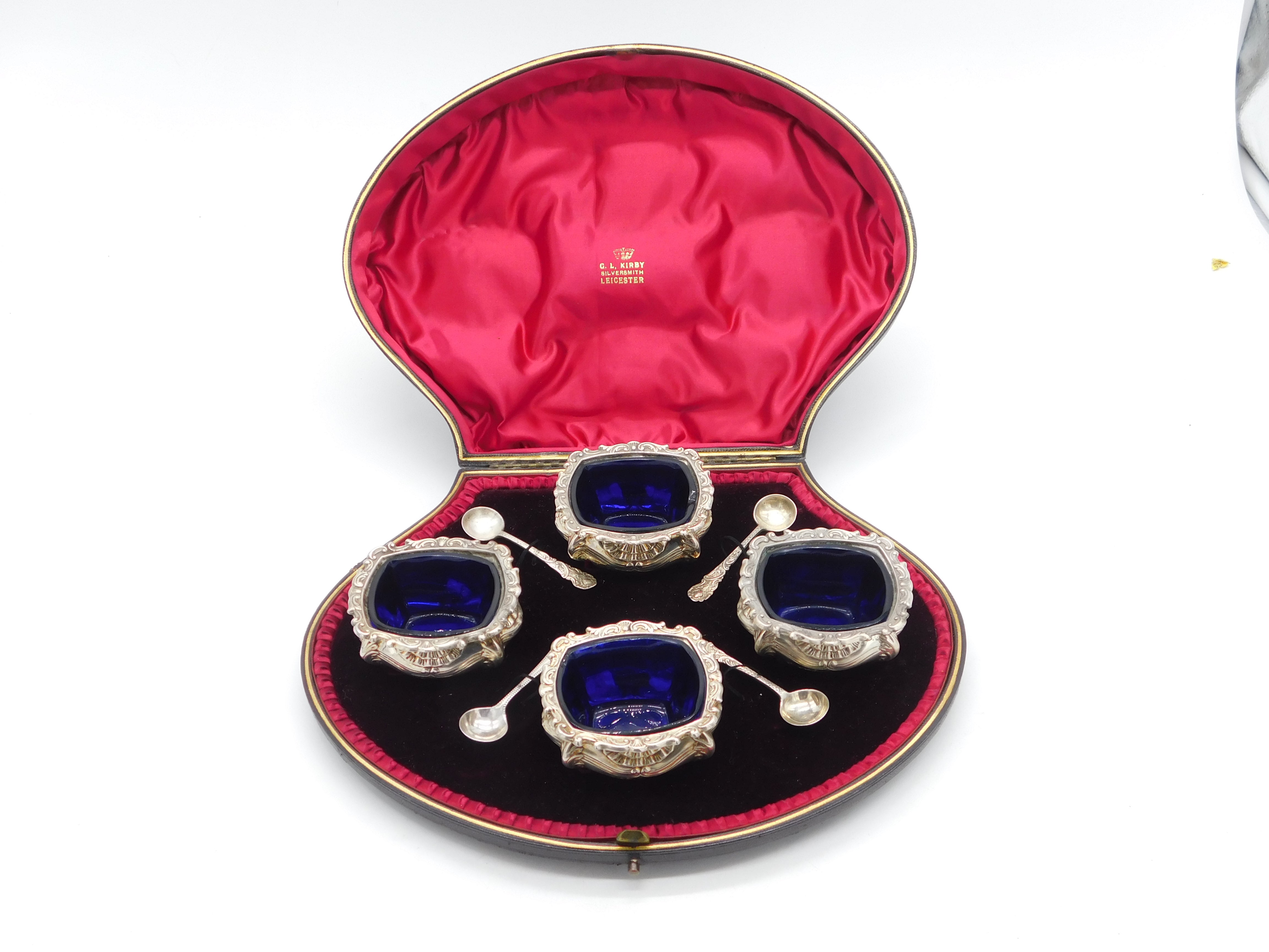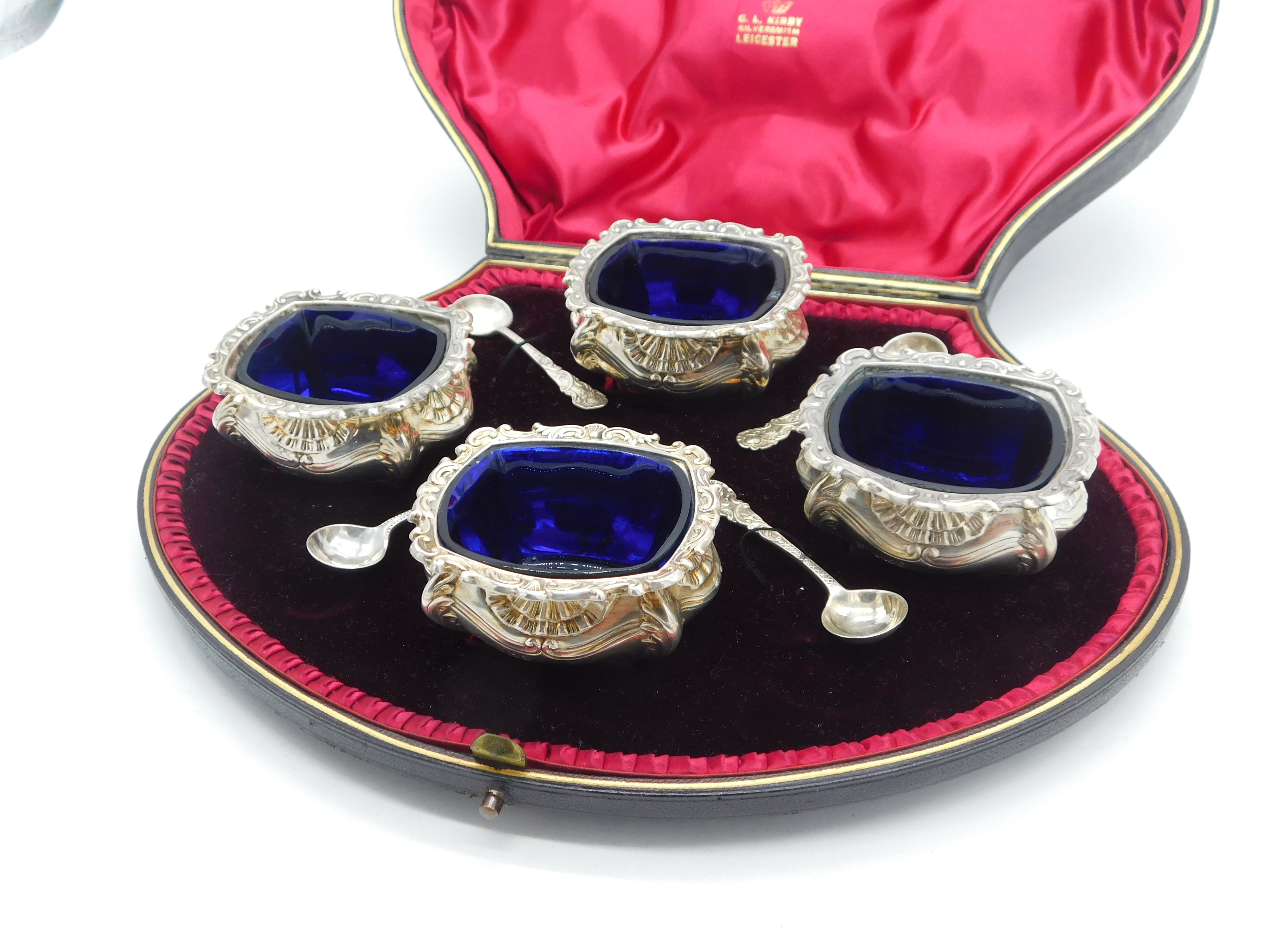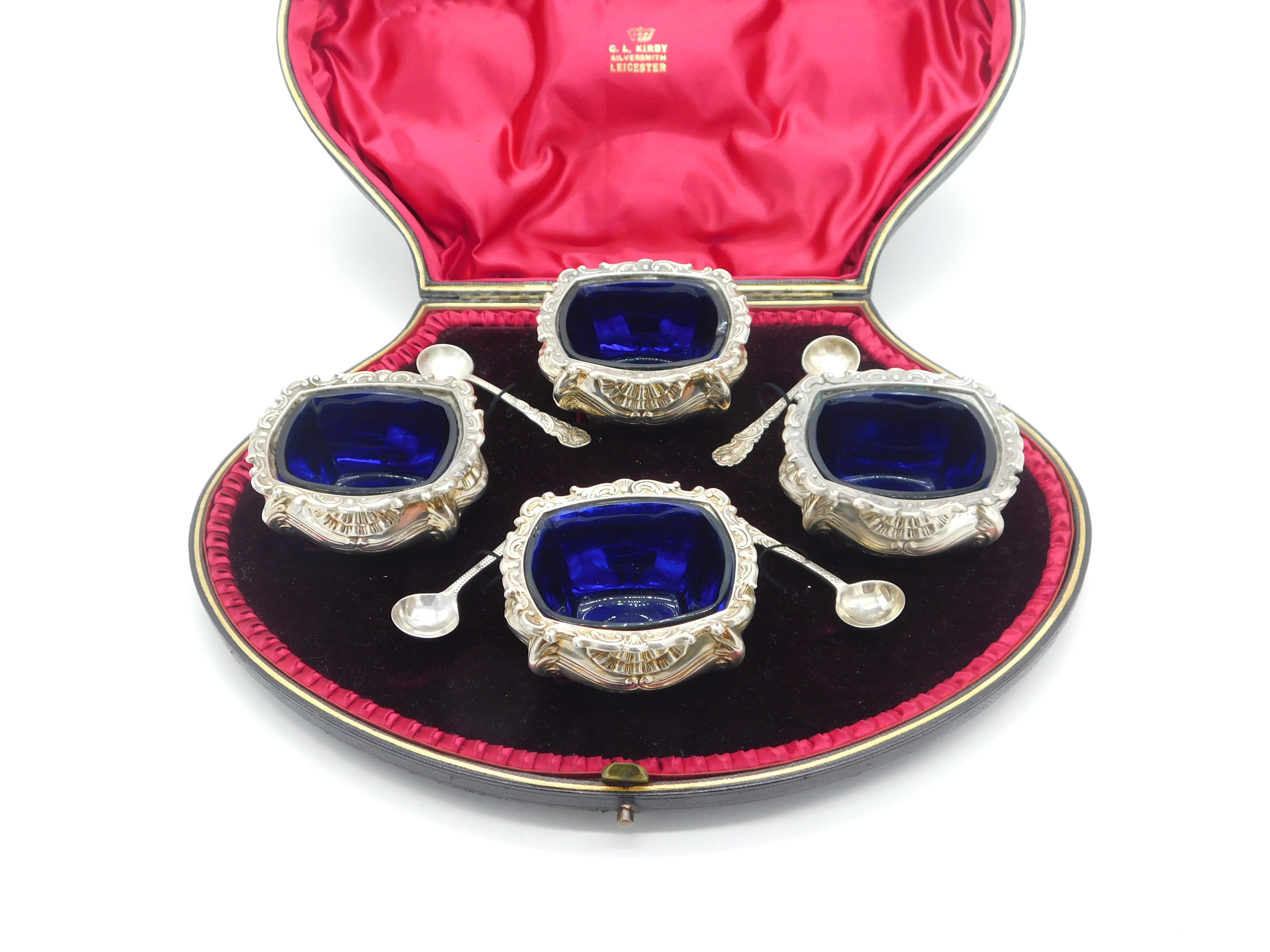 Details: A fantastic and wonderfully designed antique Victorian large boxed set of four sterling silver bristol blue glass lined salt cellars with lovely detailing hallmarked London 1900 by Josiah William & Co. This is a wonderful item that would make a perfect gift or addition to any collection. The BOX pictured is for PRESENTATION ONLY and is NOT included in the listings but used to frame the pictures unless specifically stated otherwise.