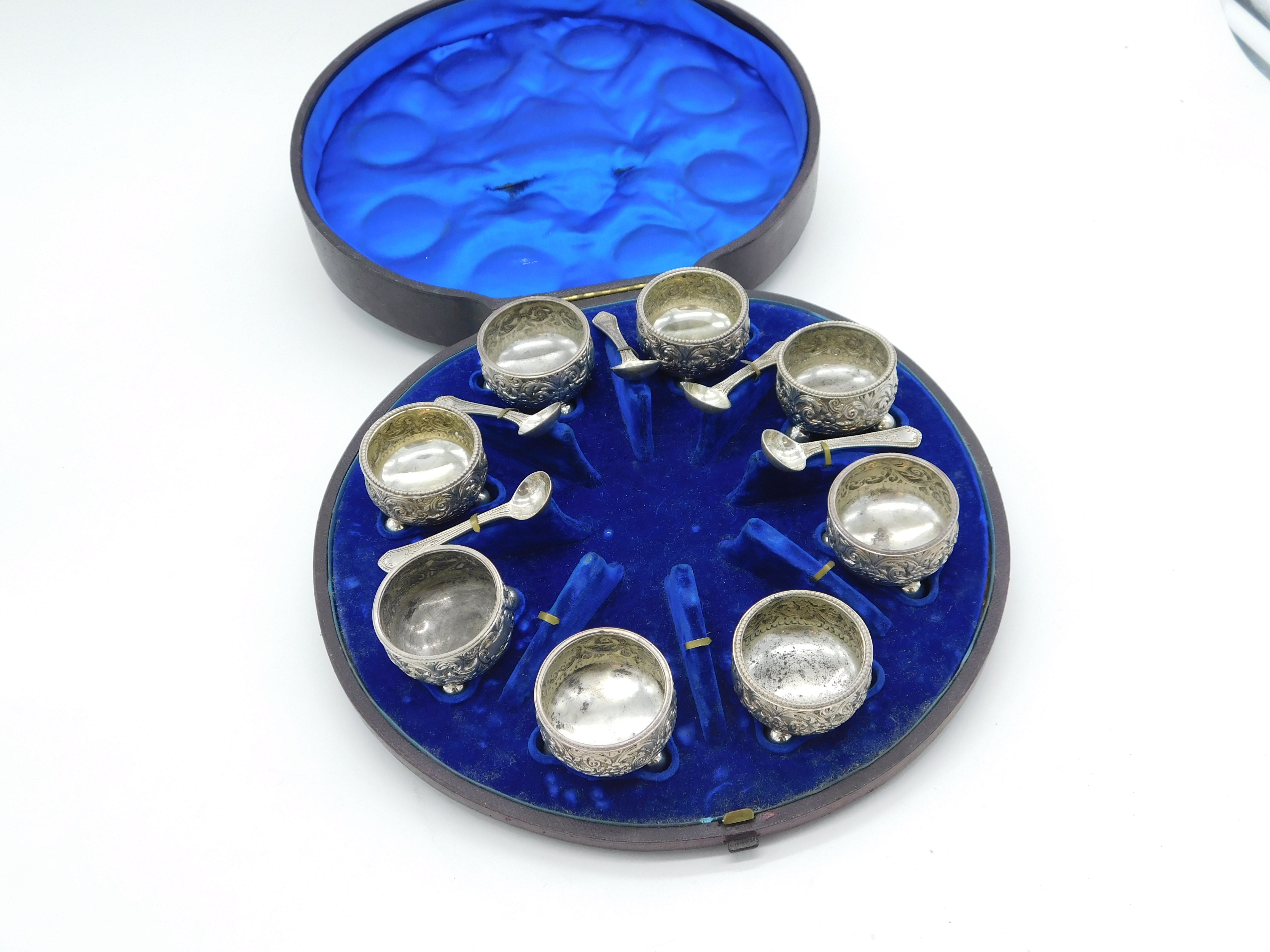 Details: A fantastic and wonderfully designed antique boxed set of eight Victorian sterling silver floral pattern salt cellars with lovely detailing hallmarked London 1881 by William Evans. This is a wonderful item that would make a perfect gift or addition to any collection. The BOX pictured is for PRESENTATION ONLY and is NOT included in the listings but used to frame the pictures unless specifically stated otherwise.