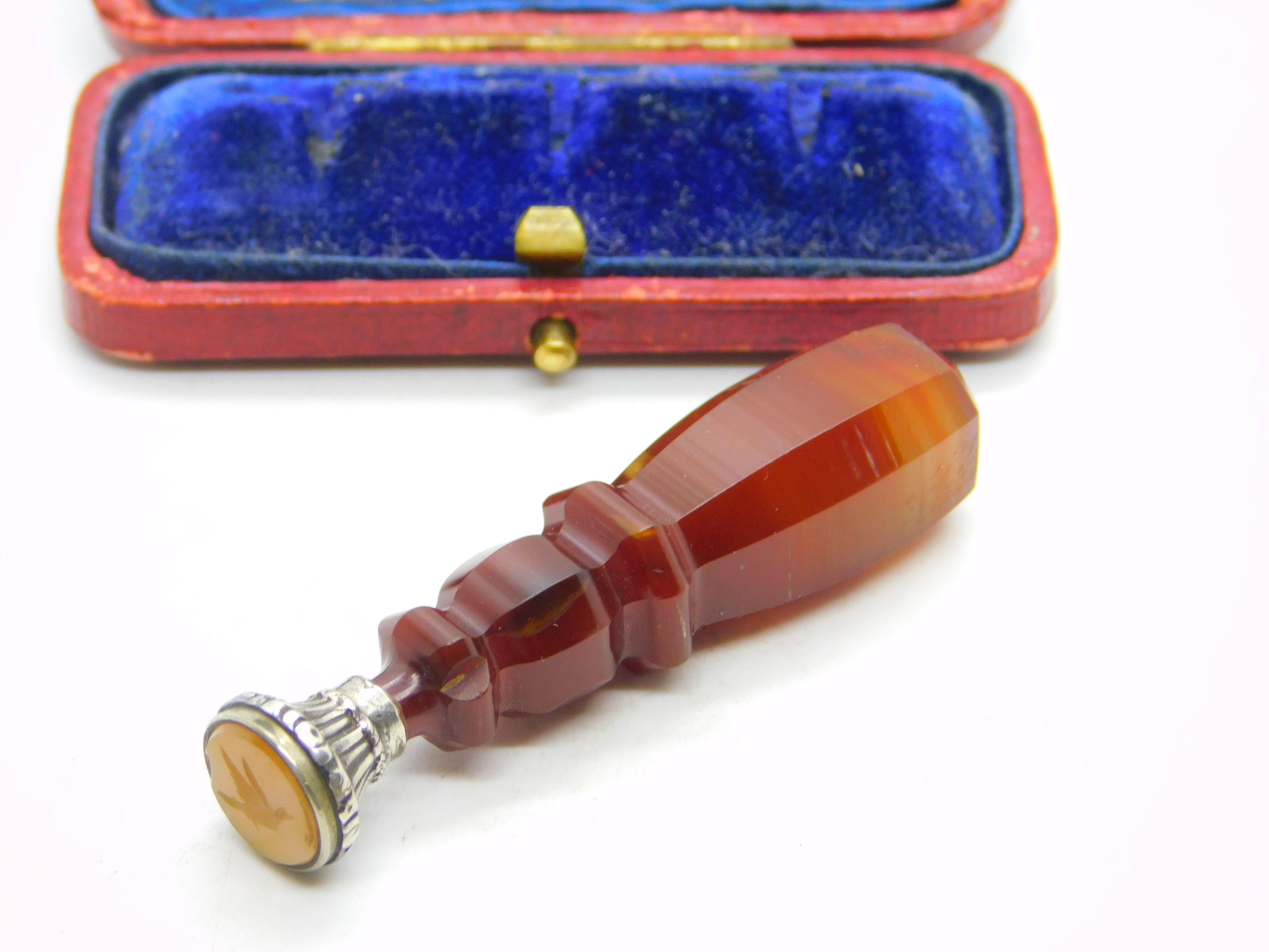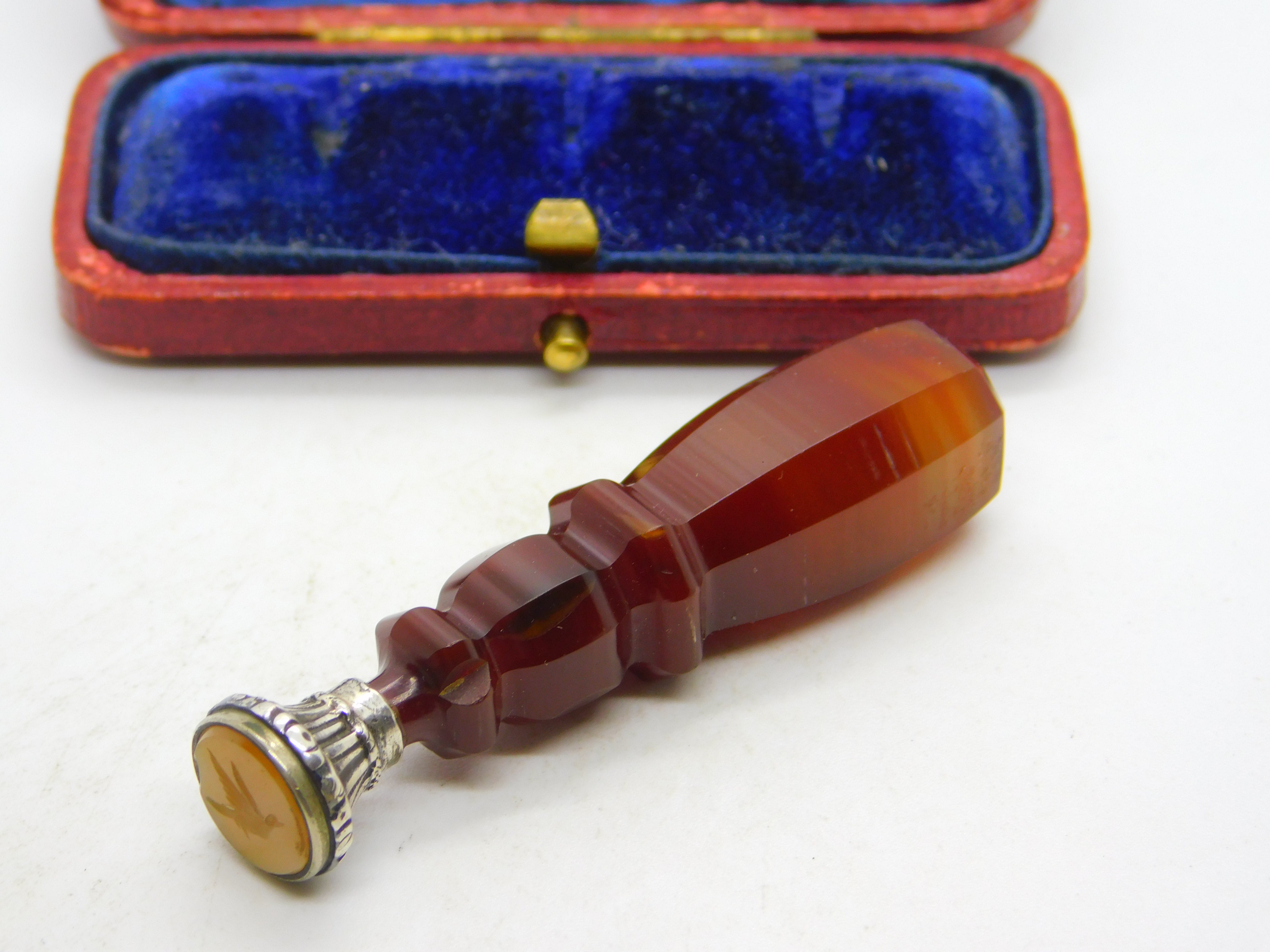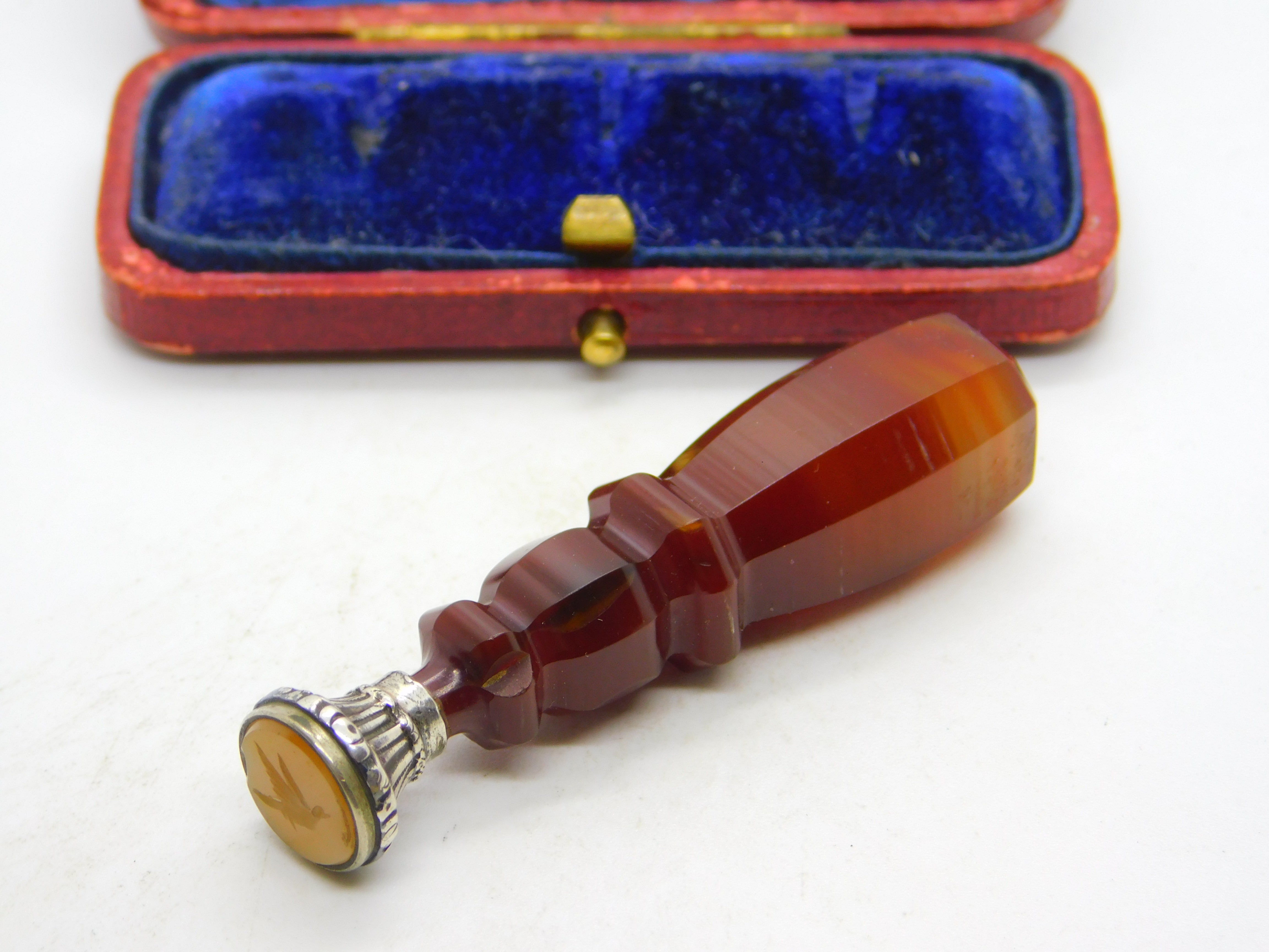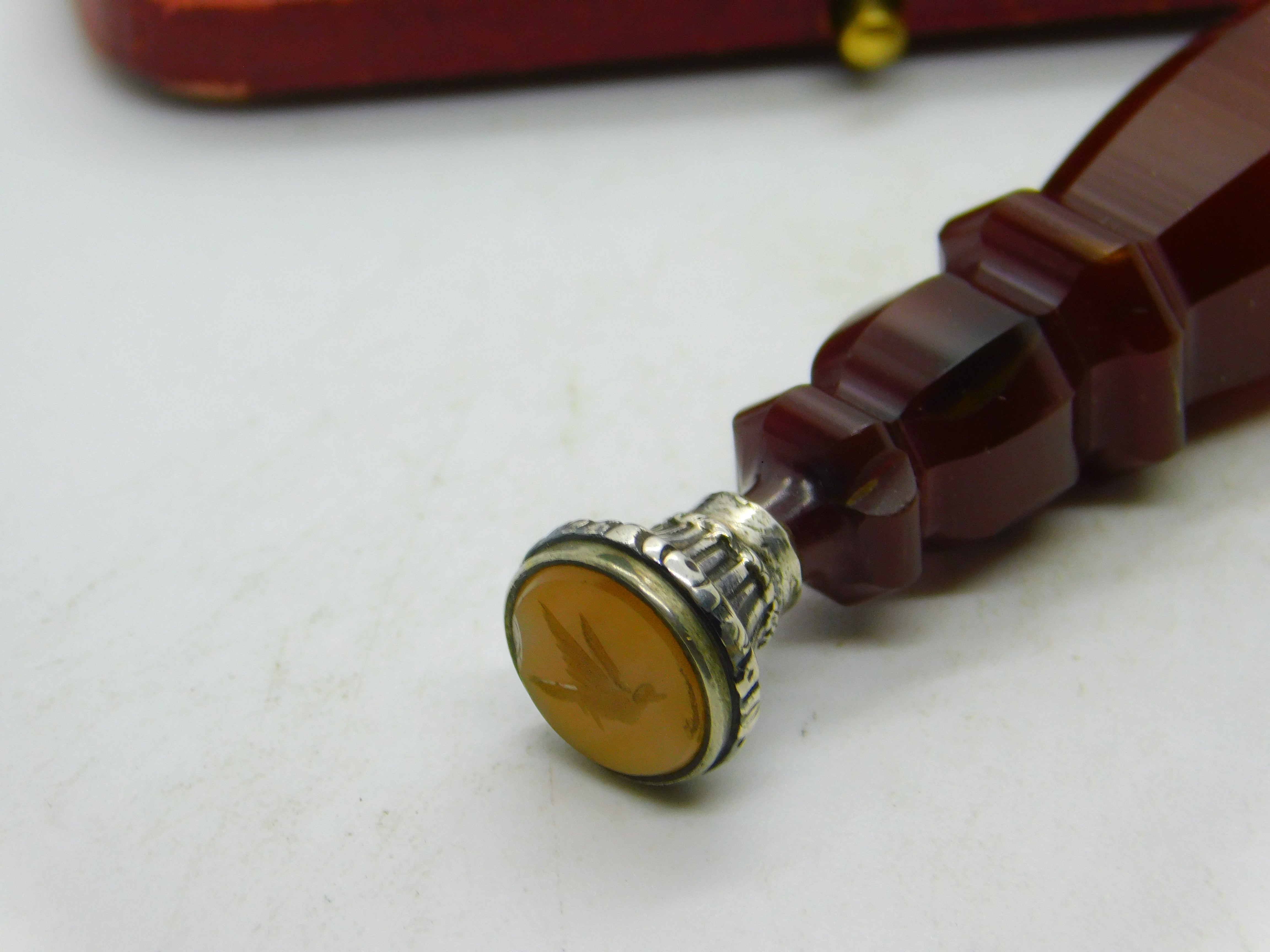 Victorian Carved Red Banded Agate, Sterling Silver Swallow Bird Desk Seal c1880