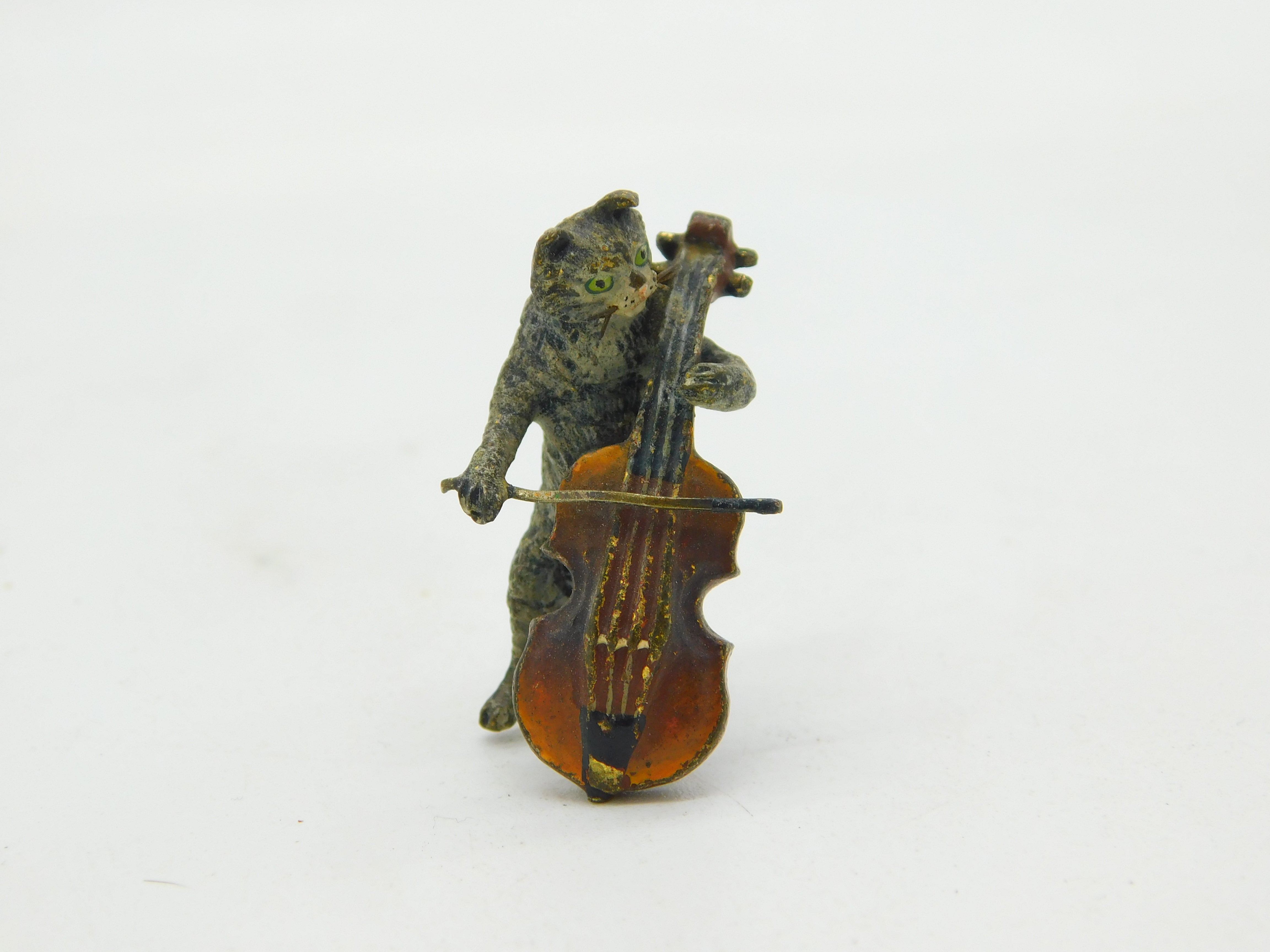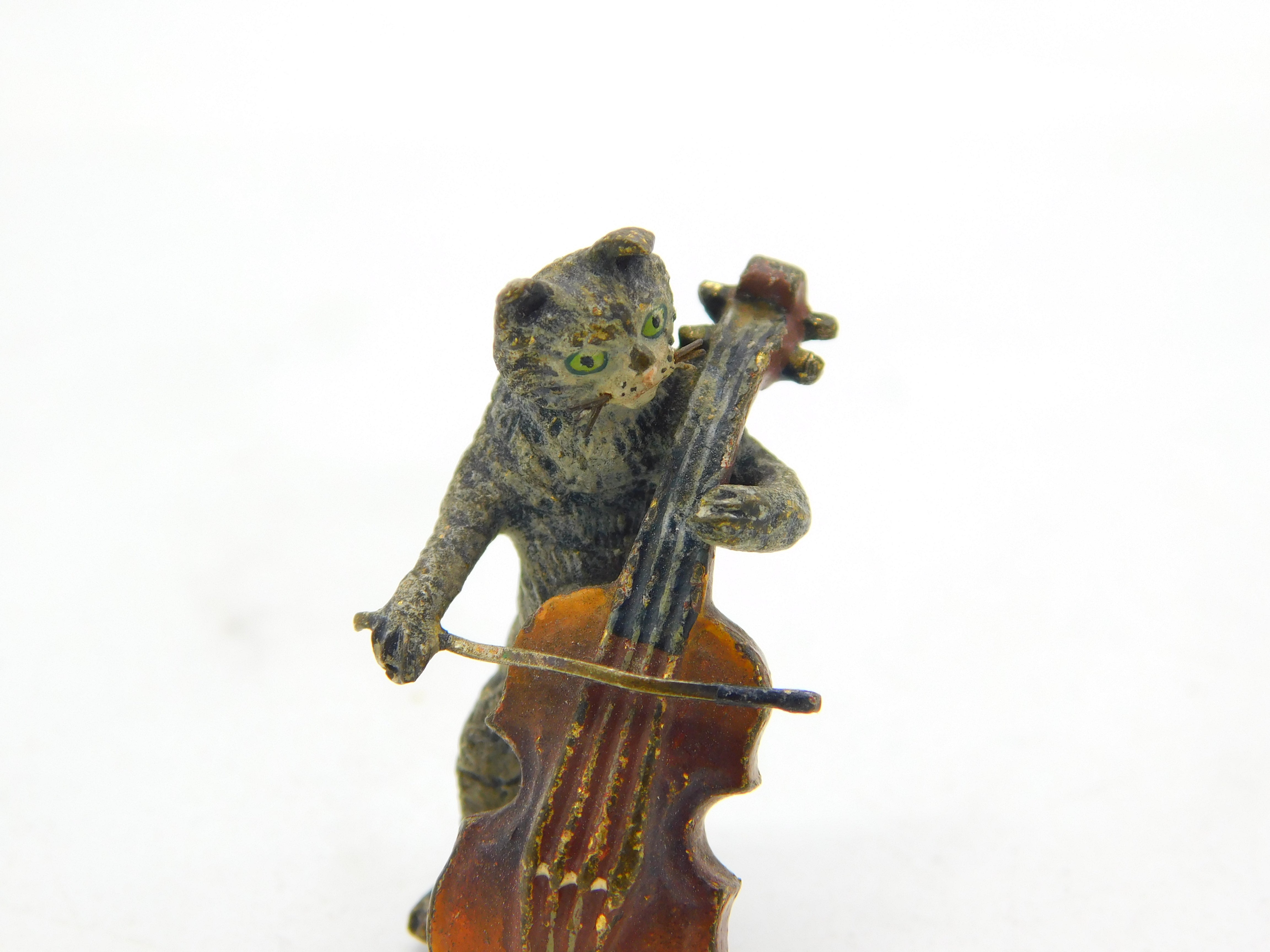 Details: A fantastic and wonderfully designed antique miniature cold painted vienna bronze miniature cello playing cat novelty figurine ornament c1860. This is a wonderful item that would make a perfect gift or addition to any collection. We are more than happy to provide XRF reports for items upon request.