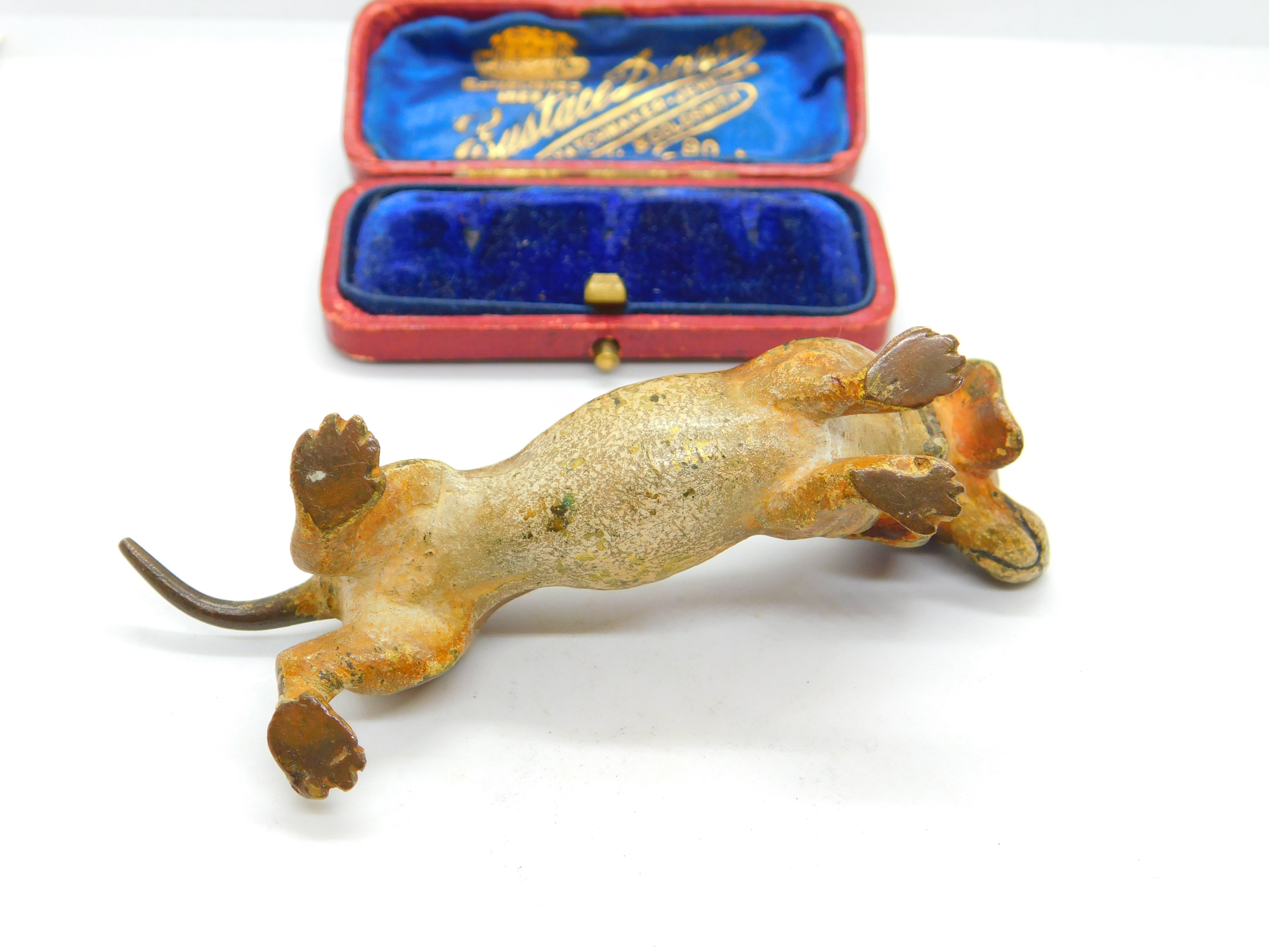 Details: A fantastic and wonderfully designed antique Victorian cold painted Vienna bronze sculpture of a Dachshund with lovely detail c1860.  This is a wonderful item that would make a perfect gift or addition to any collection. The BOX pictured is for PRESENTATION ONLY and is NOT included in the listings but used to frame the pictures unless specifically stated otherwise.