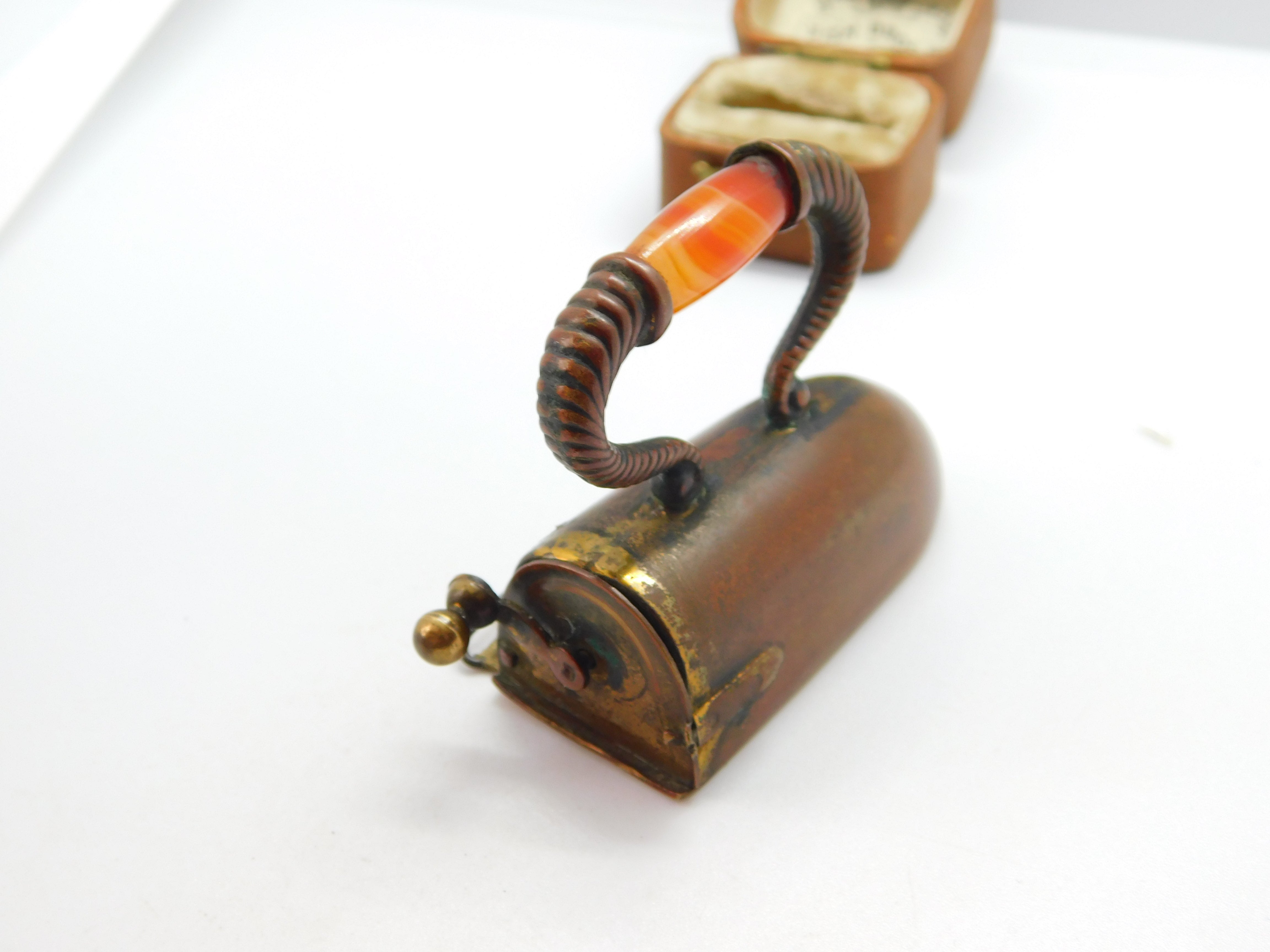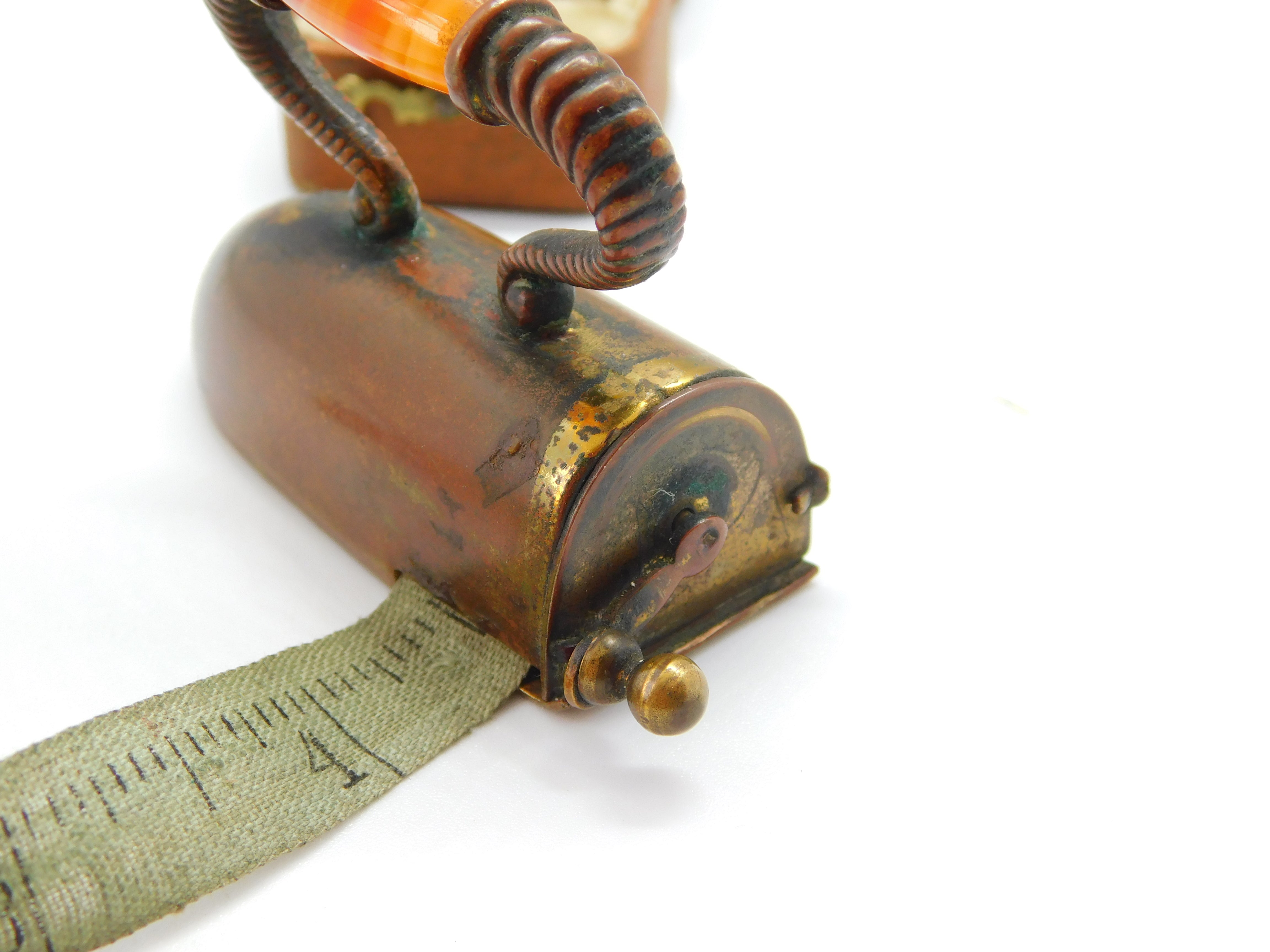 Details: A fantastic and wonderfully designed antique Victorian copper metal and banded agate novelty sewing tape measure in the form of a household iron c1860. The mechanism works well and the tape is in tact. This is a wonderful item that would make a perfect gift or addition to any collection. The BOX pictured is for PRESENTATION ONLY and is NOT included in the listings but used to frame the pictures unless specifically stated otherwise.