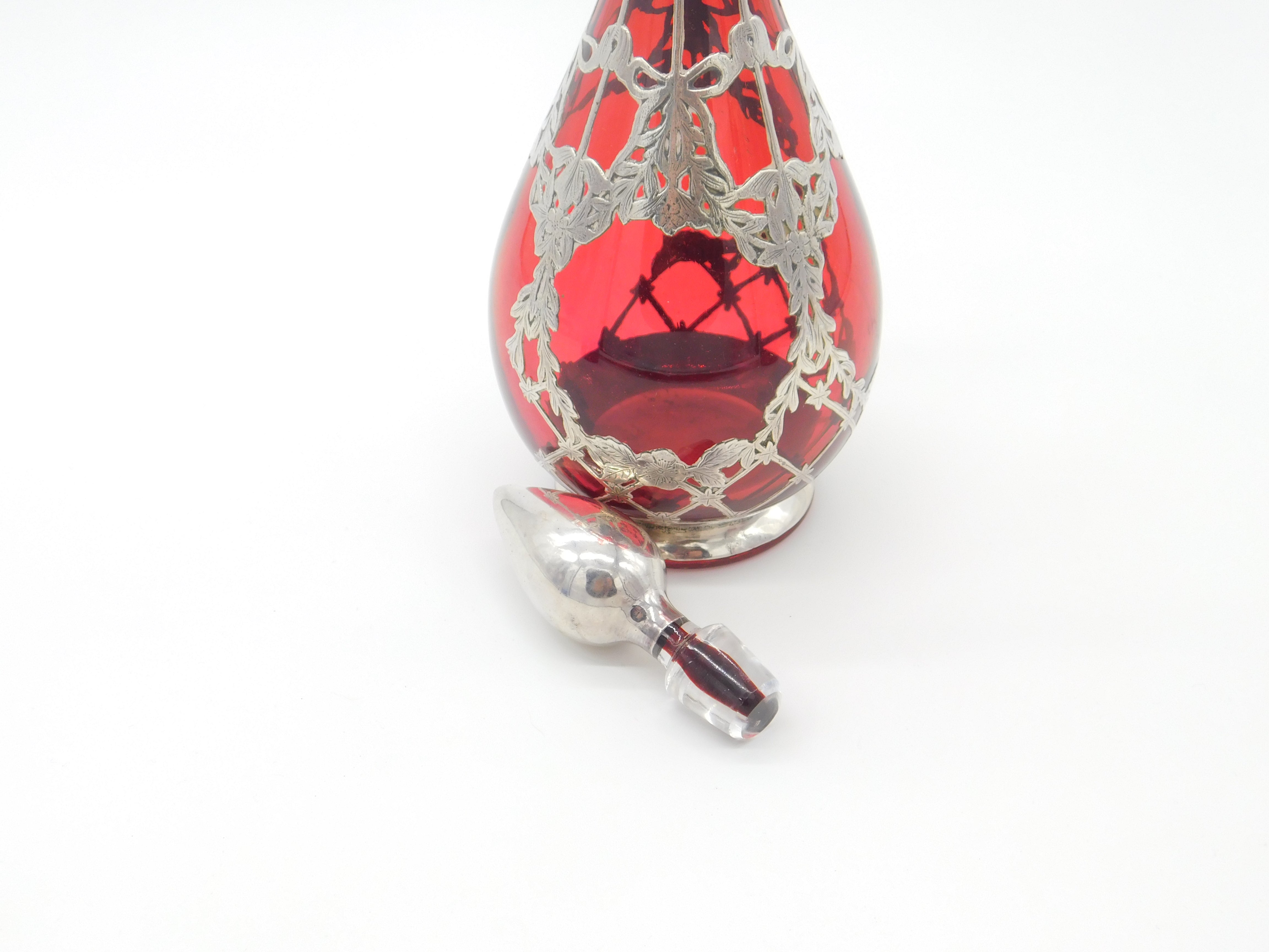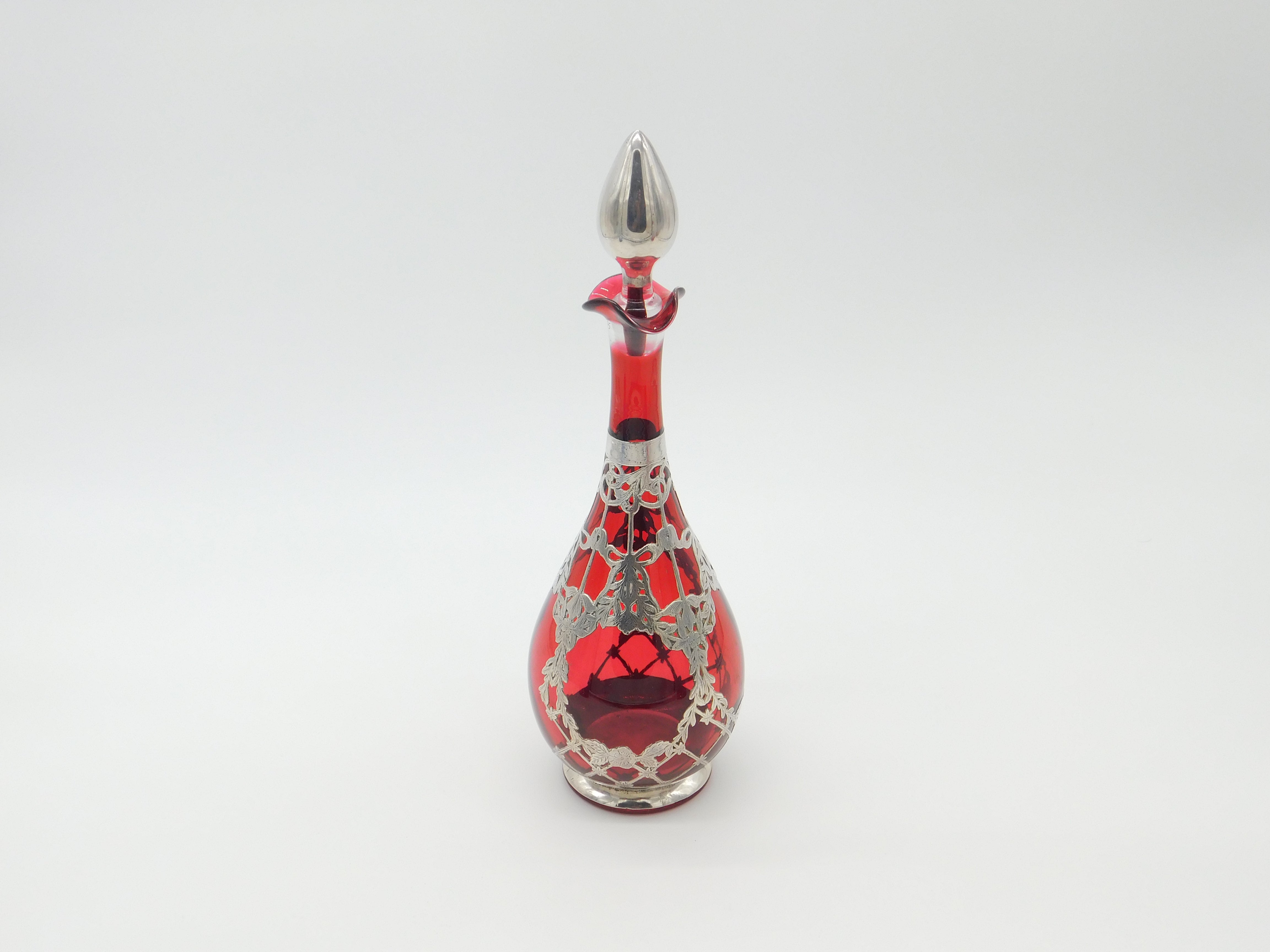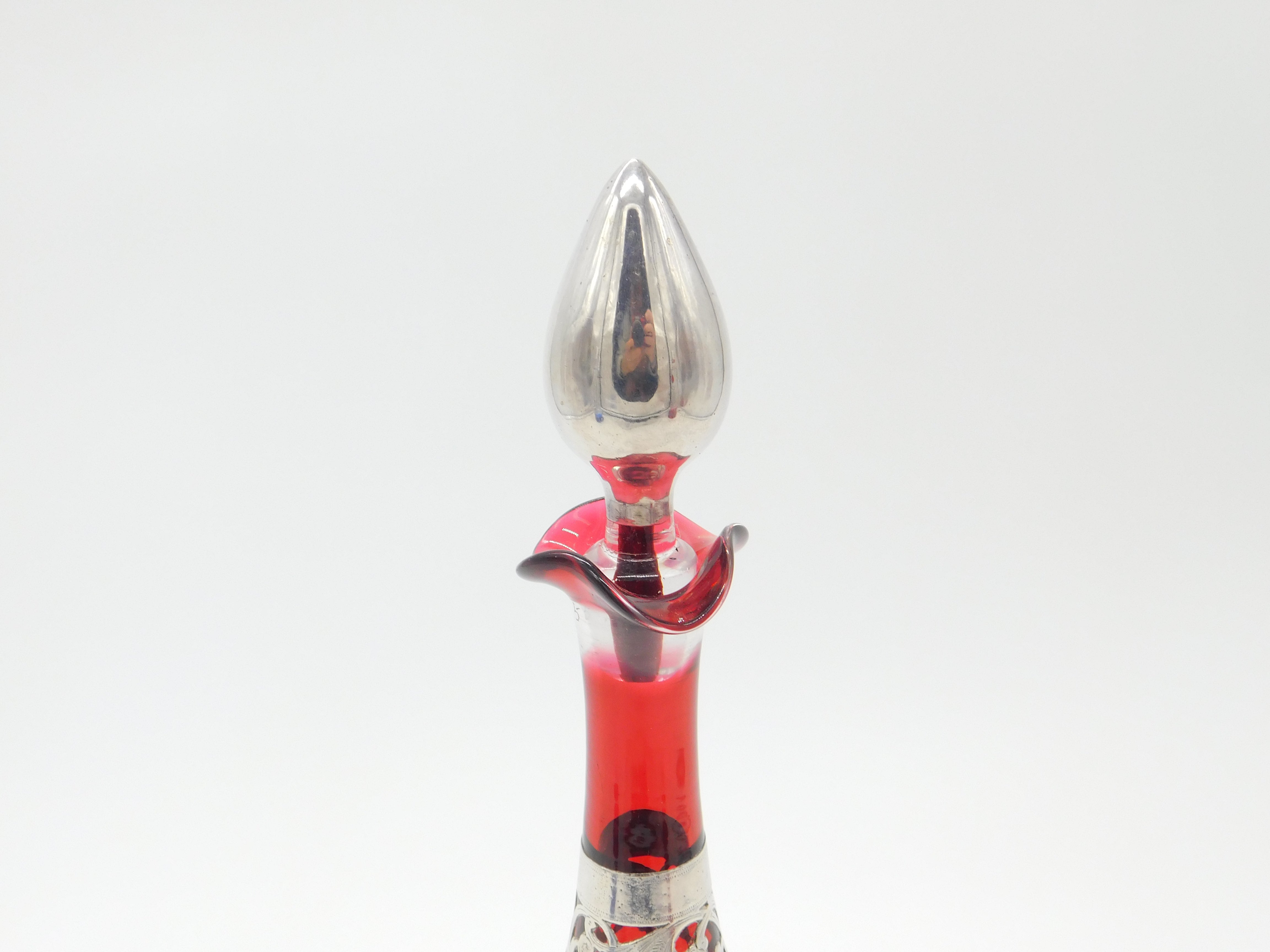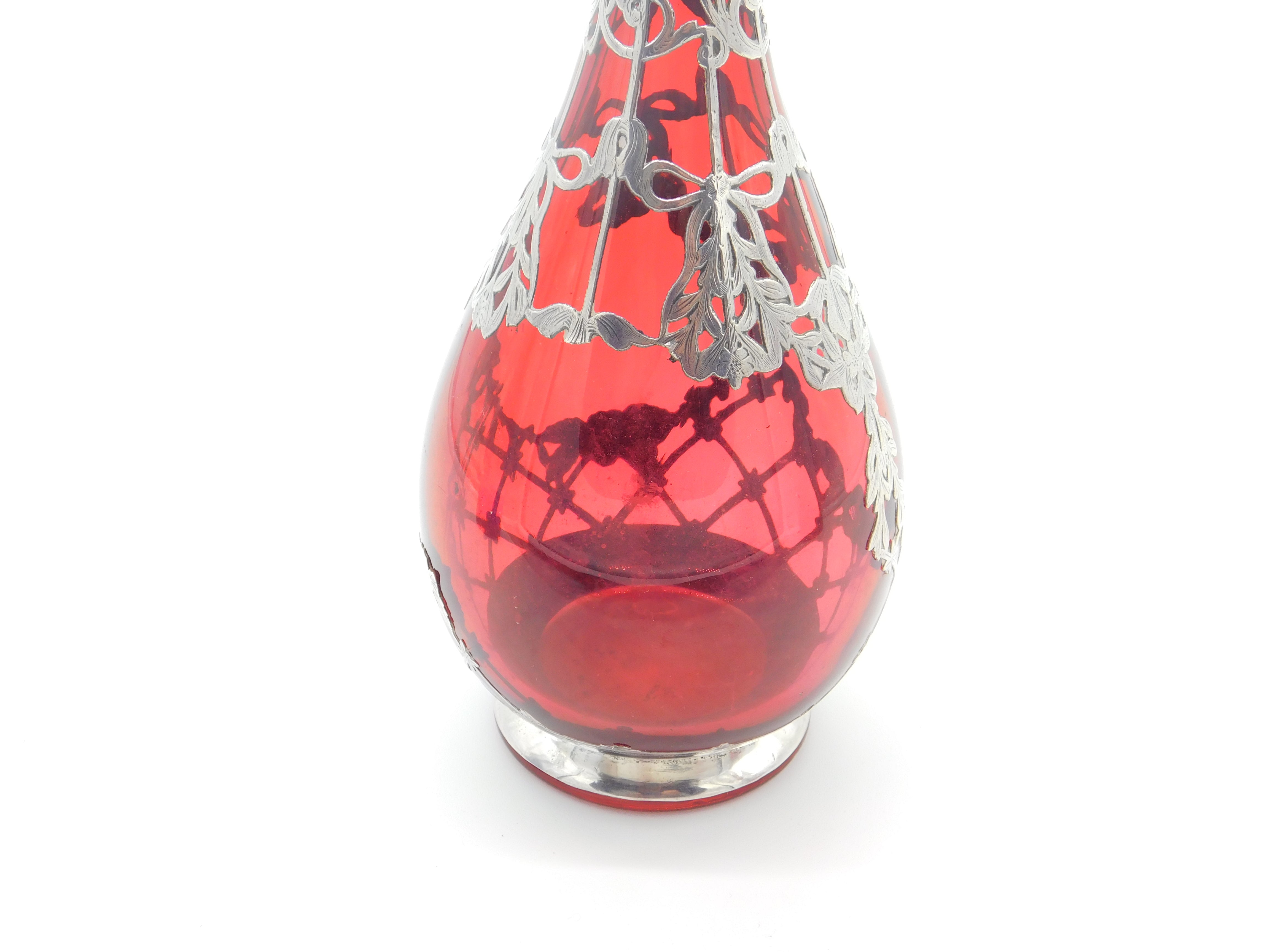 Victorian Cranberry Glass & Sterling Silver Overlaid Decanter Antique 1901 Bham