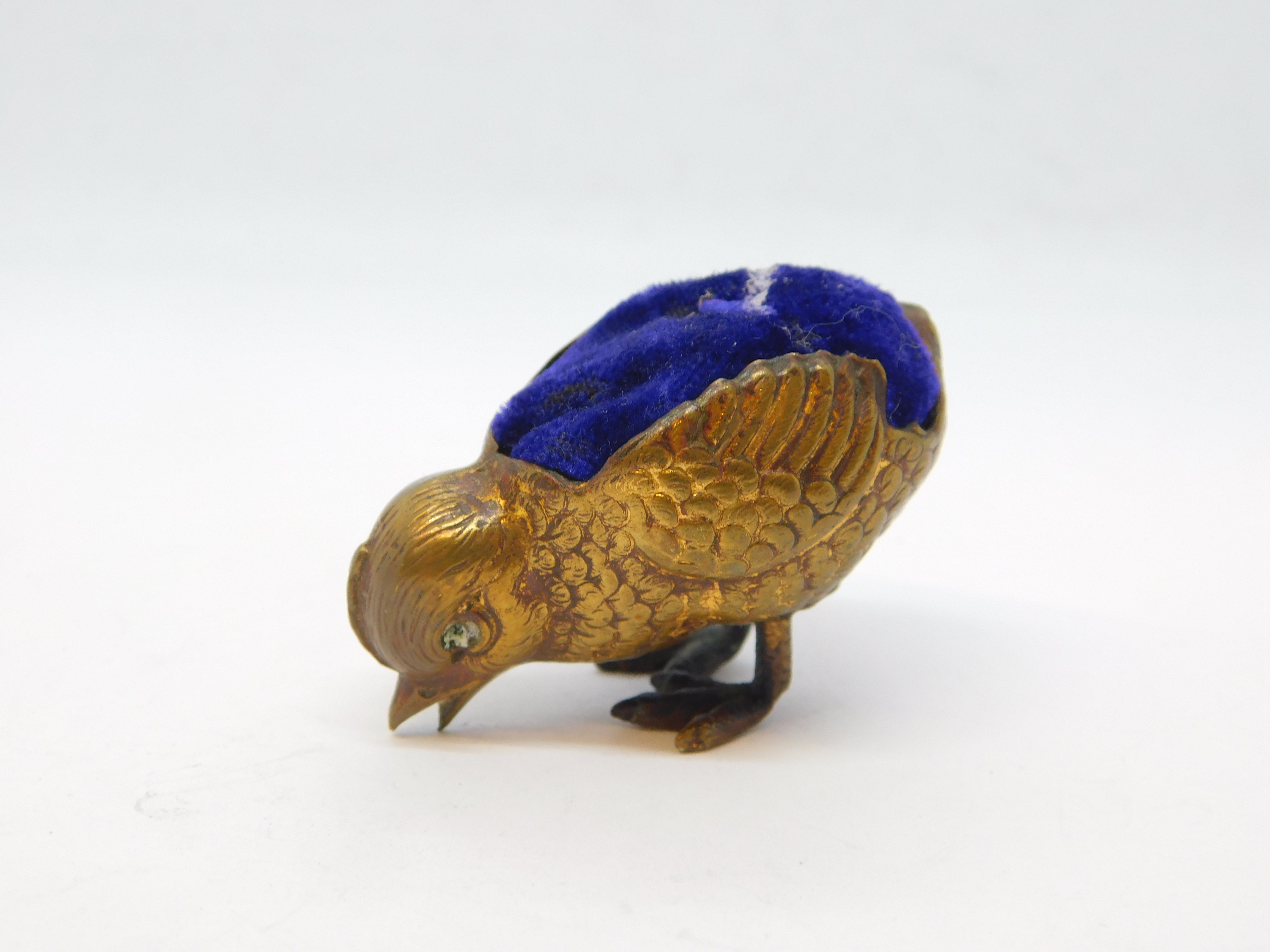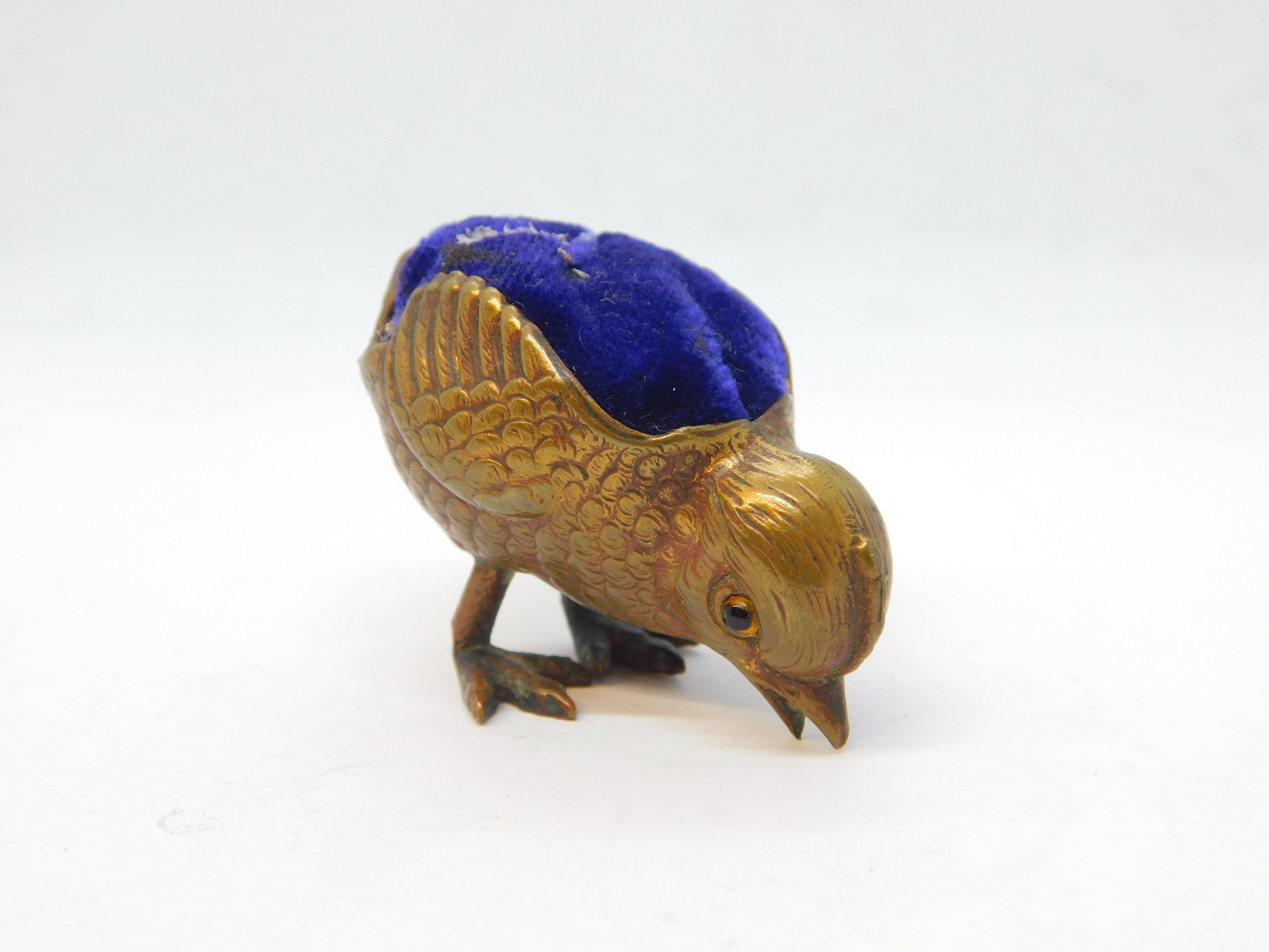 Details: A fantastic and wonderfully designed antique Victorian gilt metal novelty pecking chick form pin cushion c1880, missing one of the eyes please note. This is a wonderful item that would make a perfect gift or addition to any collection.
