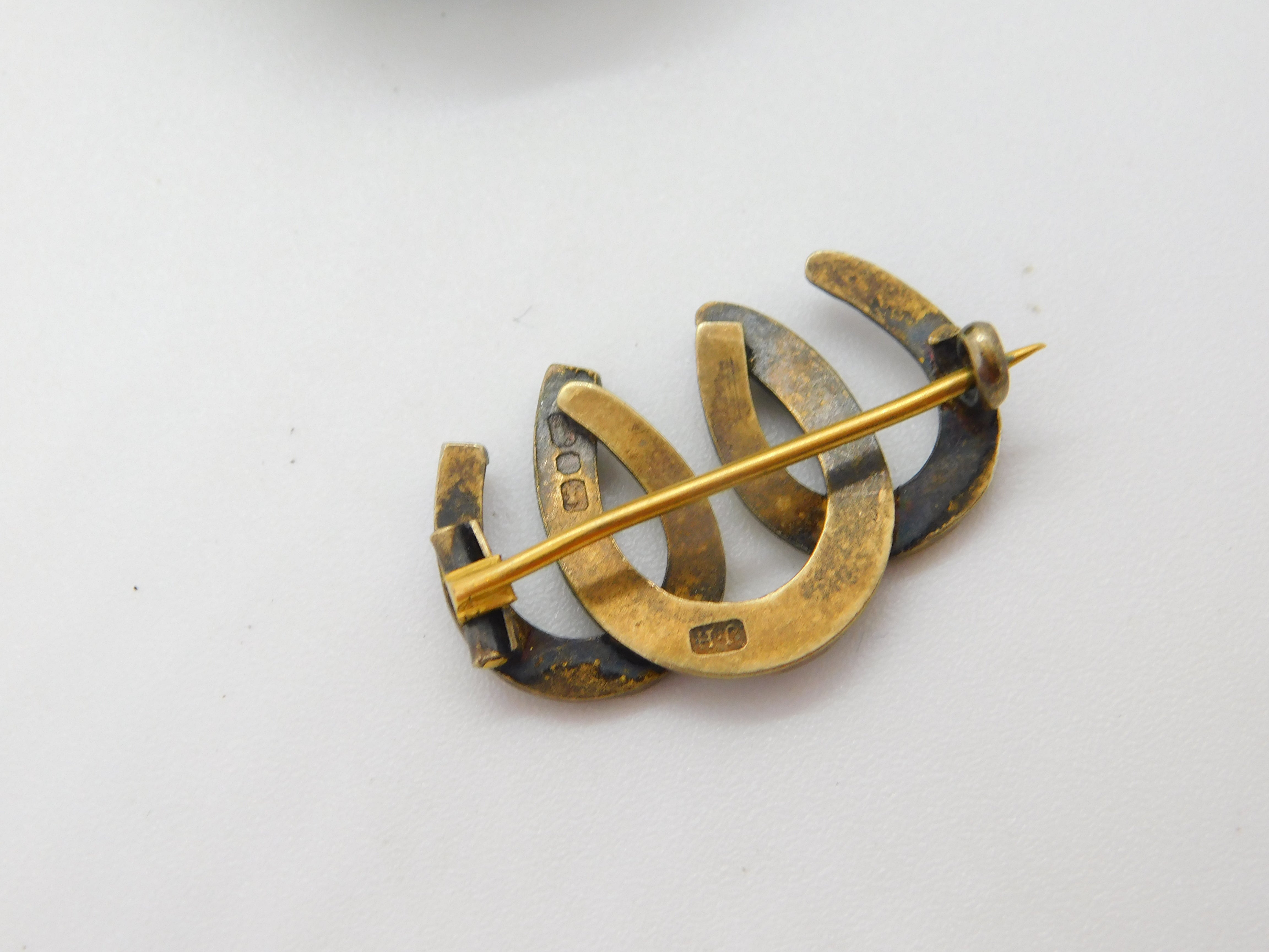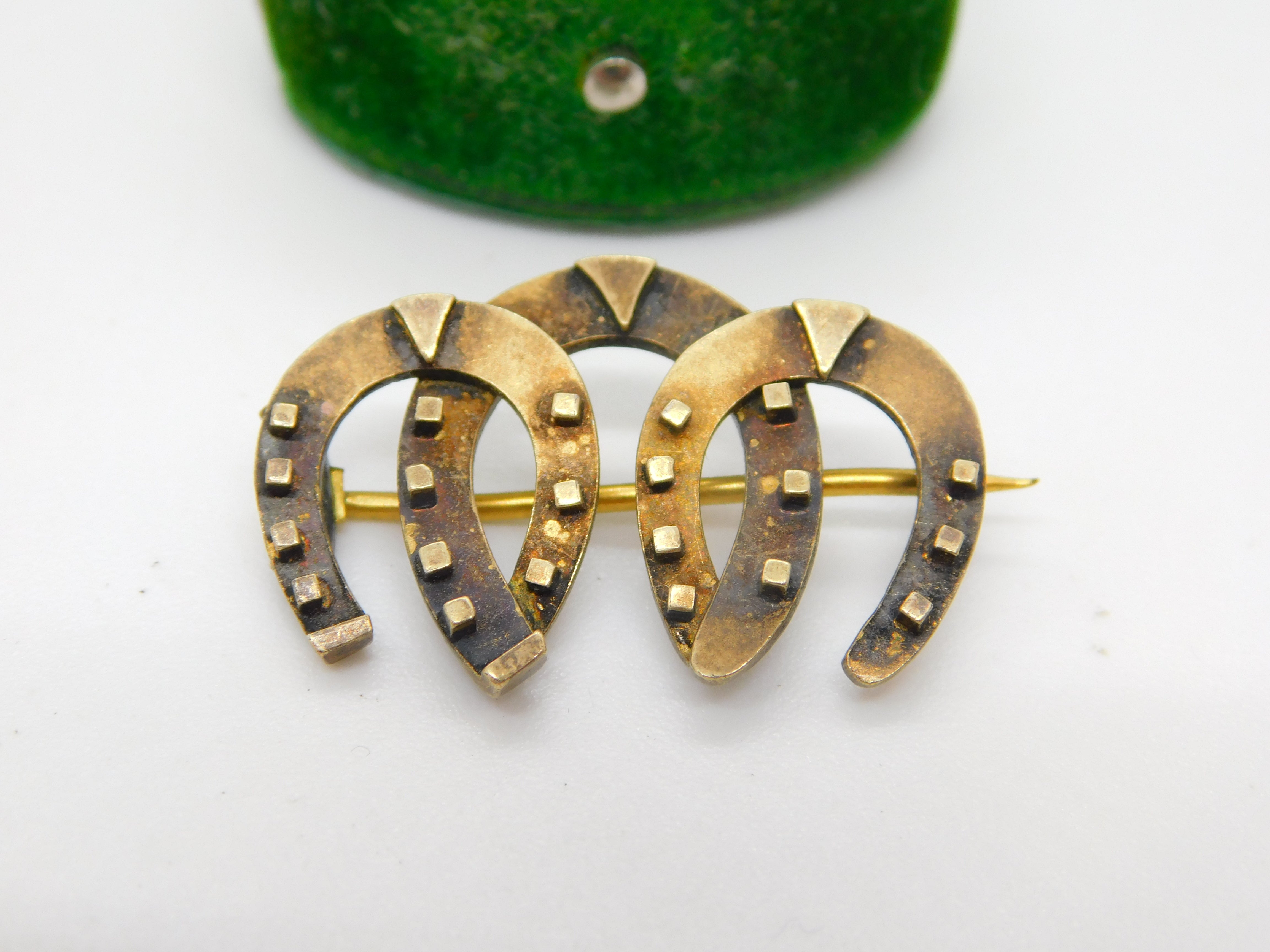 Victorian Gold on Sterling Silver Three Horseshoes Sweetheart Brooch Antique