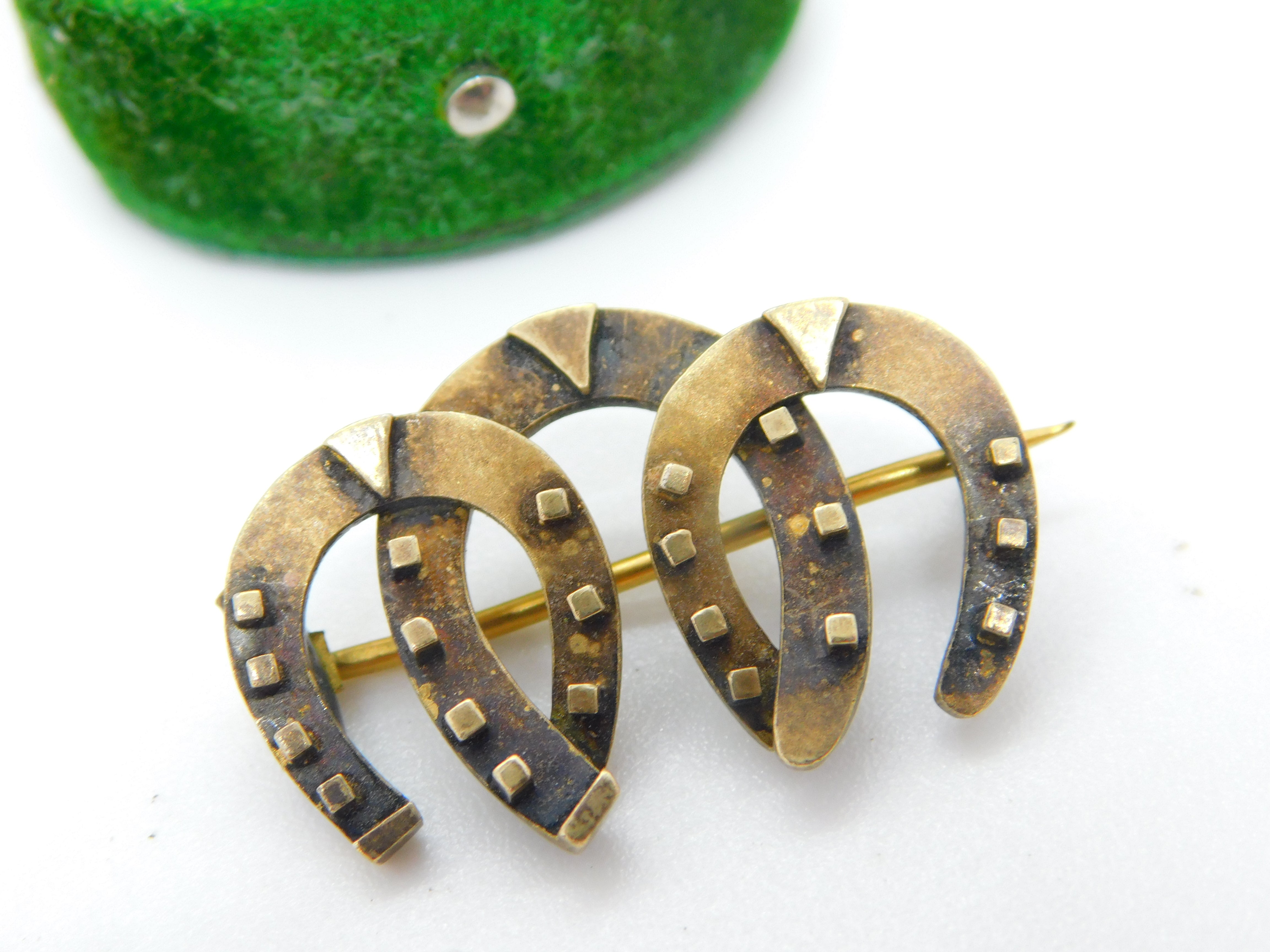 Details: A fantastic and wonderfully designed antique Victorian gold on sterling silver stock pin or brooch depicting three horseshoes with charming detailing hallmarked London c1890 to the reverse. This is a wonderful item that would make a perfect gift or addition to any collection. The BOX pictured is for PRESENTATION ONLY and is NOT included in the listings but used to frame the pictures unless specifically stated otherwise.