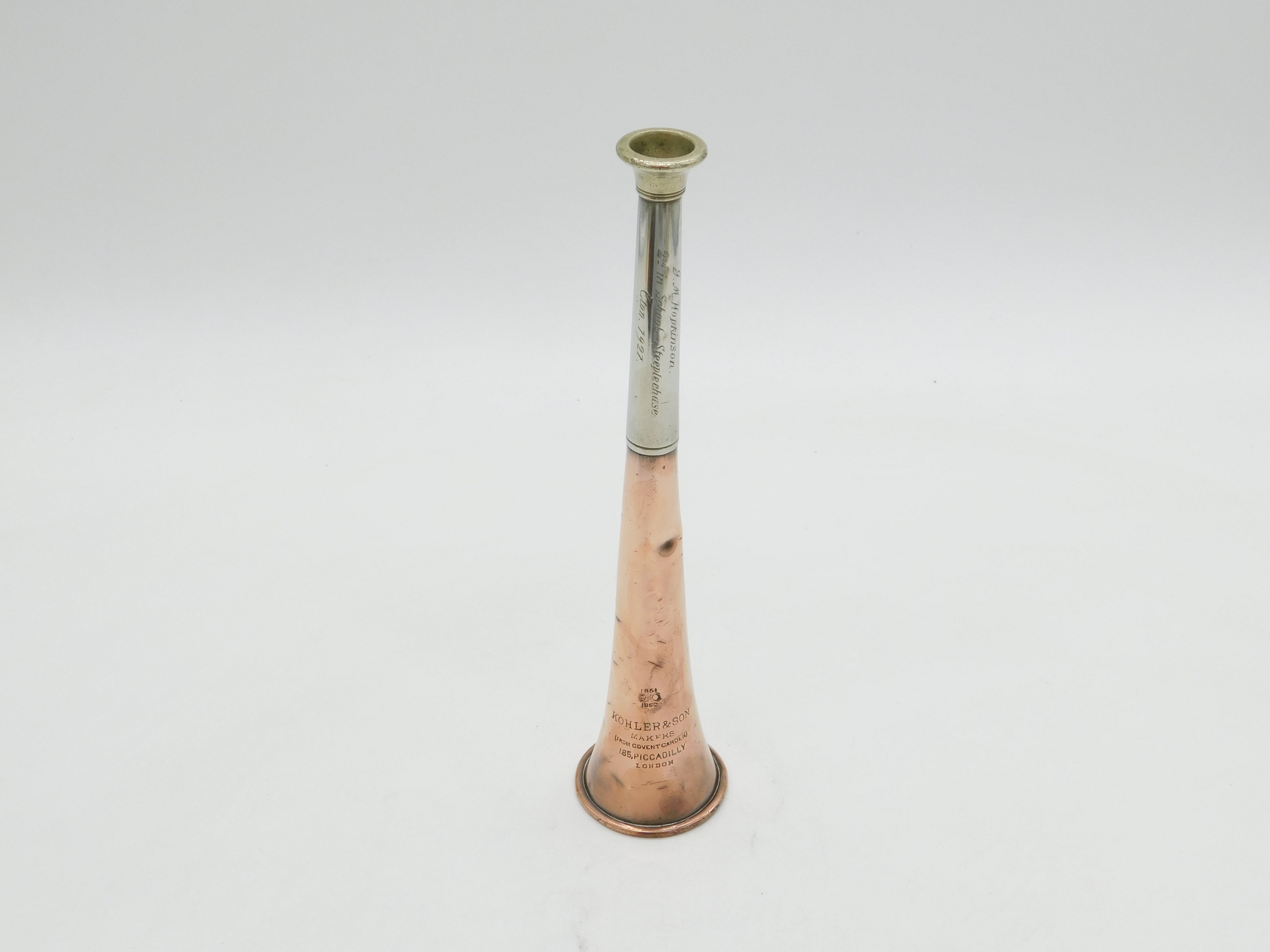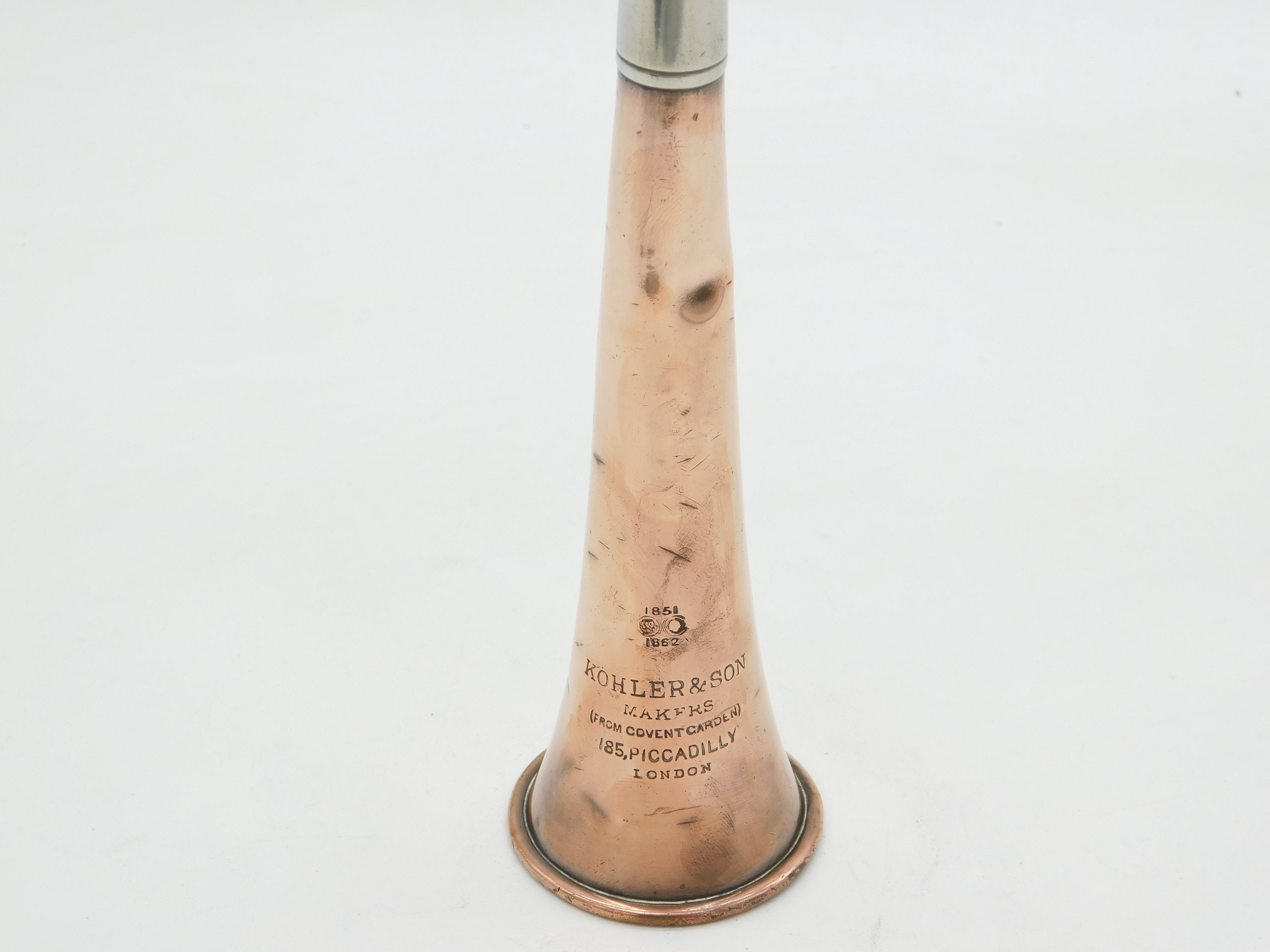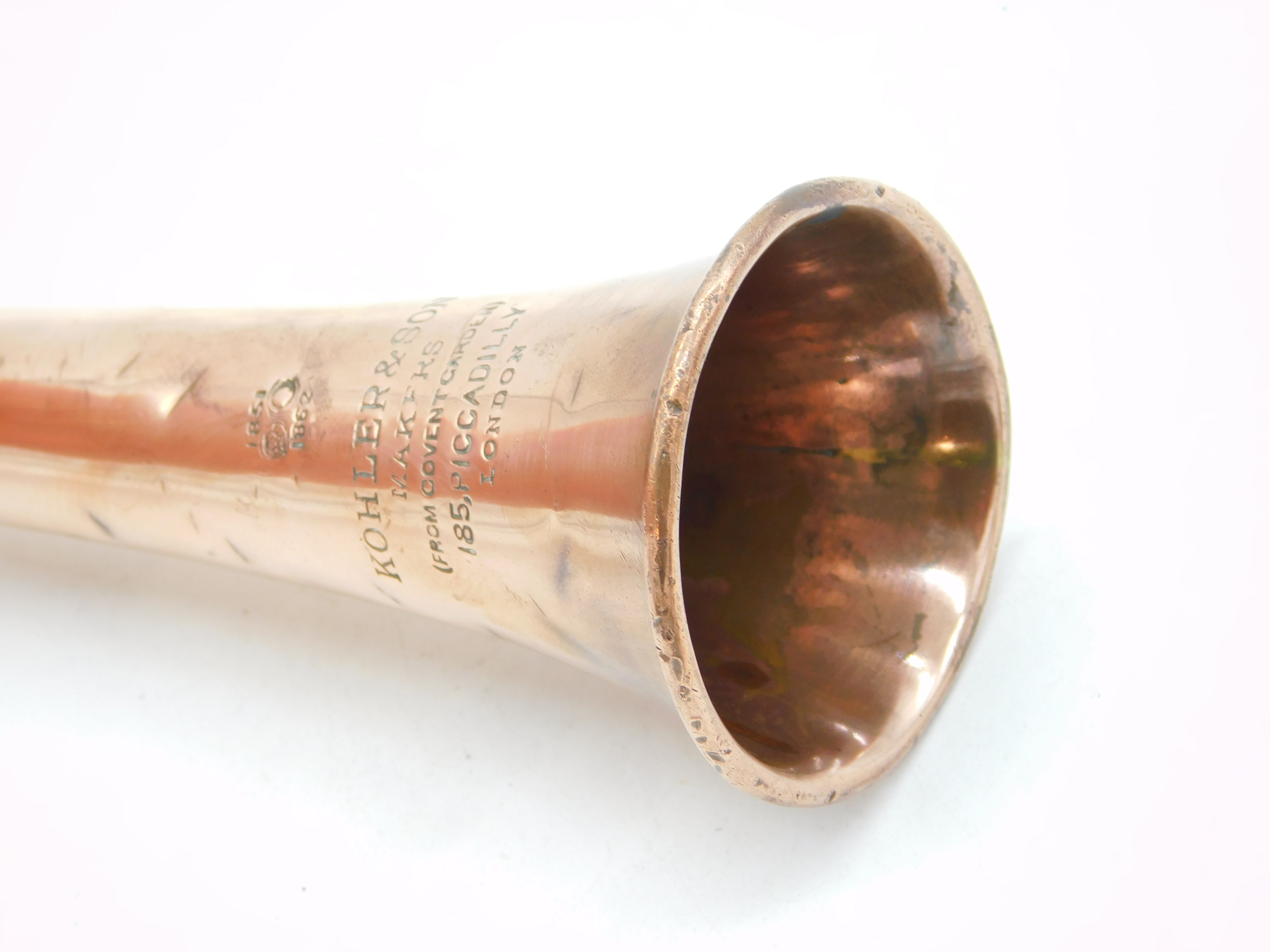 Details: A fantastic and wonderfully designed antique Victorian copper, silver plate & brass hunting horn by Köhler & Son later Swaine Adeney, dated 1851-1862 with makers marks to the base, later engraved with Eton College inscription to the silver plated area for a Steeplechase competition in 1921. This is a wonderful item that would make a perfect gift or addition to any collection.