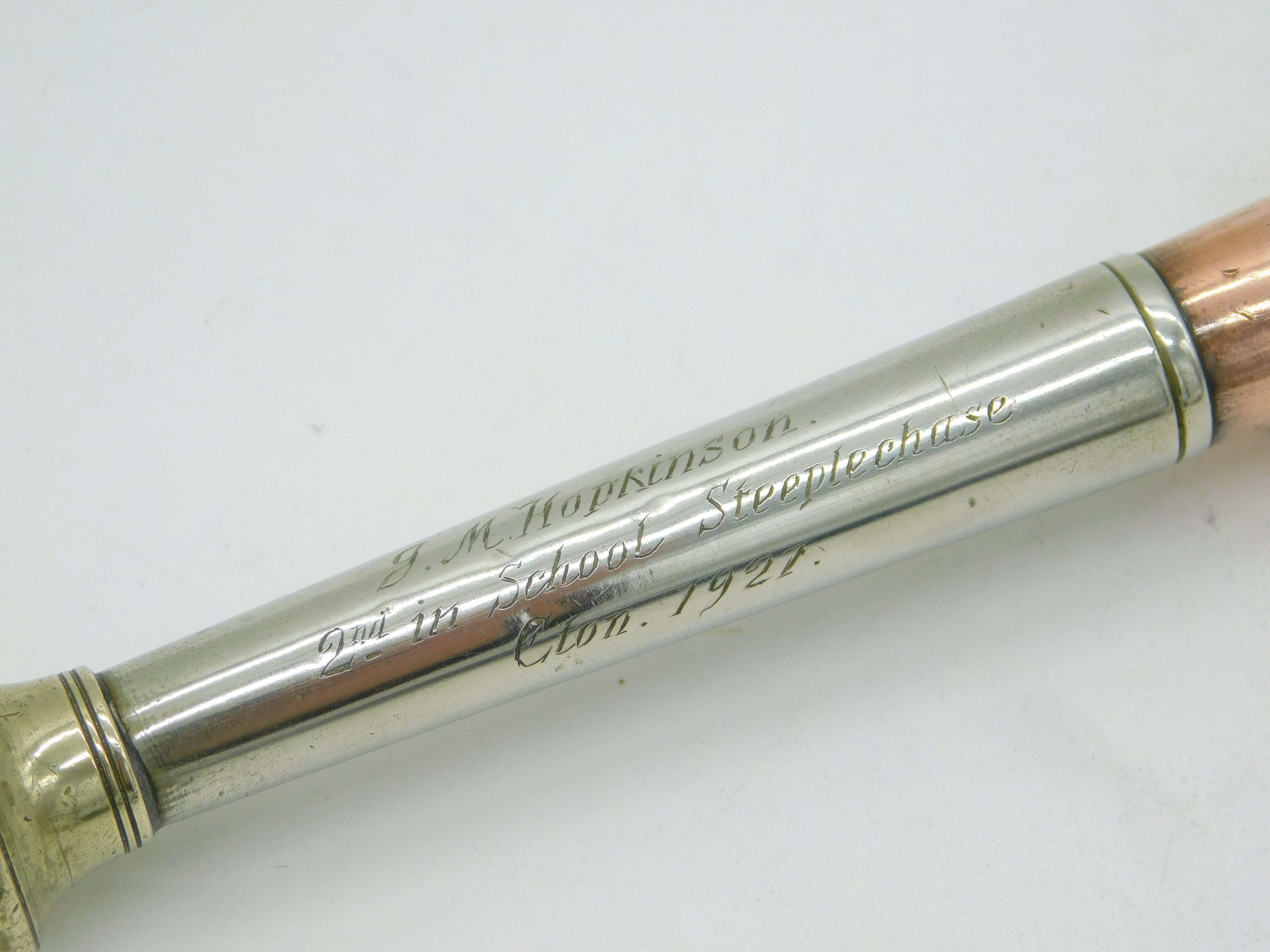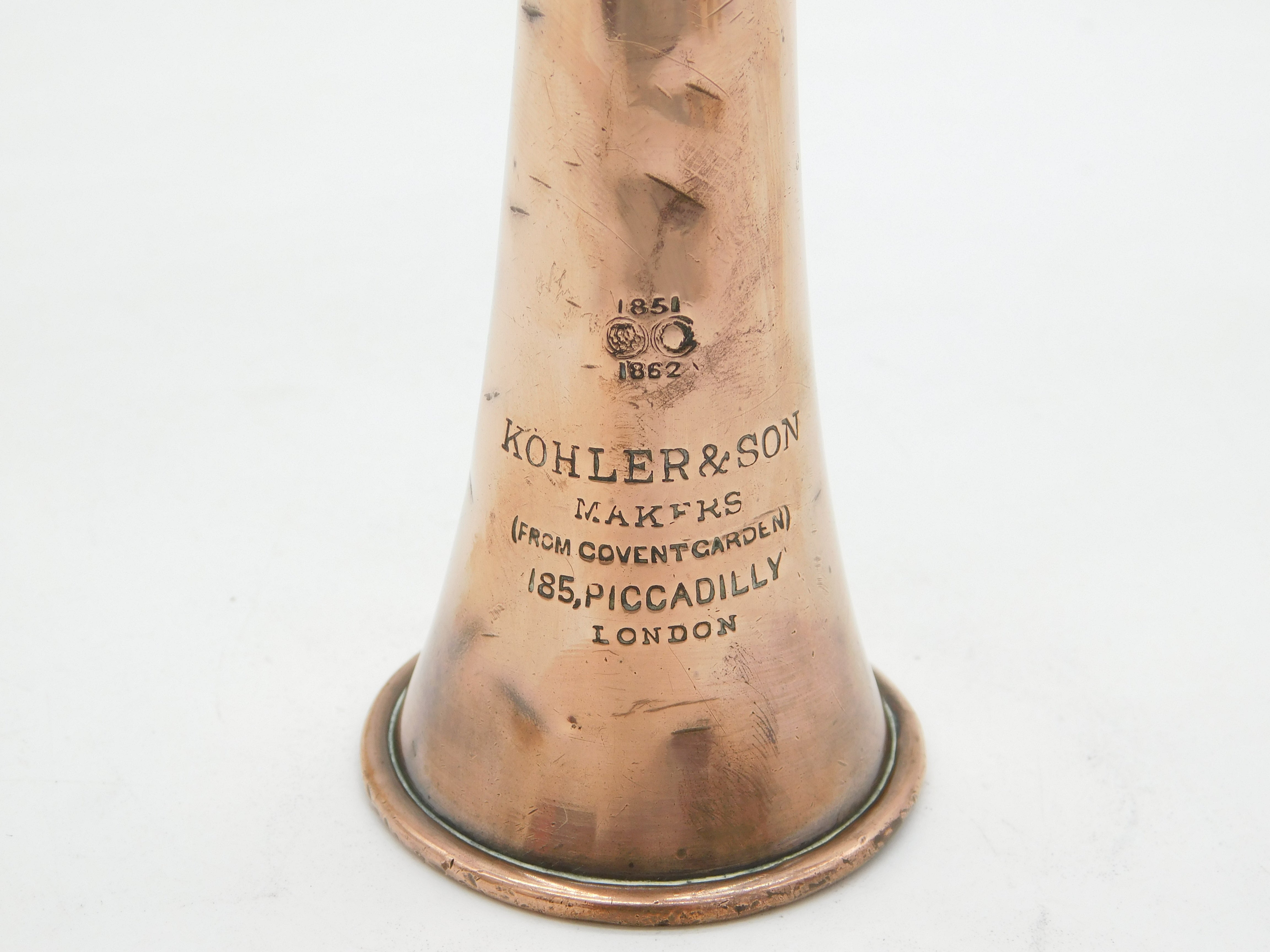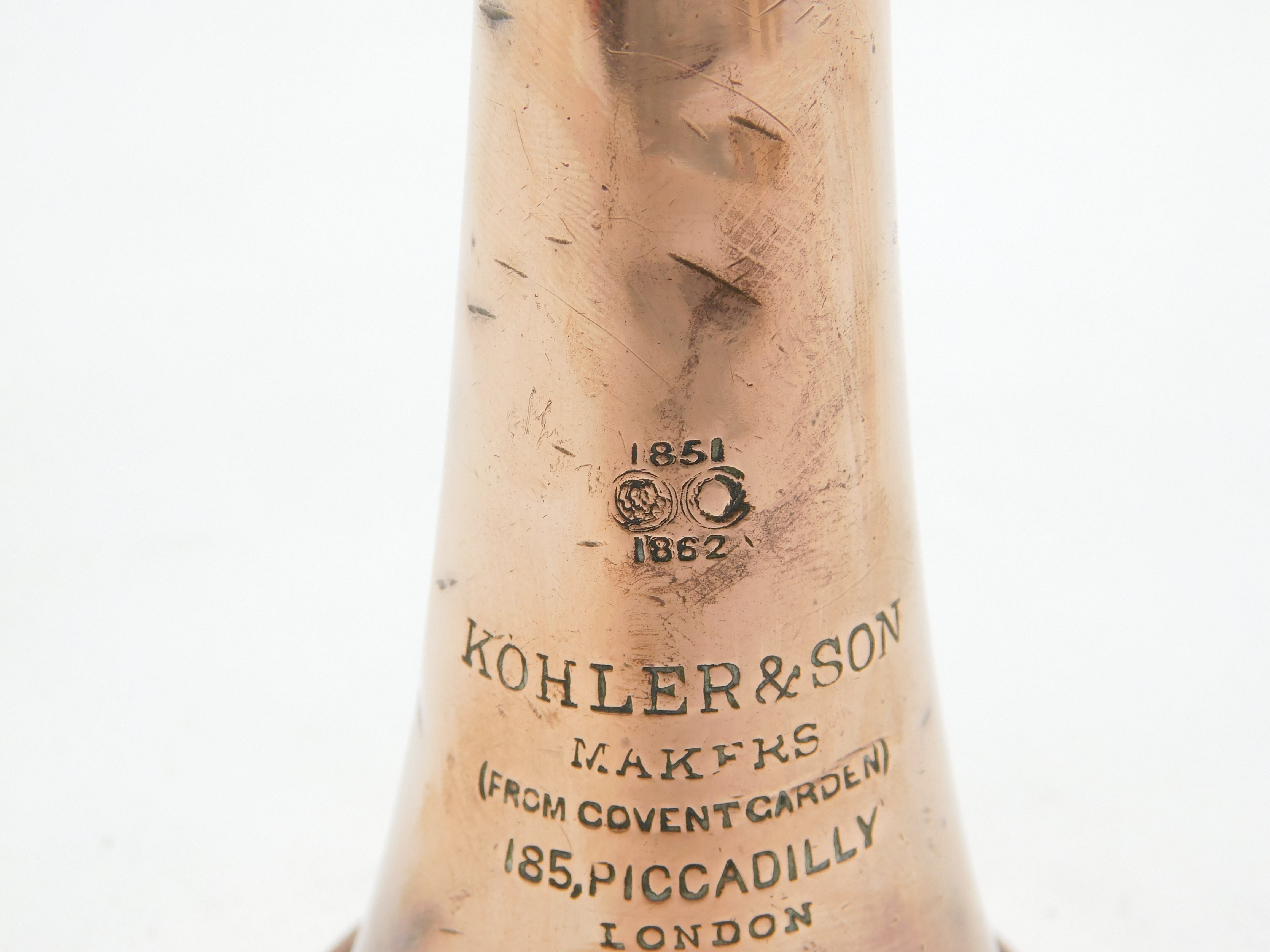 Details: A fantastic and wonderfully designed antique Victorian copper, silver plate & brass hunting horn by Köhler & Son later Swaine Adeney, dated 1851-1862 with makers marks to the base, later engraved with Eton College inscription to the silver plated area for a Steeplechase competition in 1921. This is a wonderful item that would make a perfect gift or addition to any collection.