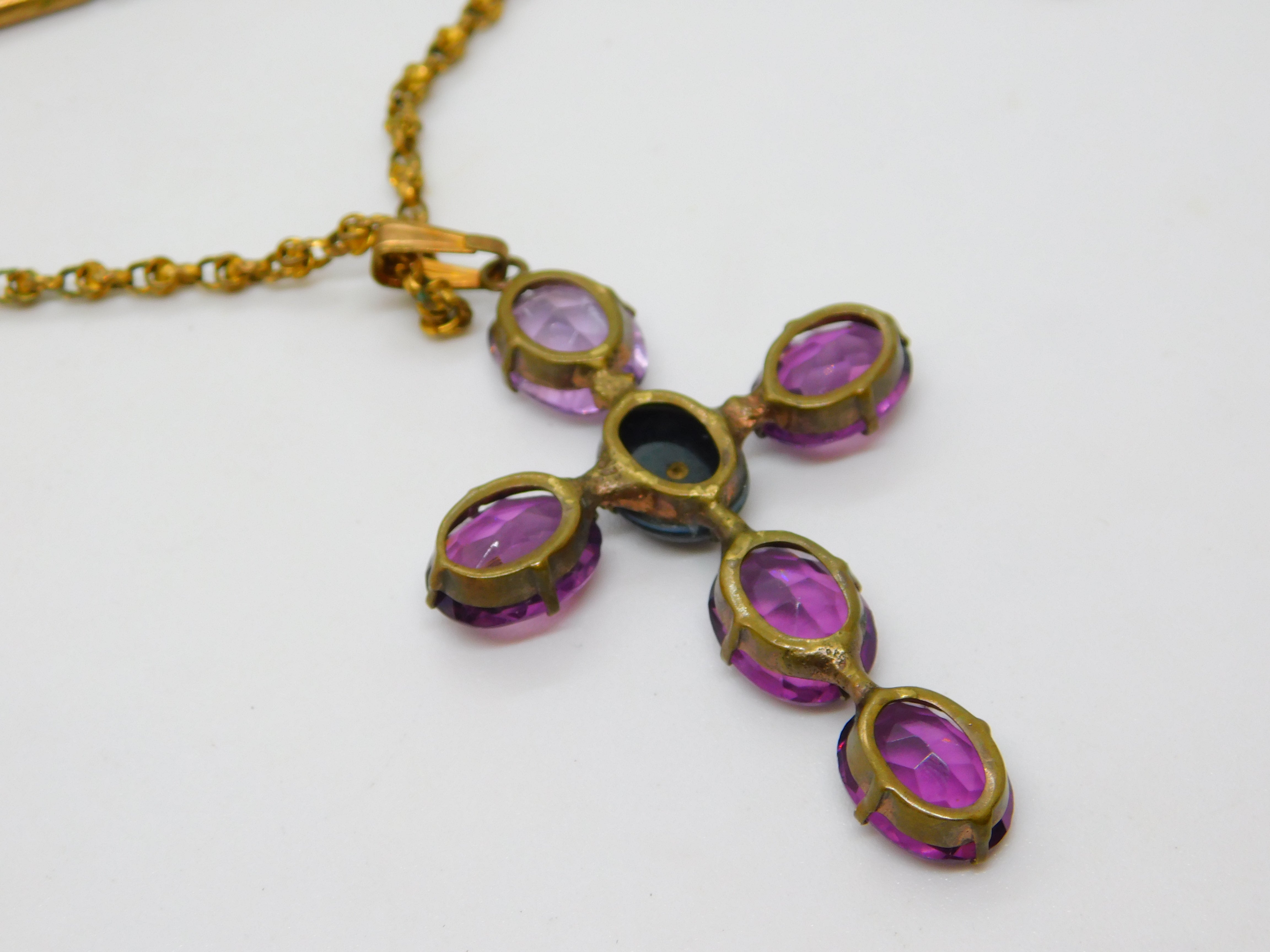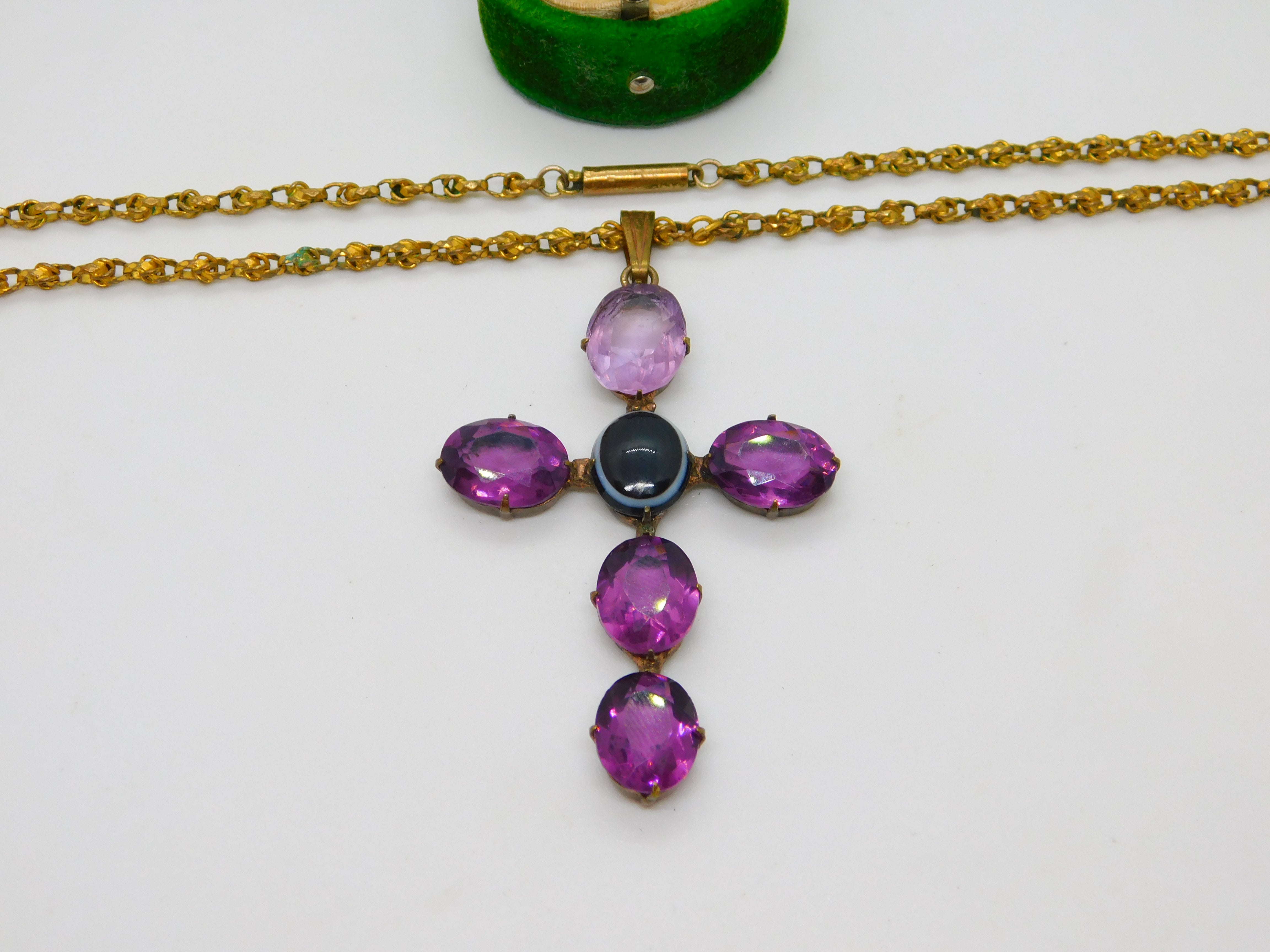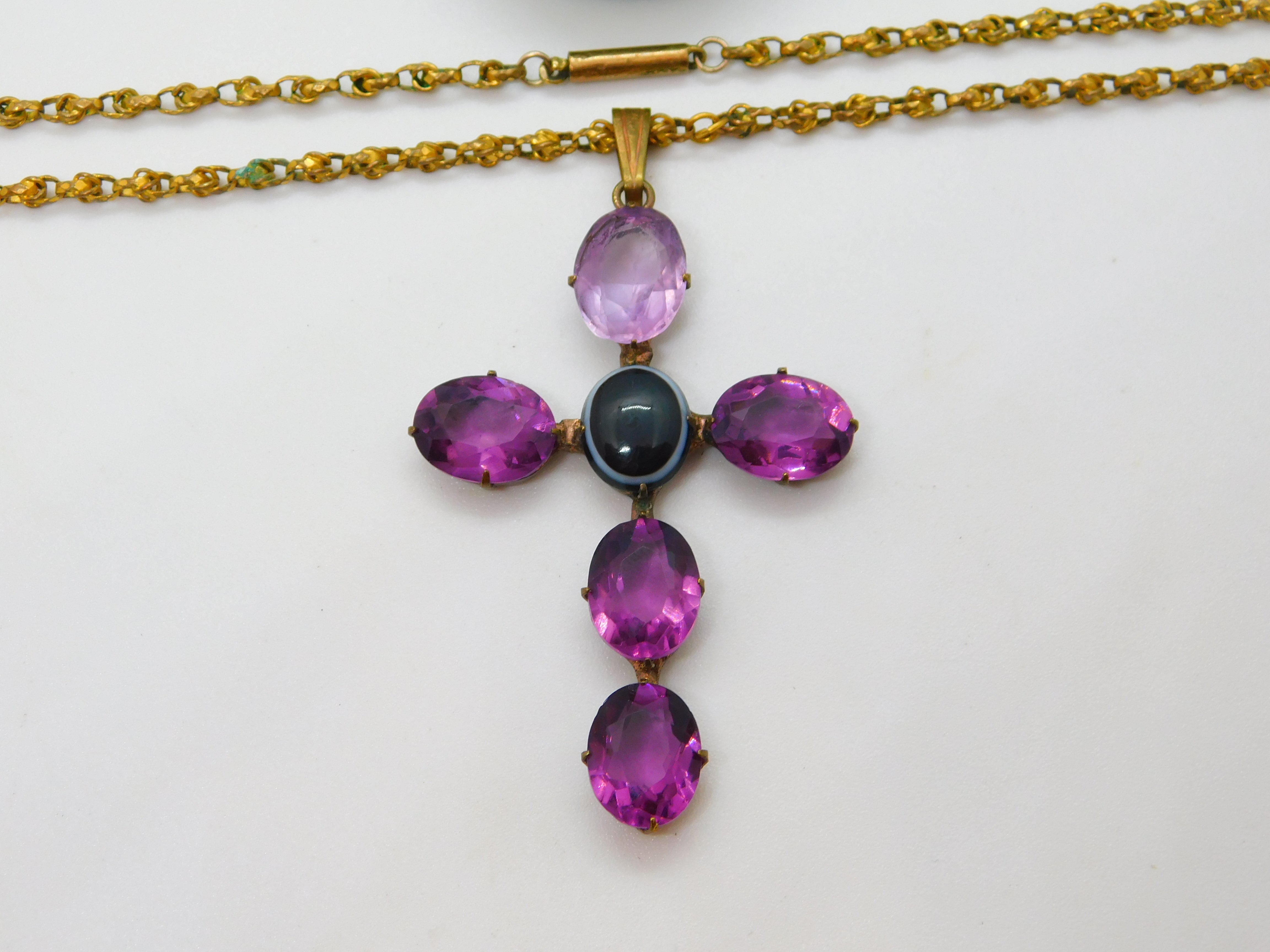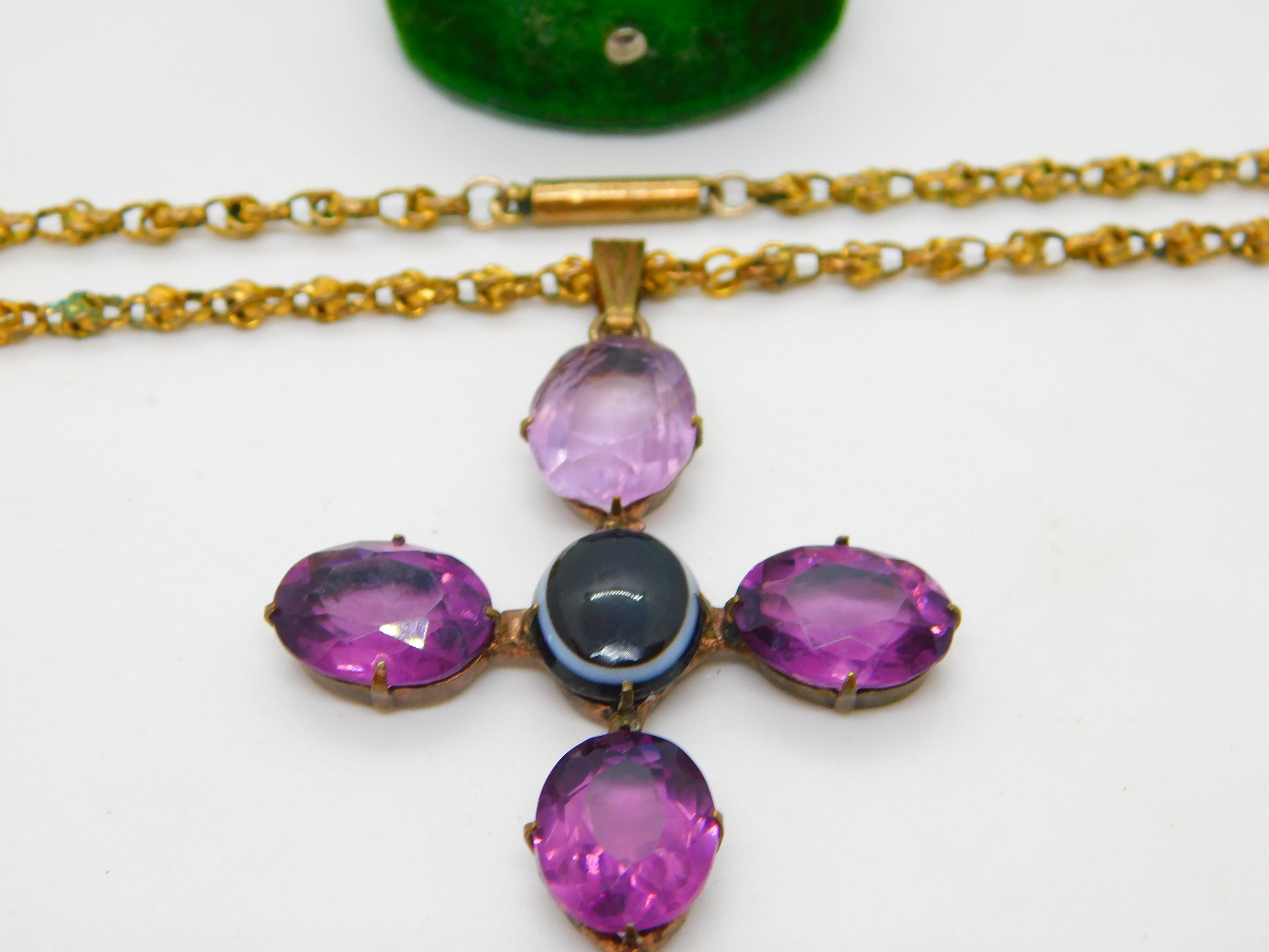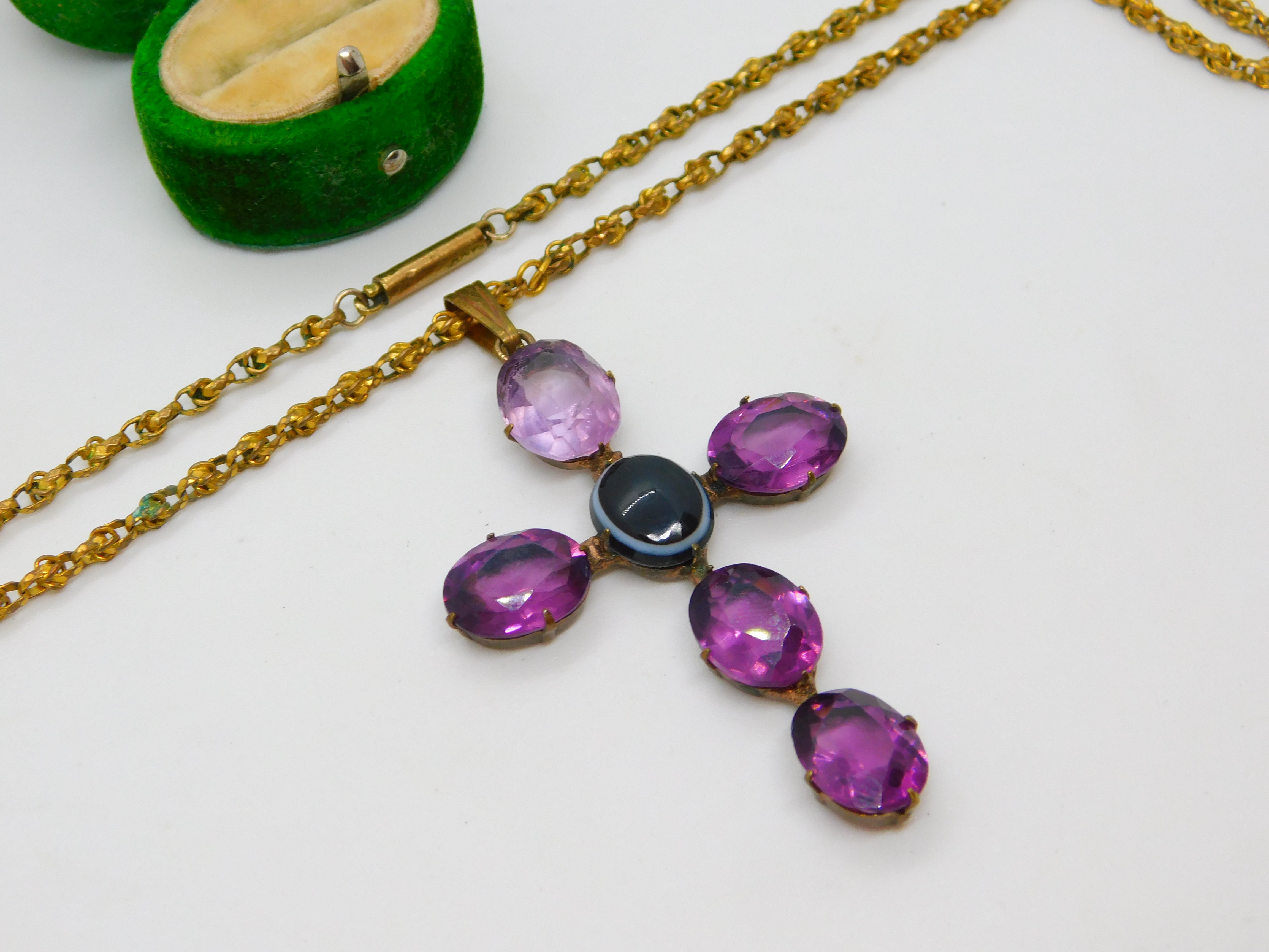 Victorian Large Pinchbeck Amethyst & Banded Agate Cross Necklace Antique c1860