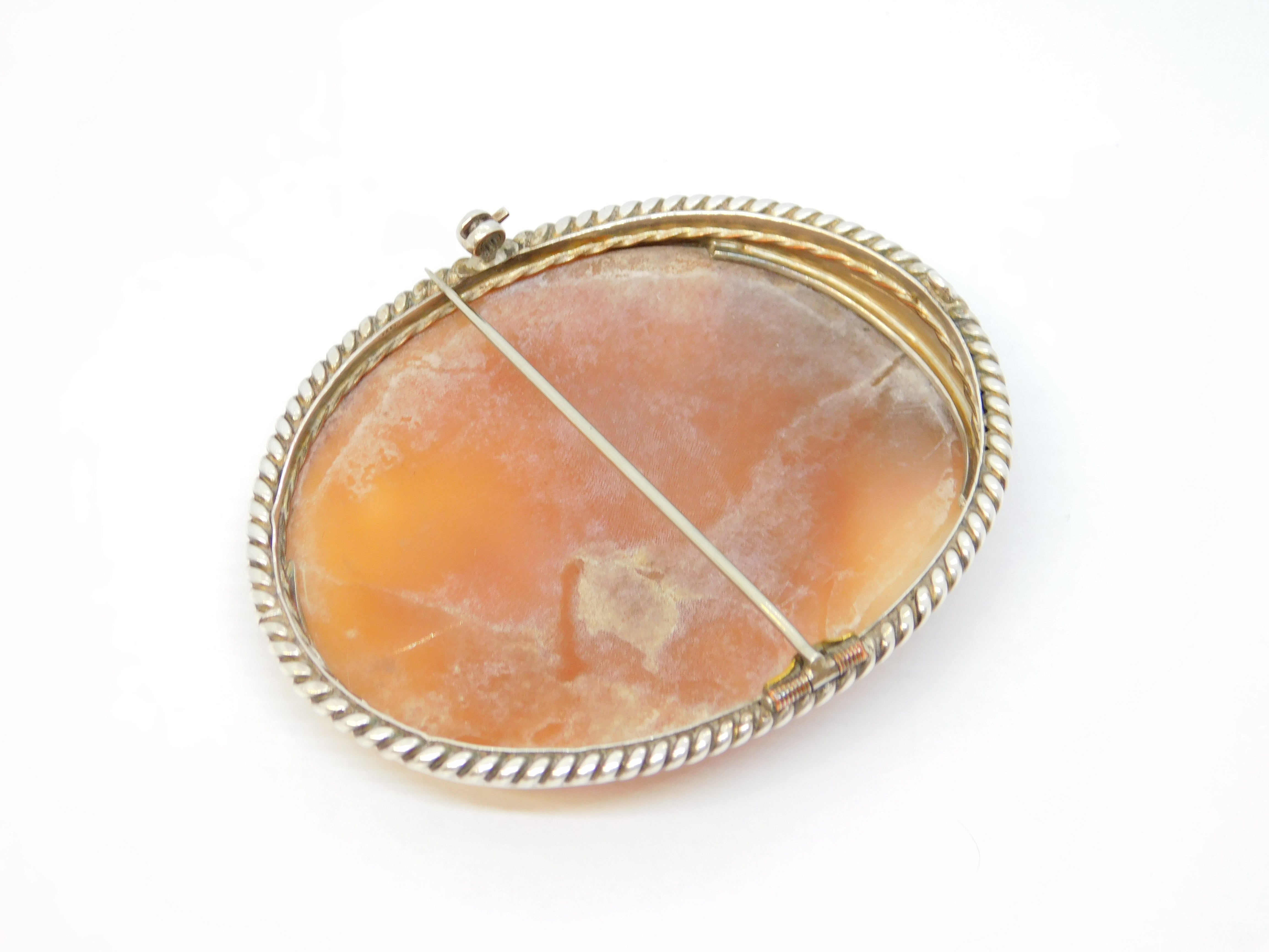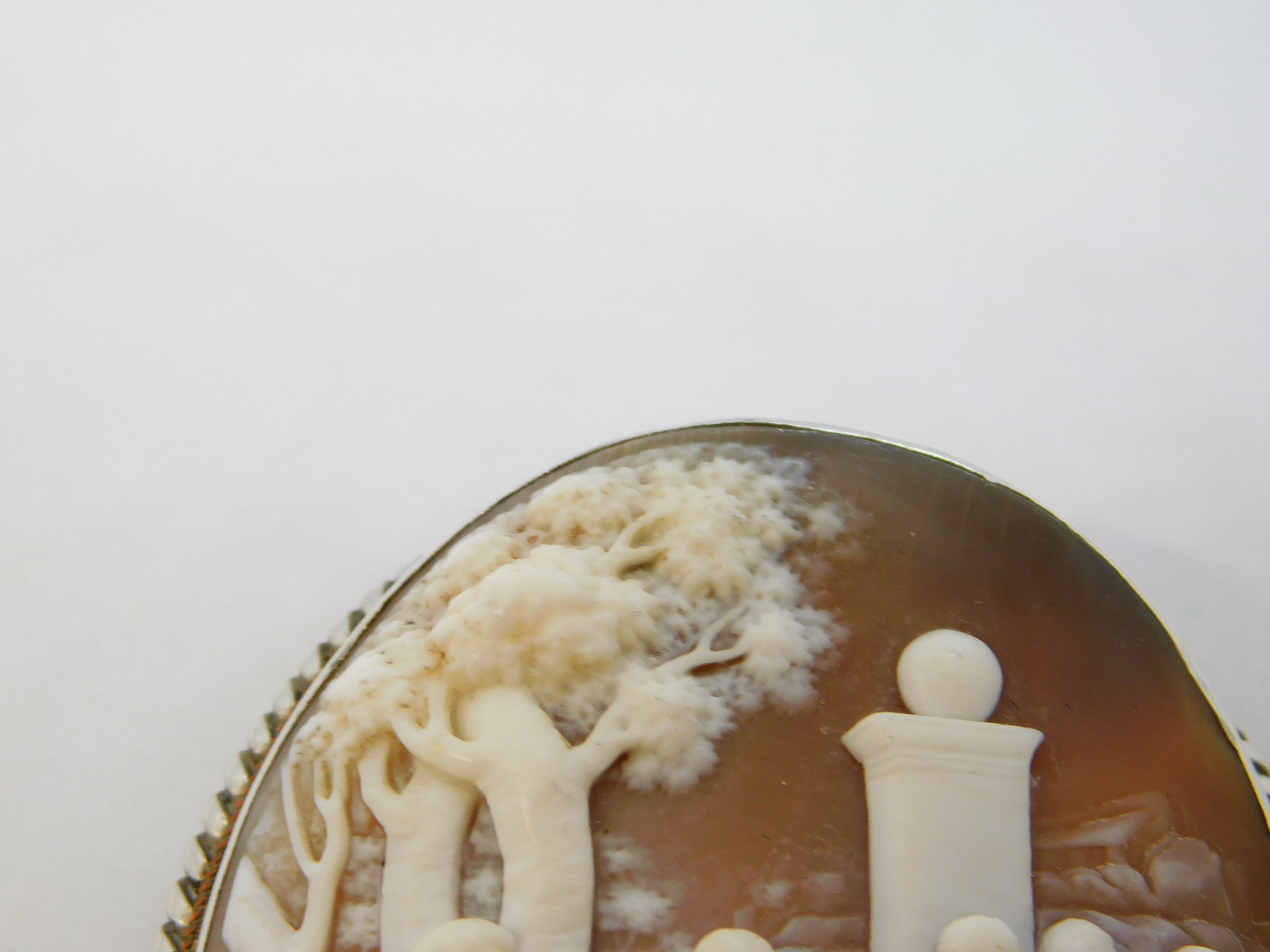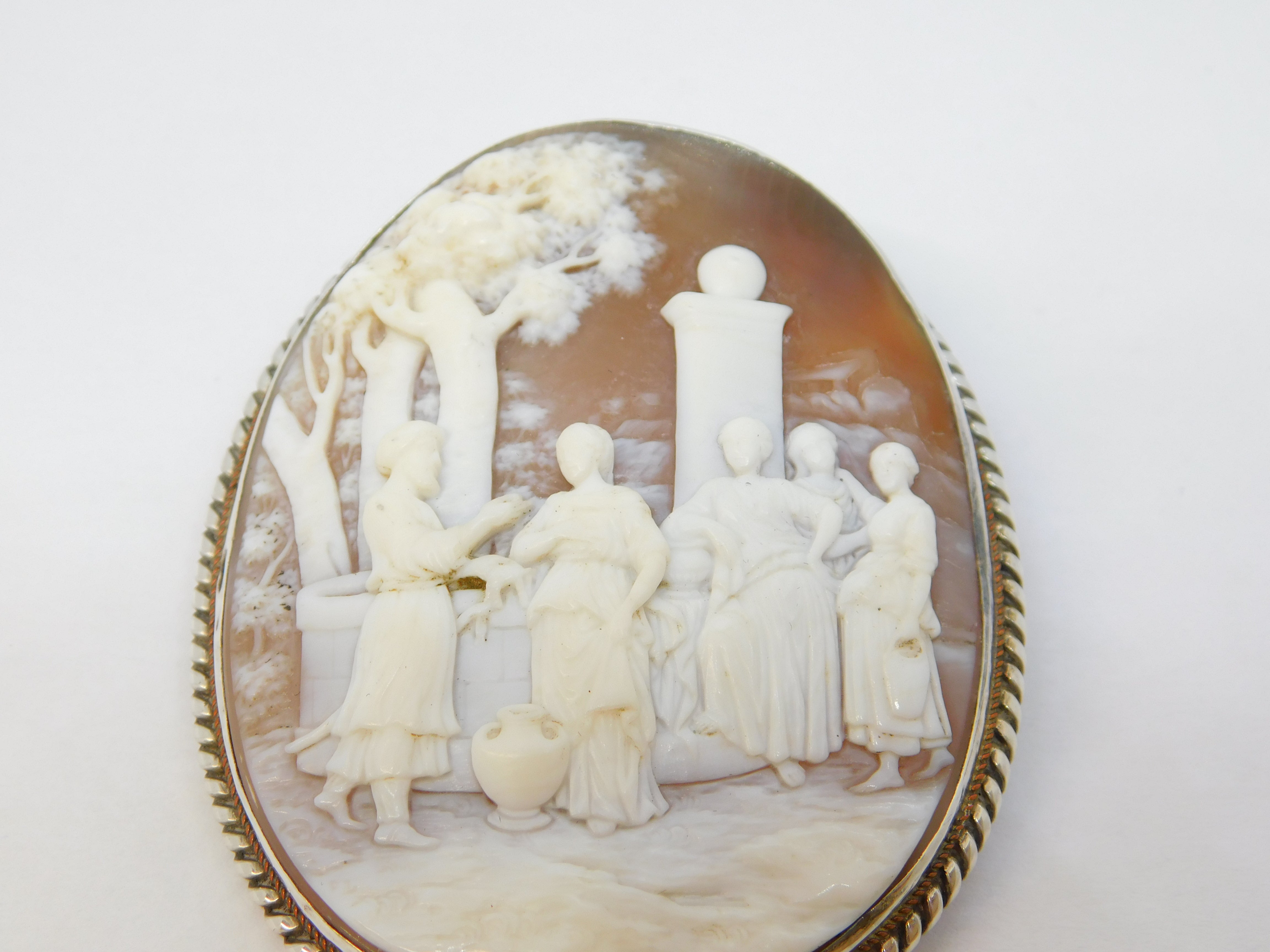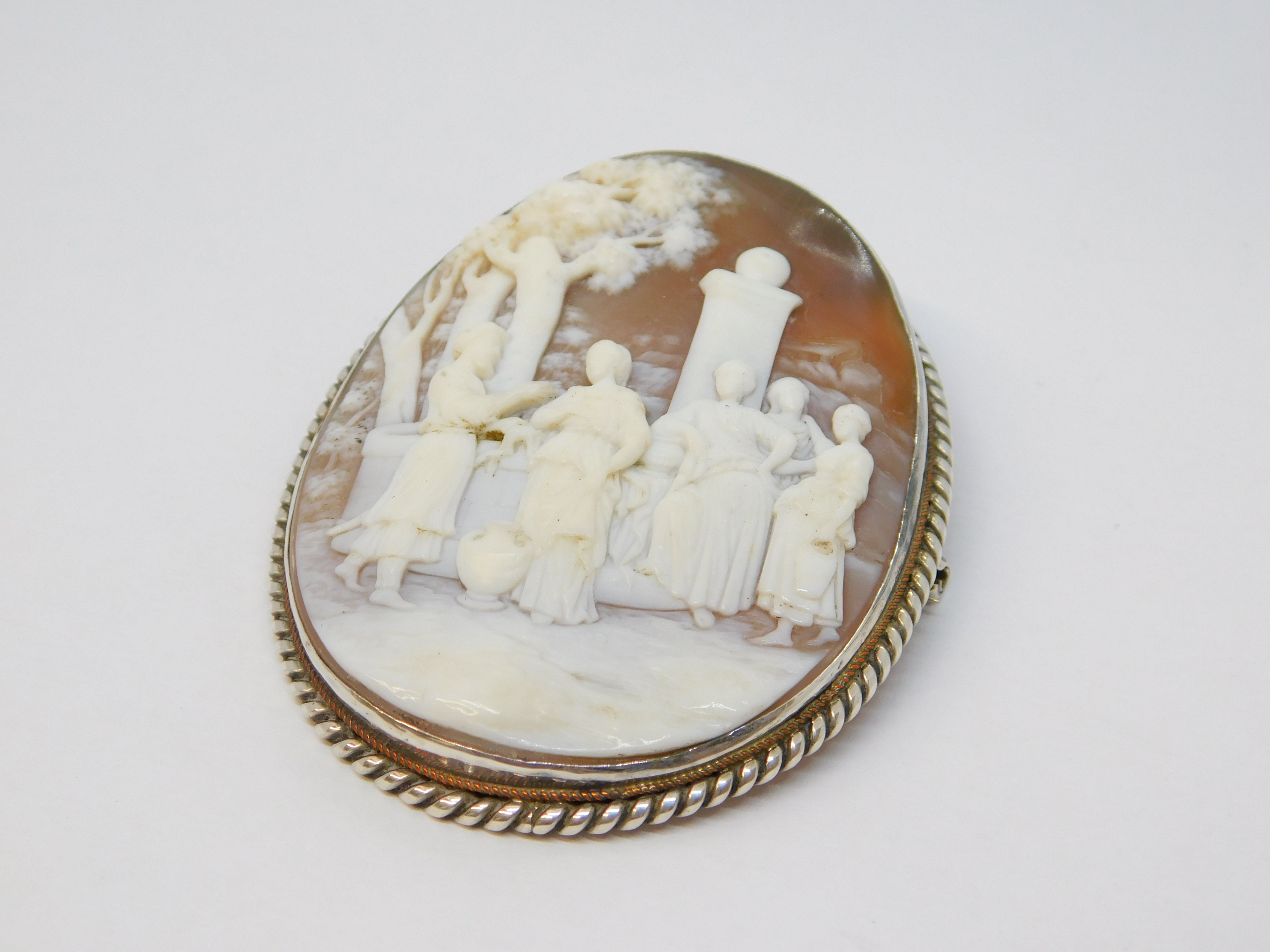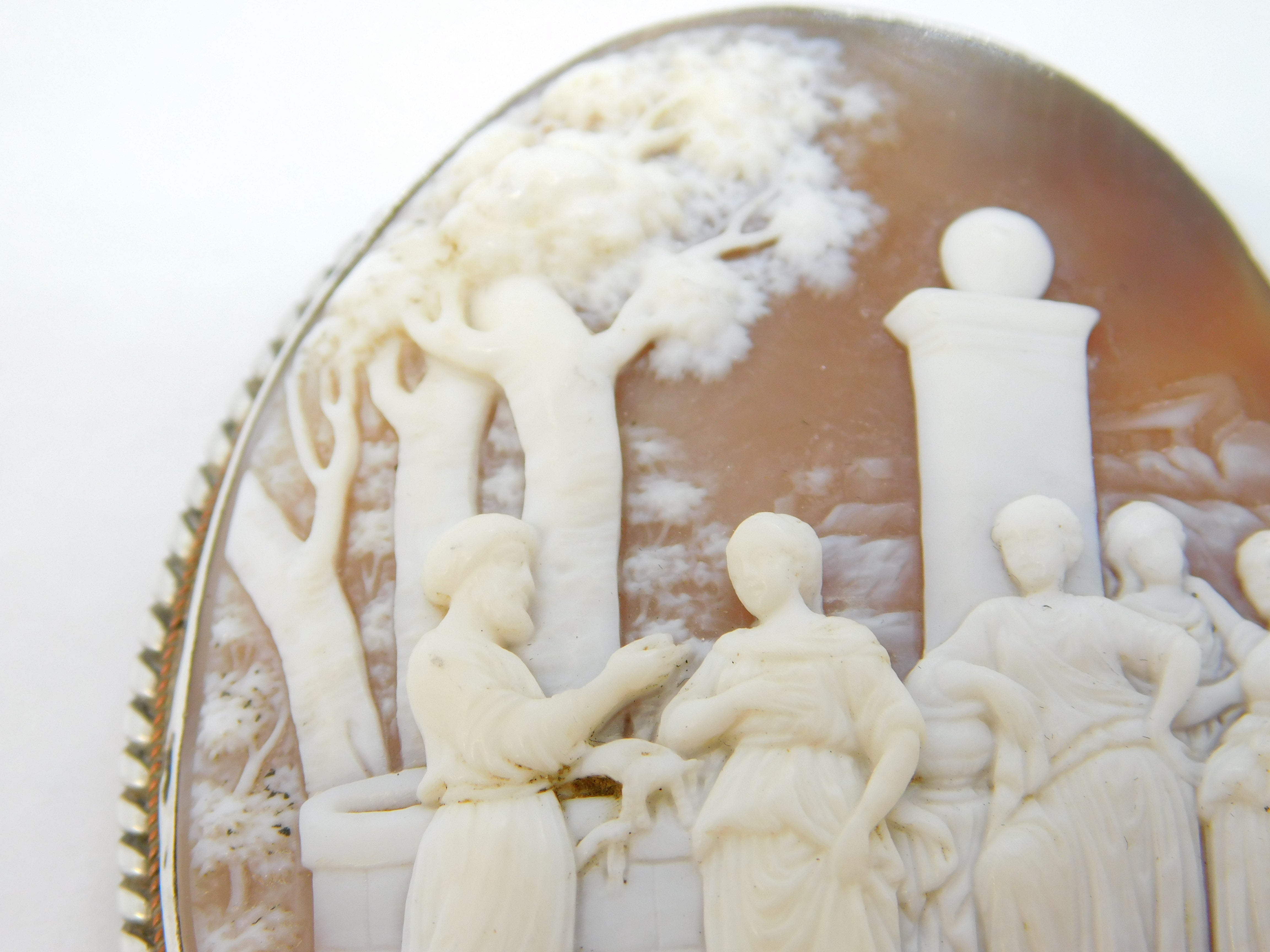 Details: A fantastic and wonderfully designed antique mid-Victorian large sterling silver mounted brooch pin with a superb carved shell cameo depicting a classical Epicurean scene with male figure in conversation with four female friends c1860, the silver has been XRF tested. This is a wonderful item that would make a perfect gift or addition to any collection. The BOX pictured is for PRESENTATION ONLY and is NOT included in the listings but used to frame the pictures unless specifically stated otherwise.