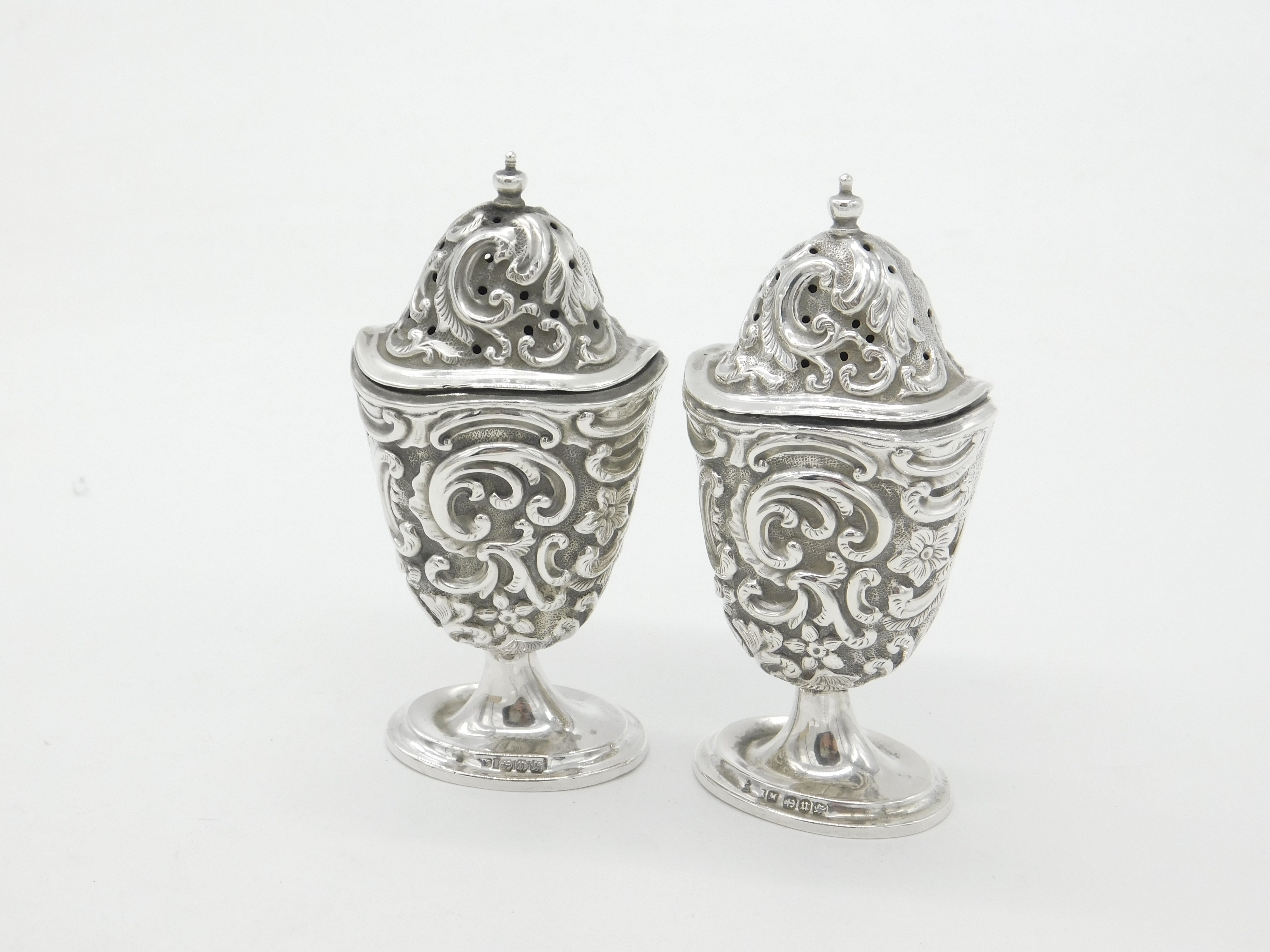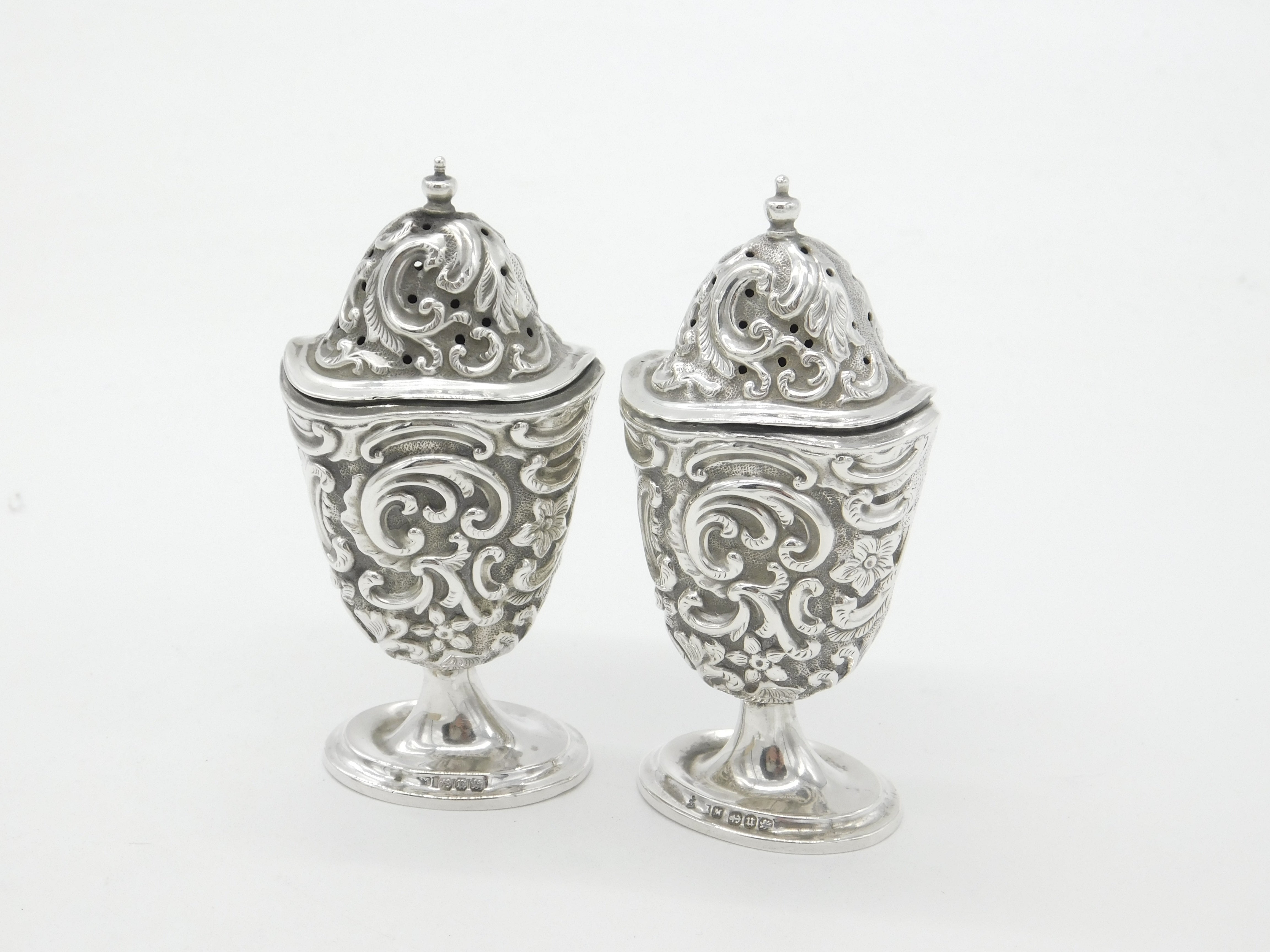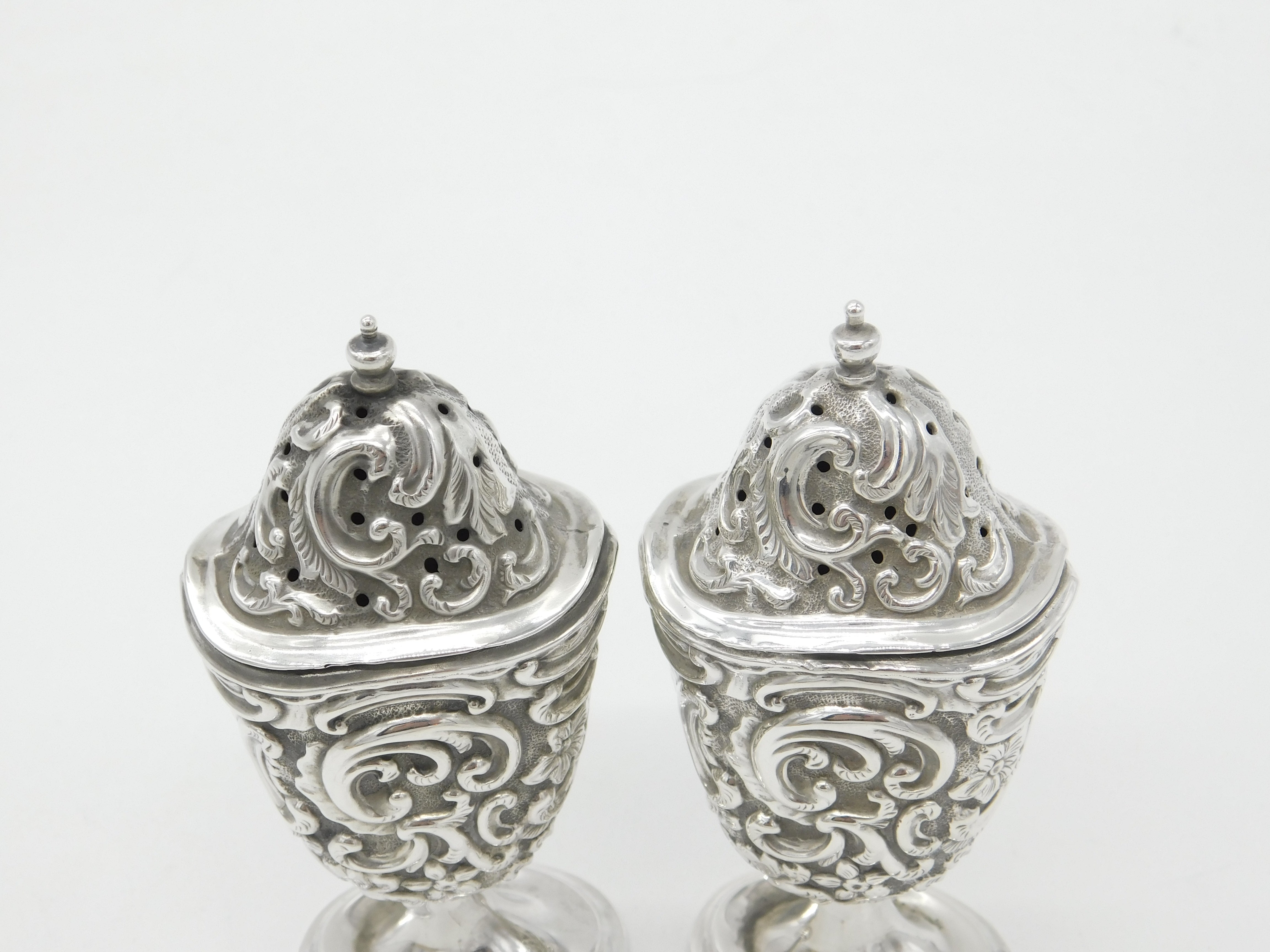 Victorian Pair of Sterling Silver Floral Pattern Salt & Pepper Shakers 1894