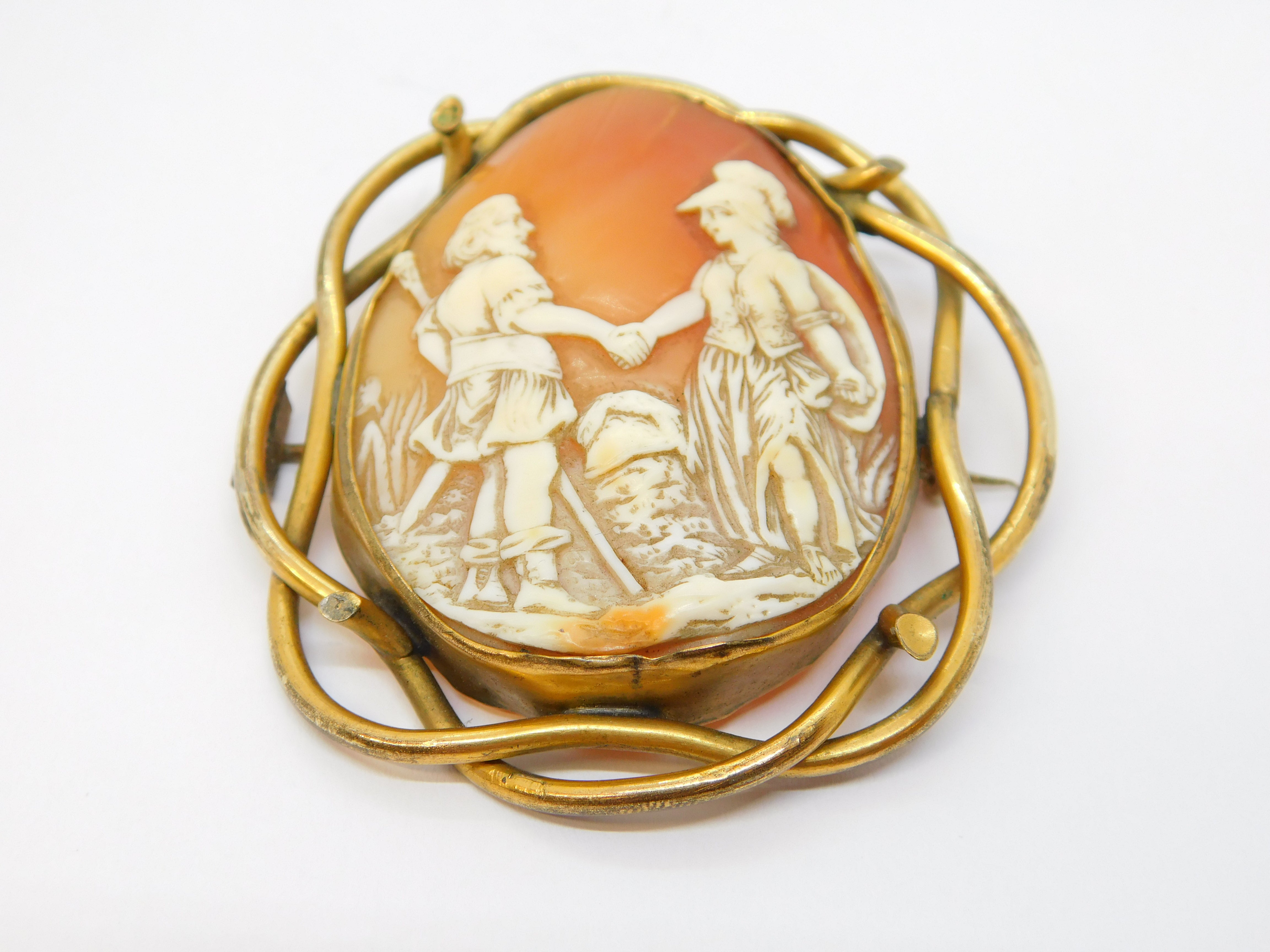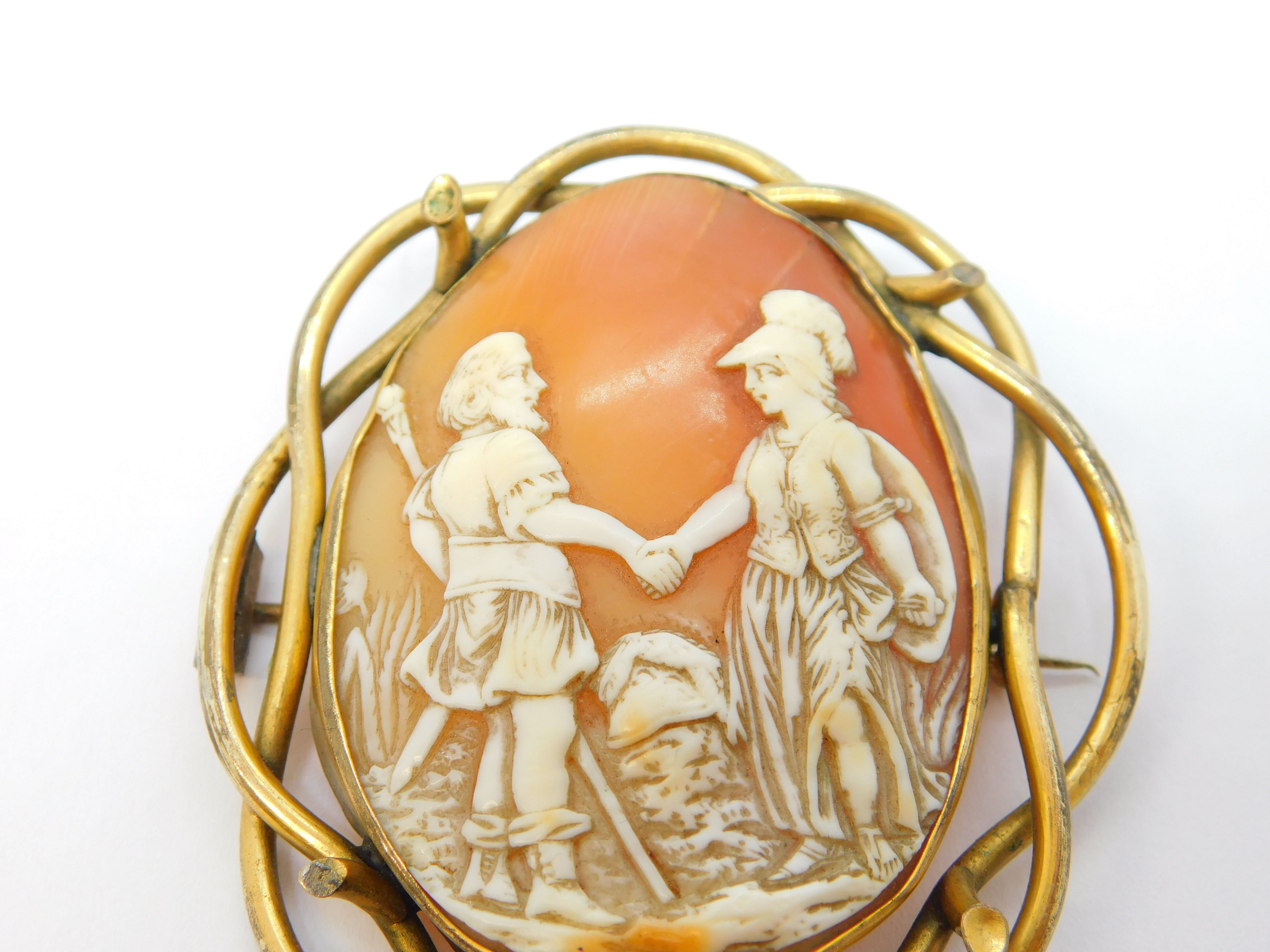 Details: A fantastic and wonderfully designed antique Victorian pinchbeck mounted large carved shell cameo depicting a soldier shaking the hand of a classical god c1880, a wonderful unusual carving. This is a wonderful item that would make a perfect gift or addition to any collection. We are more than happy to provide XRF reports for items upon request.