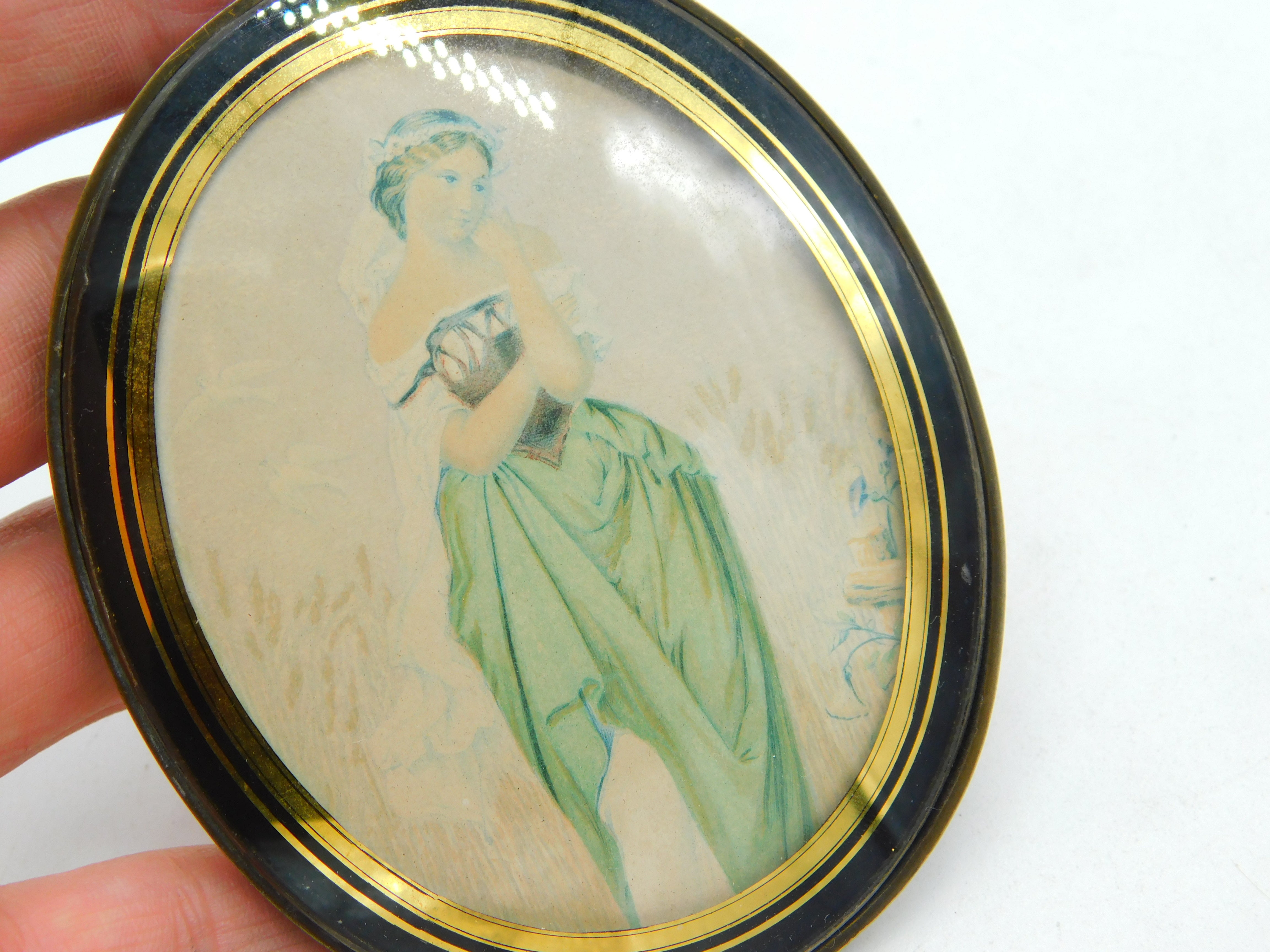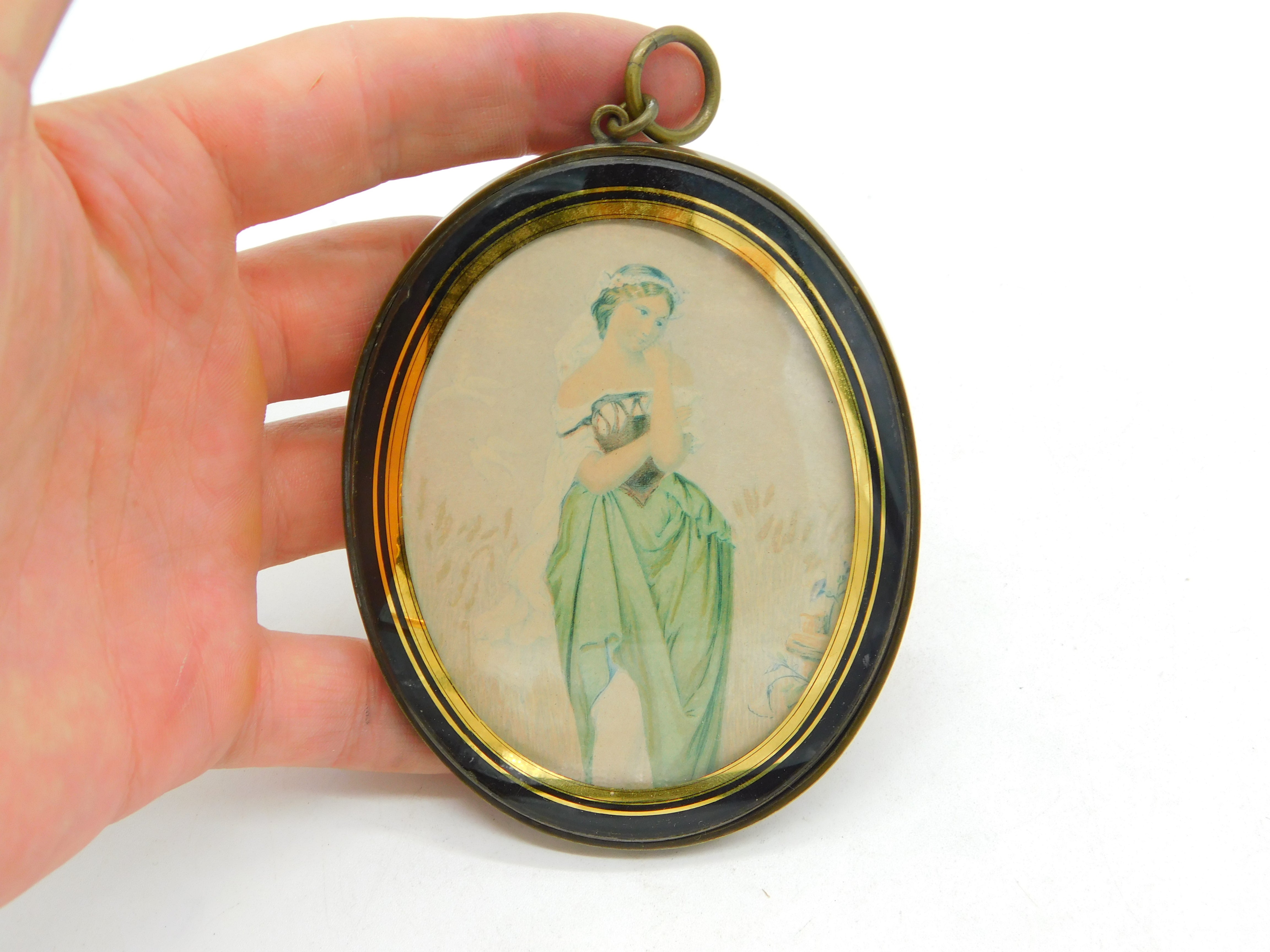 Victorian Rolled Gold Black Enamel Mourning Watercolour on Card 1841 Antique