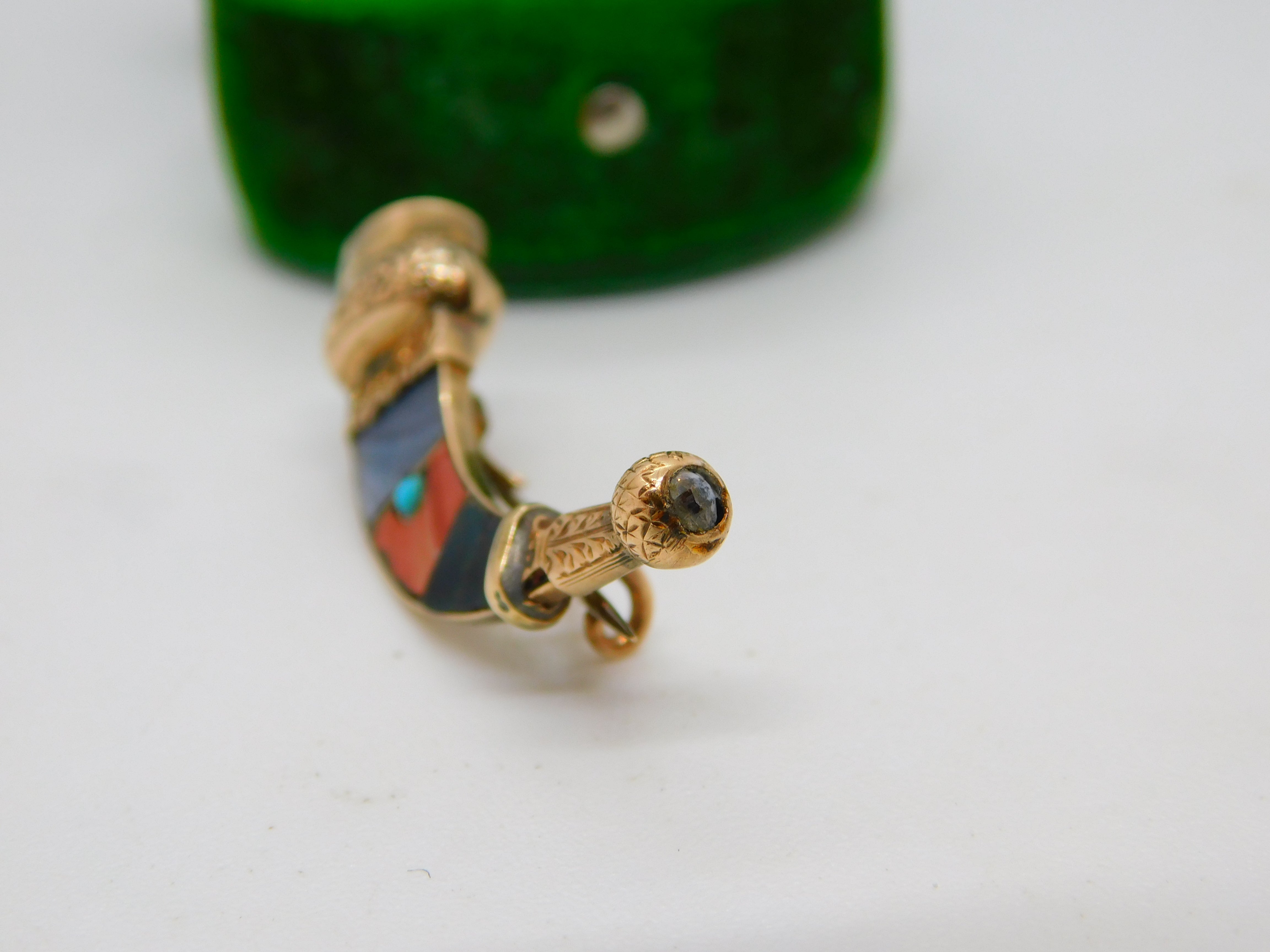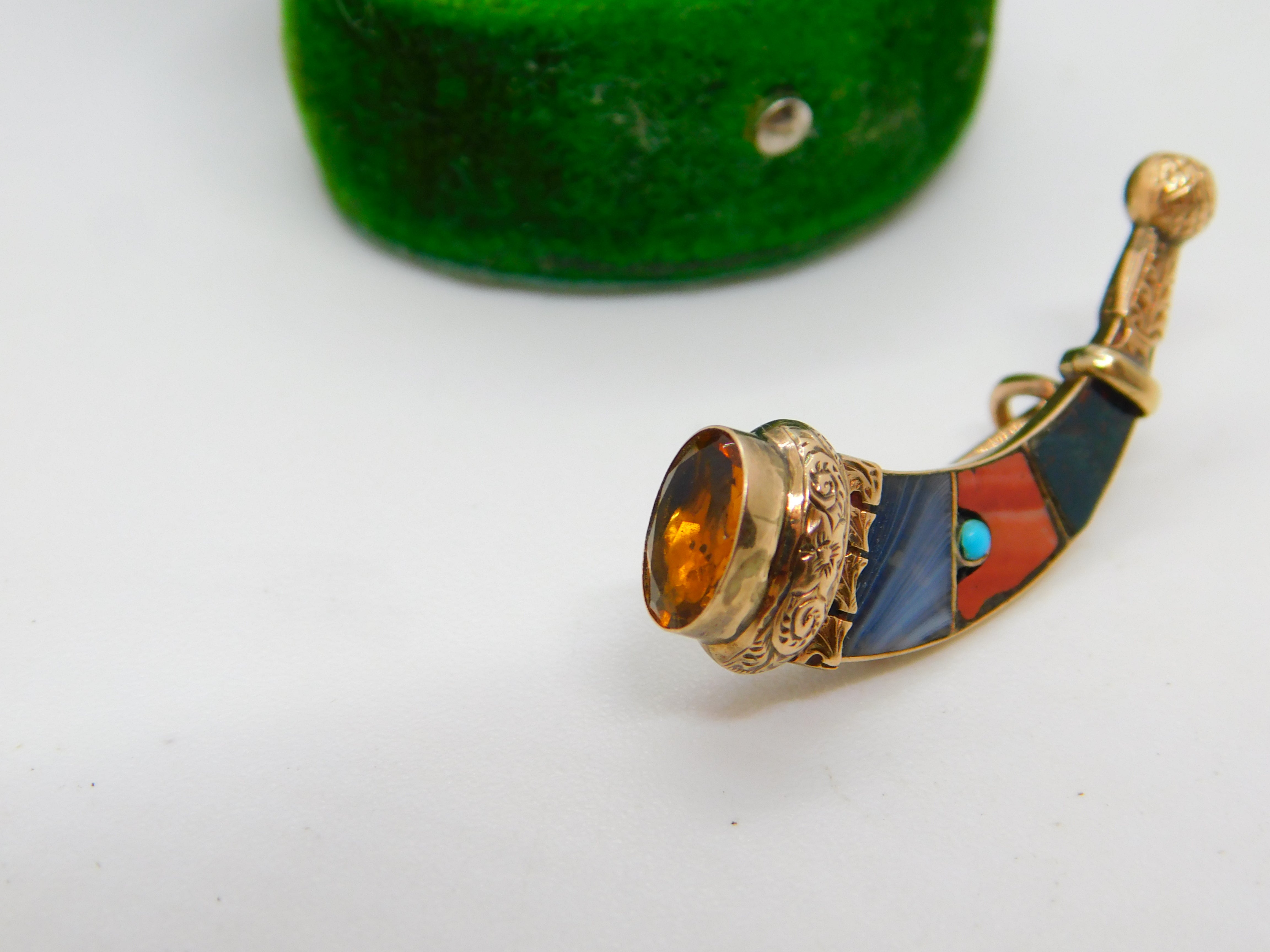 Details: A fantastic and wonderfully designed antique Victorian scottish 9ct yellow gold sword from dress brooch set with citrine, montrose agate, red agate, turquoise, bloodstone and even an old-cut diamond to the tip c1840, the gold has been XRF tested as it is unmarked. The diamond has been tested. This is a wonderful item that would make a perfect gift or addition to any collection. The BOX pictured is for PRESENTATION ONLY and is NOT included in the listings but used to frame the pictures unless specifically stated otherwise.