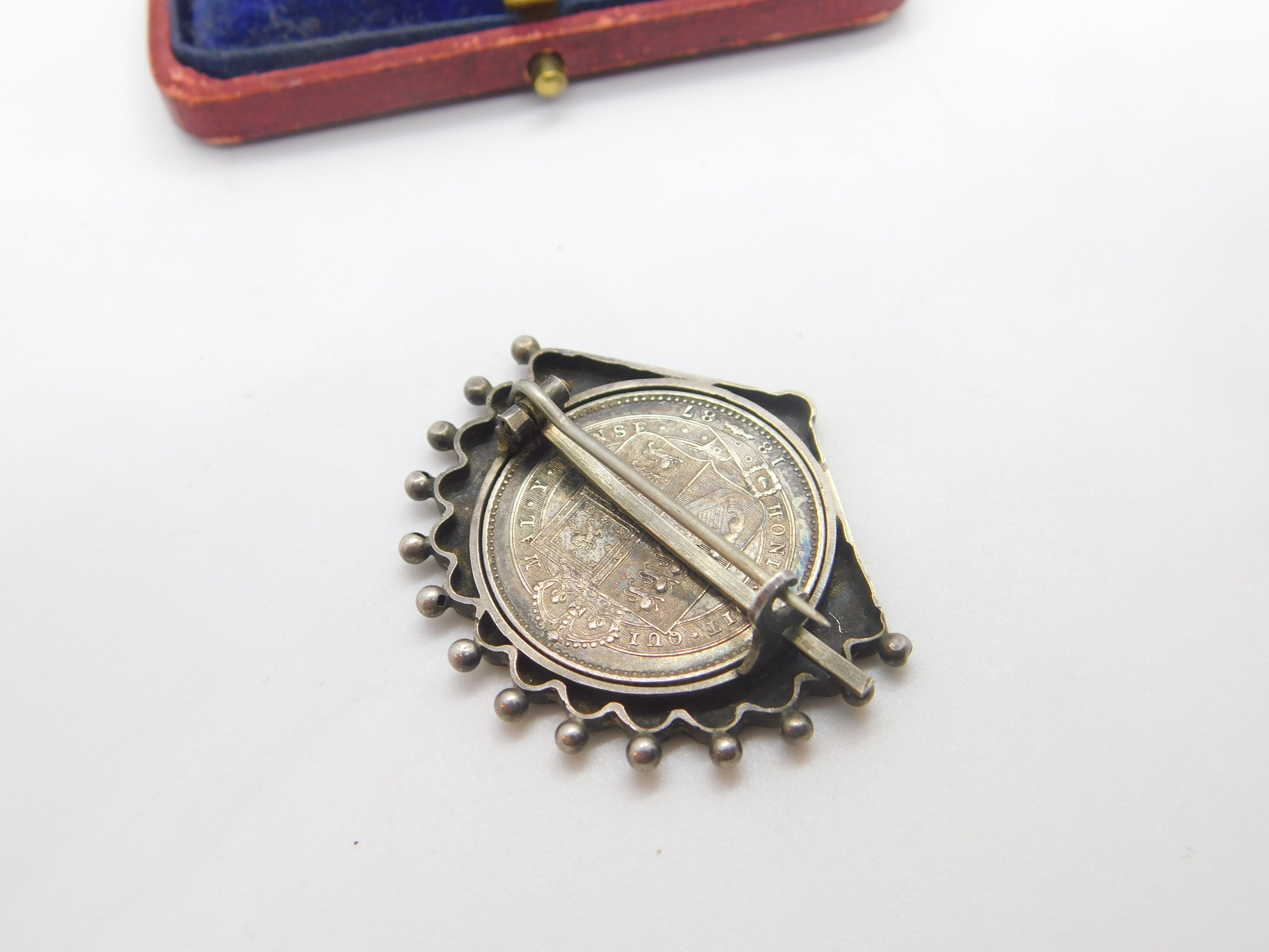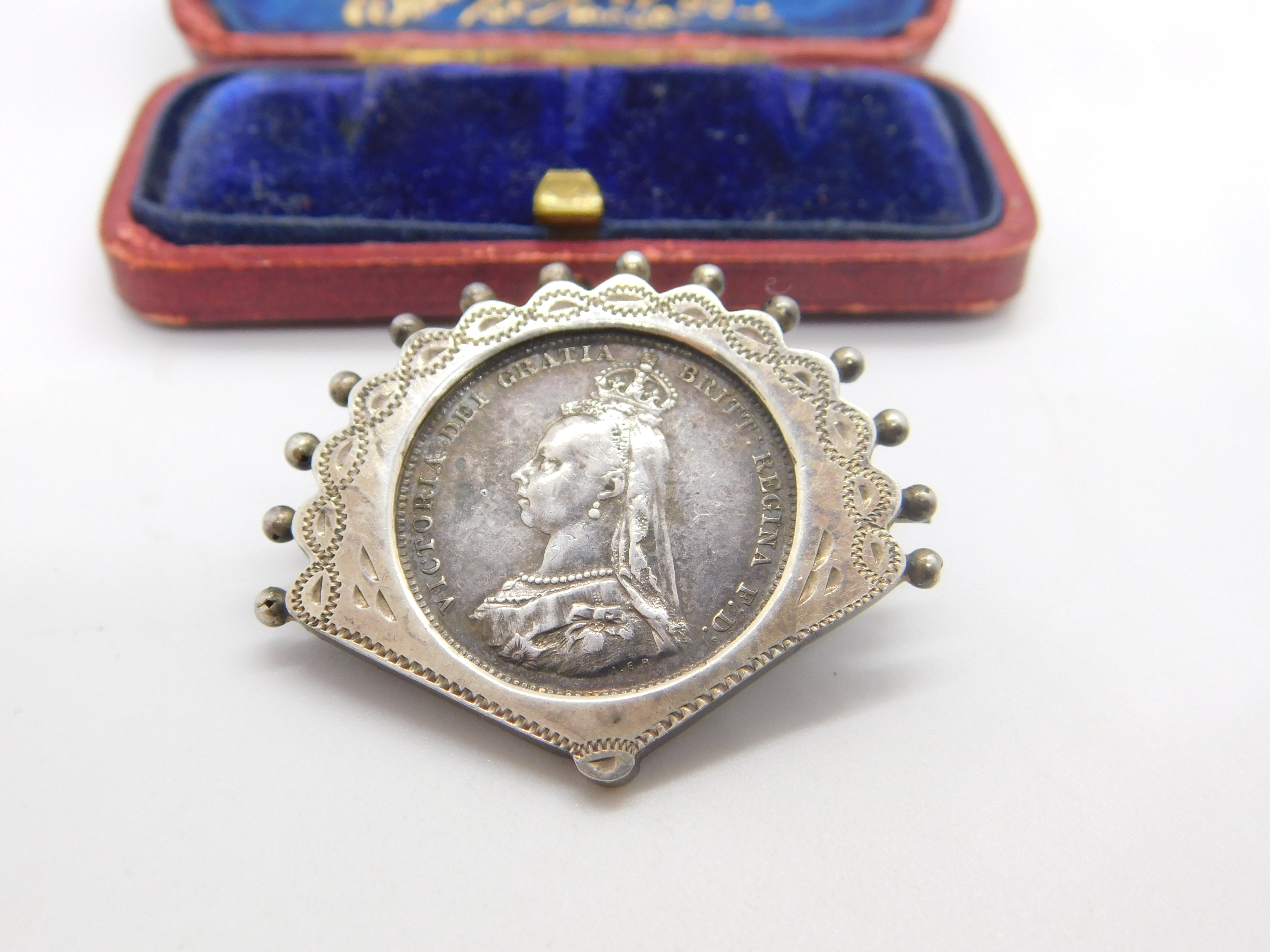 Victorian Sterling Shilling Coin Fan Form Brooch 1887 Antique Jubilee Year