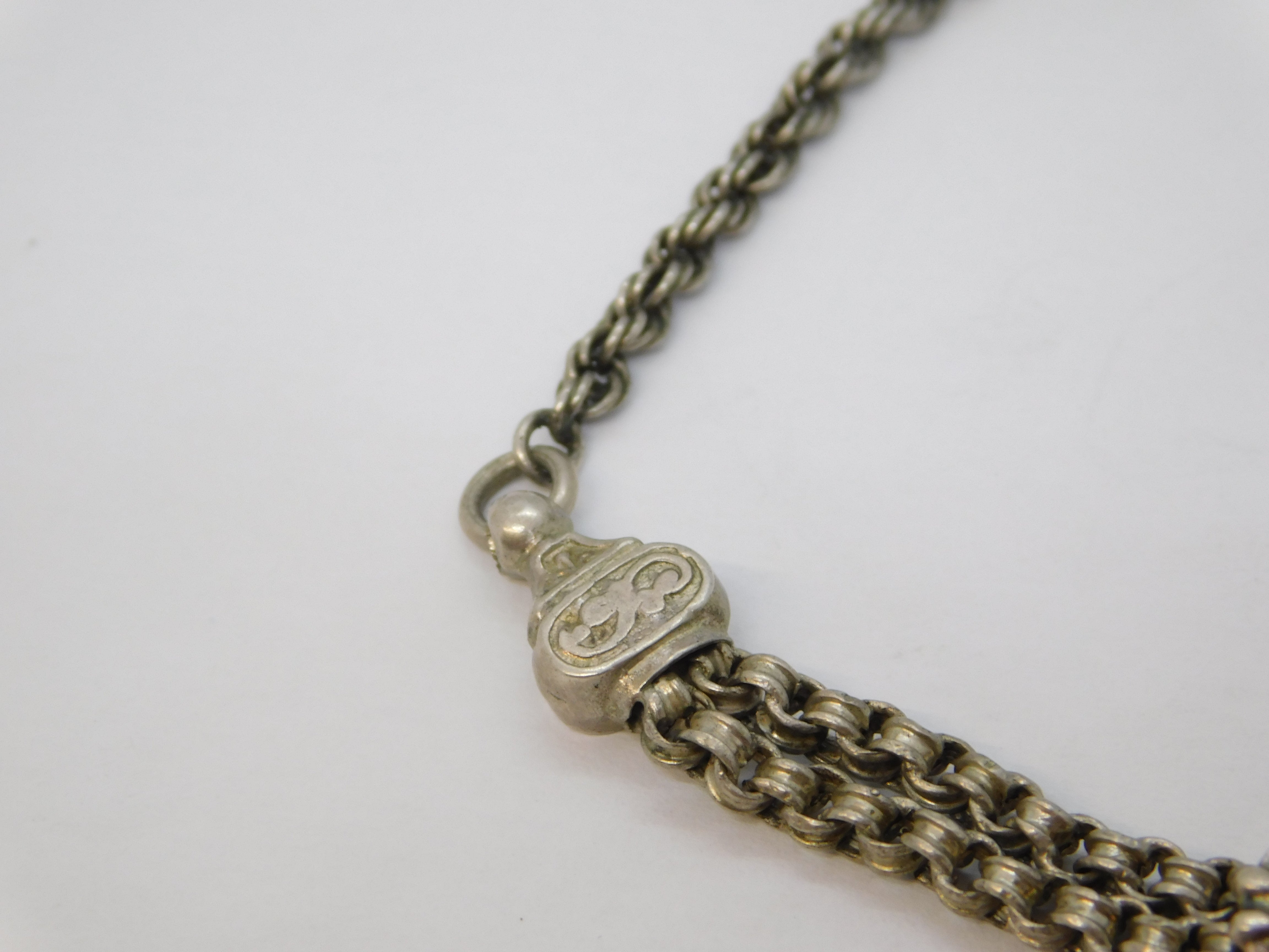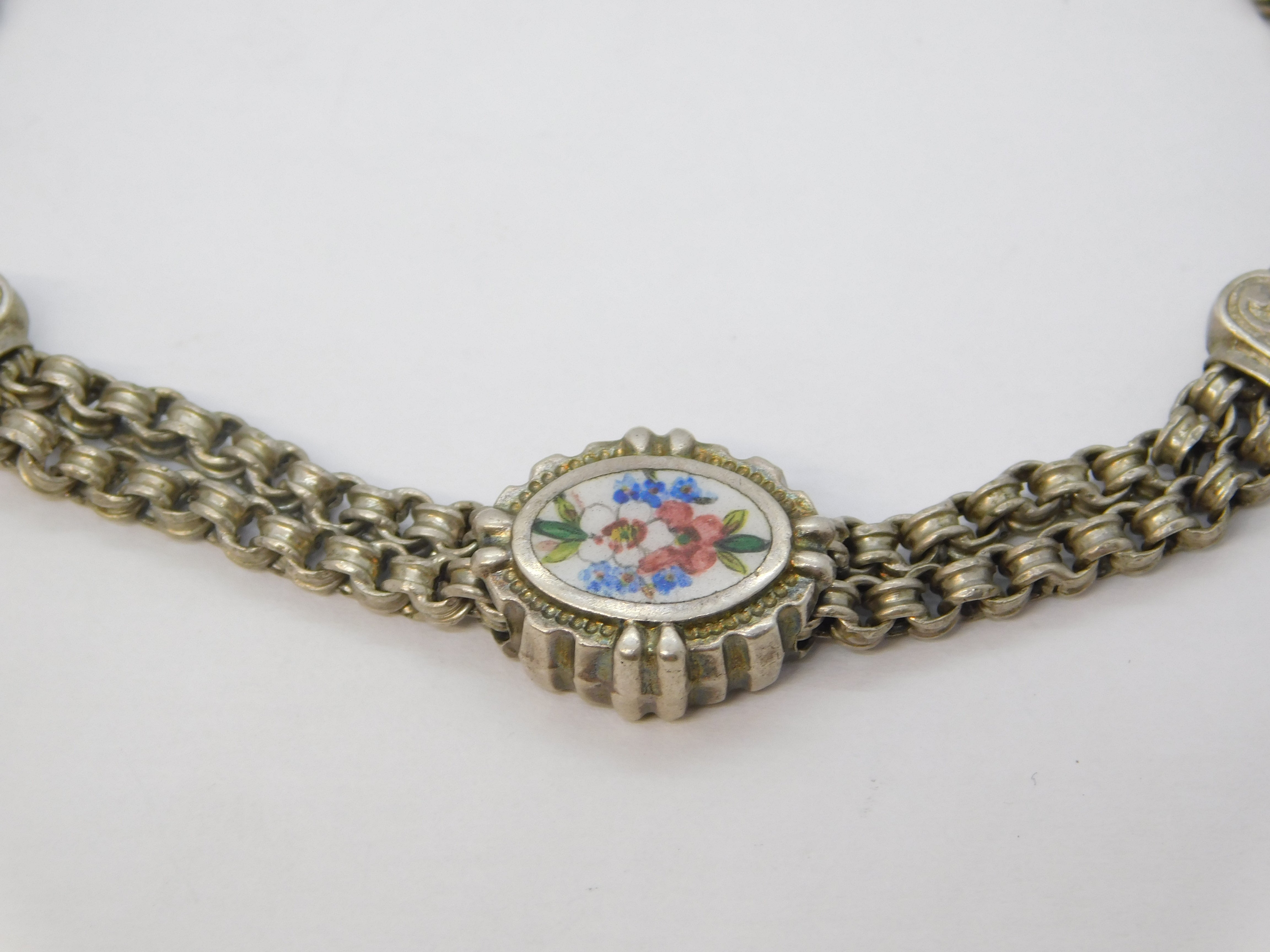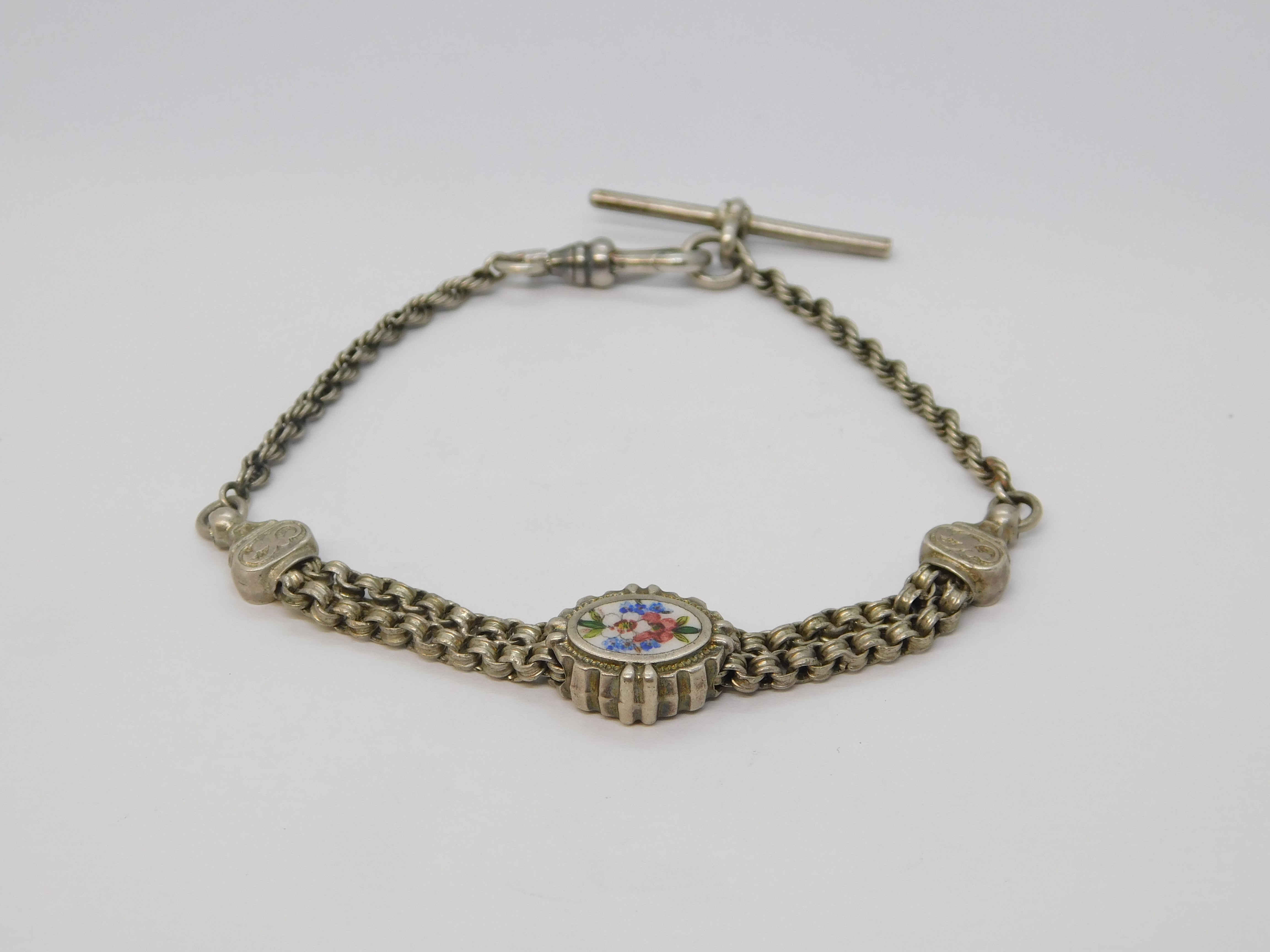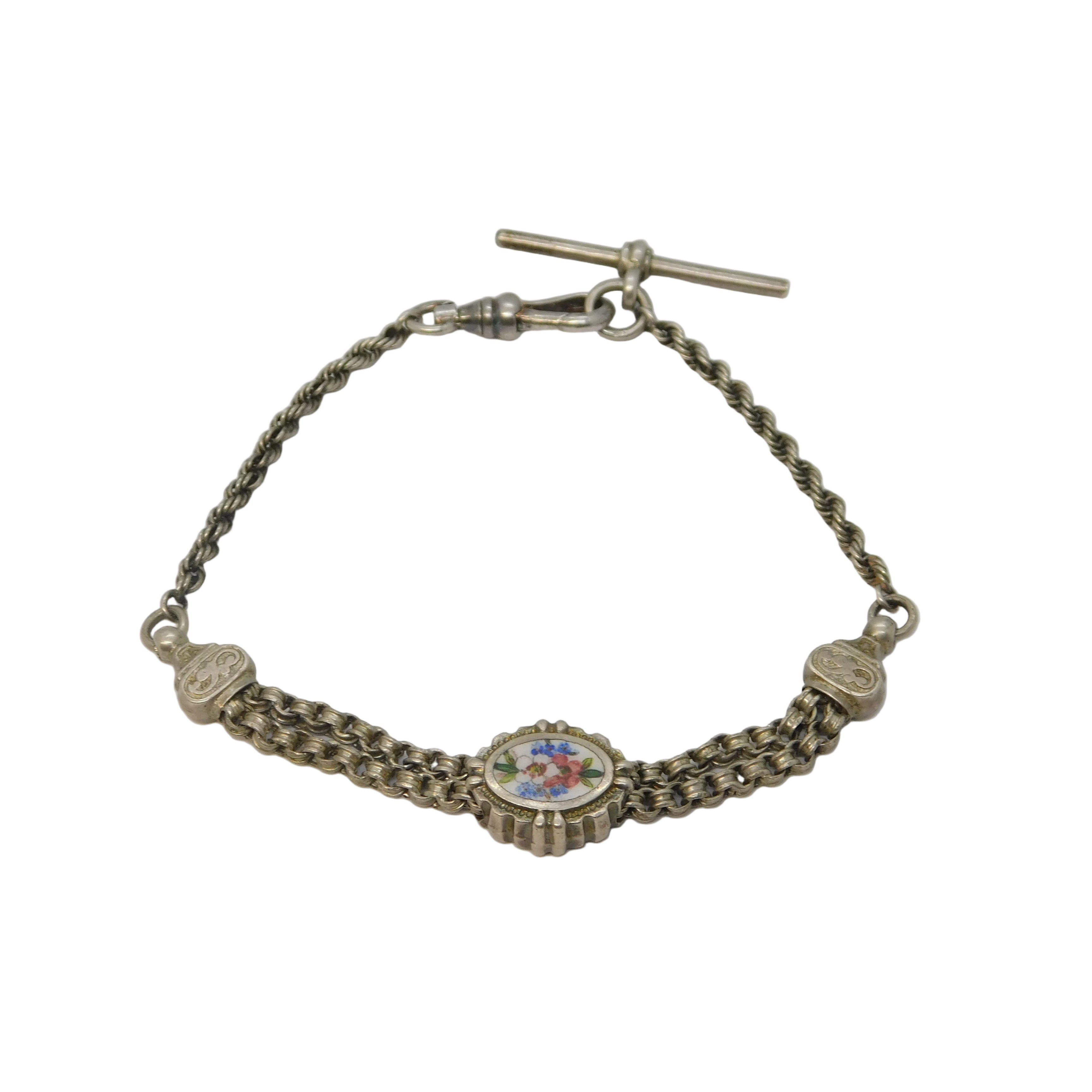 Details: A fantastic and wonderfully designed antique Victorian sterling silver fancy link albertina bracelet with charming floral enamel section, dog clip and t-bar c1880, the silver has been XRF tested, lovely condition. This is a wonderful item that would make a perfect gift or addition to any collection. We are more than happy to provide XRF reports for items upon request.