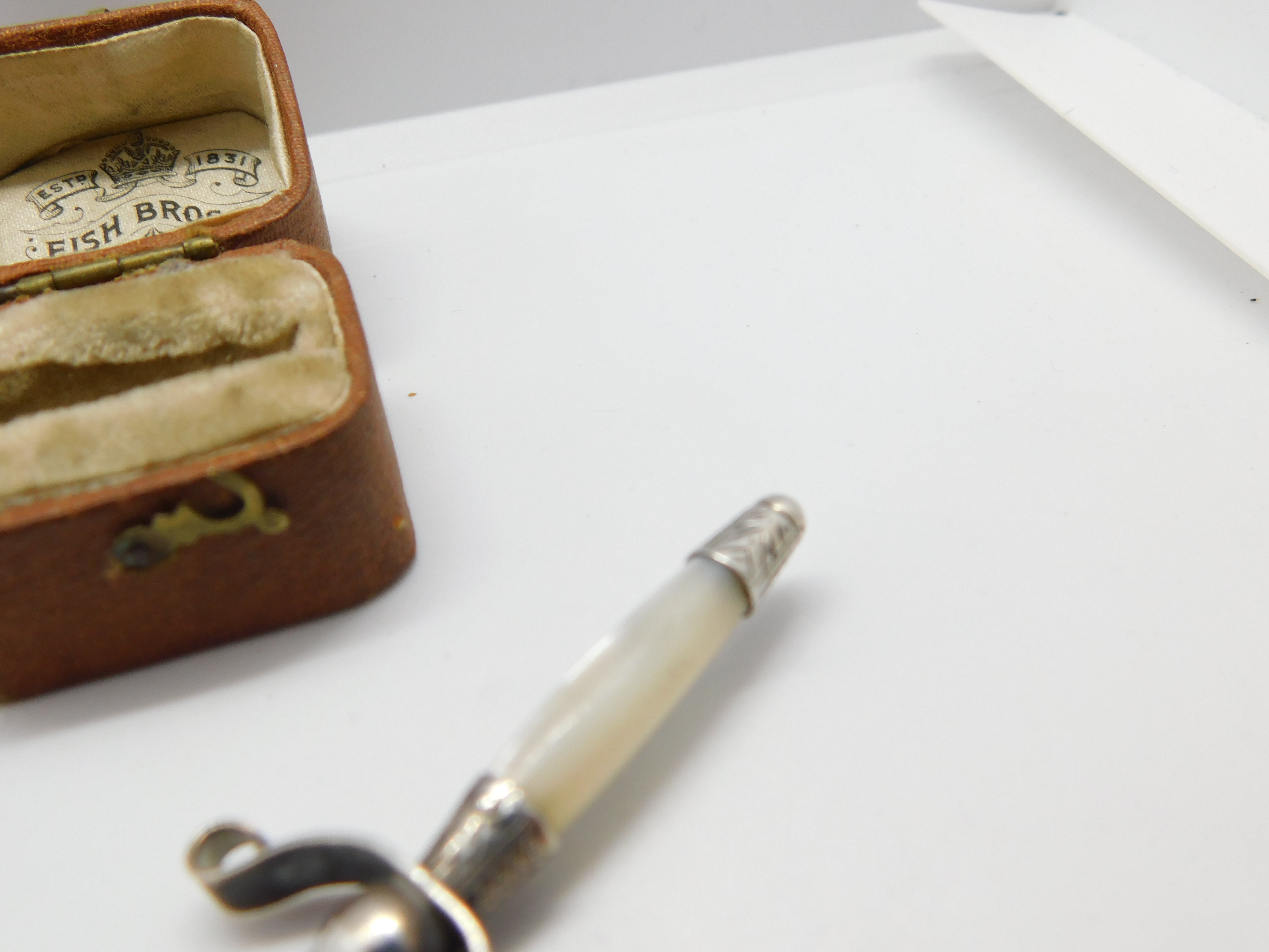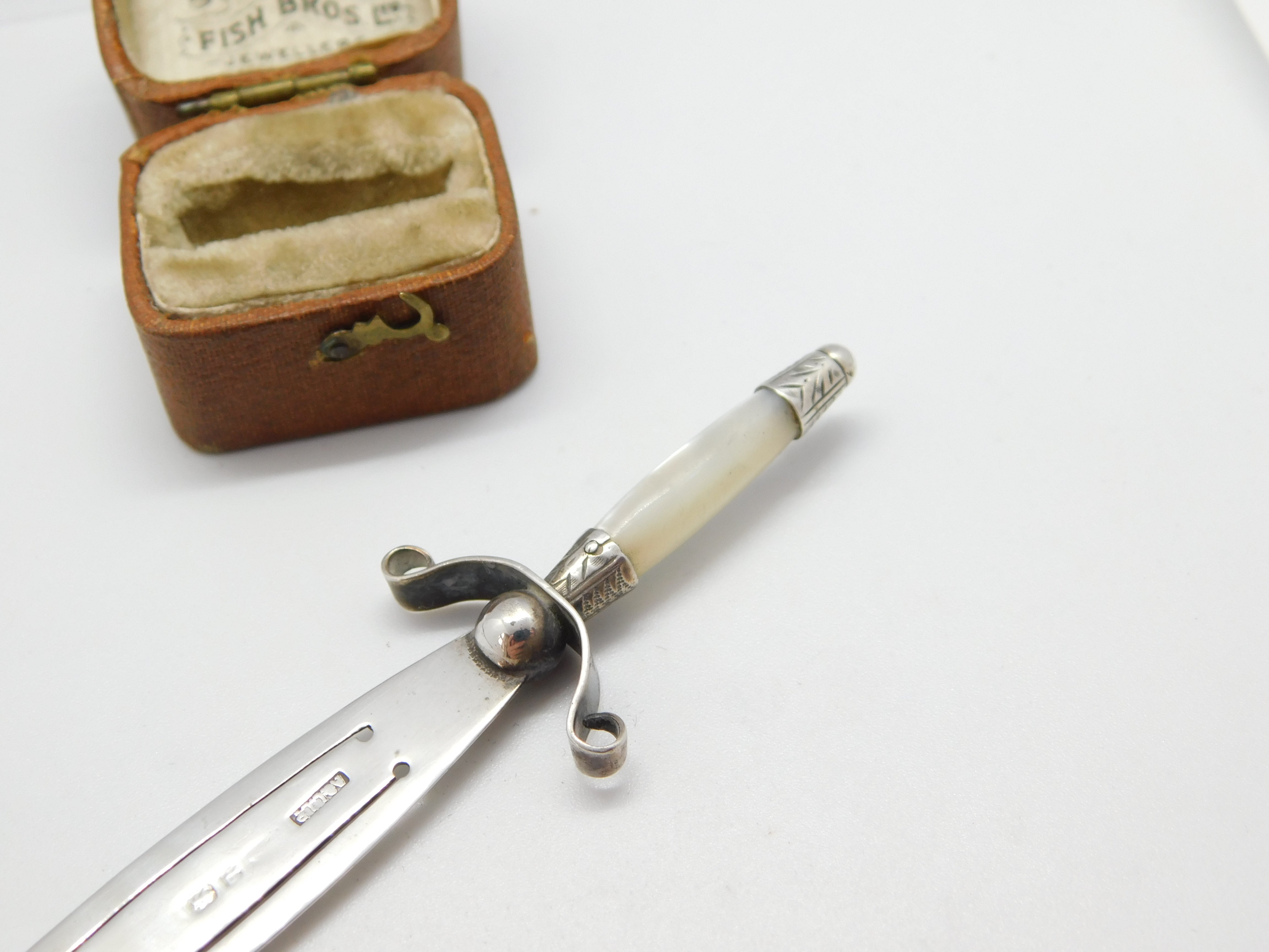 Details: A fantastic and wonderfully designed antique Victorian sterling silver & mother of pearl sword shaped bookmark with lovely detailing hallmarked Birmingham 1889 by Adie & Lovekin. This is a wonderful item that would make a perfect gift or addition to any collection. The BOX pictured is for PRESENTATION ONLY and is NOT included in the listings but used to frame the pictures unless specifically stated otherwise.