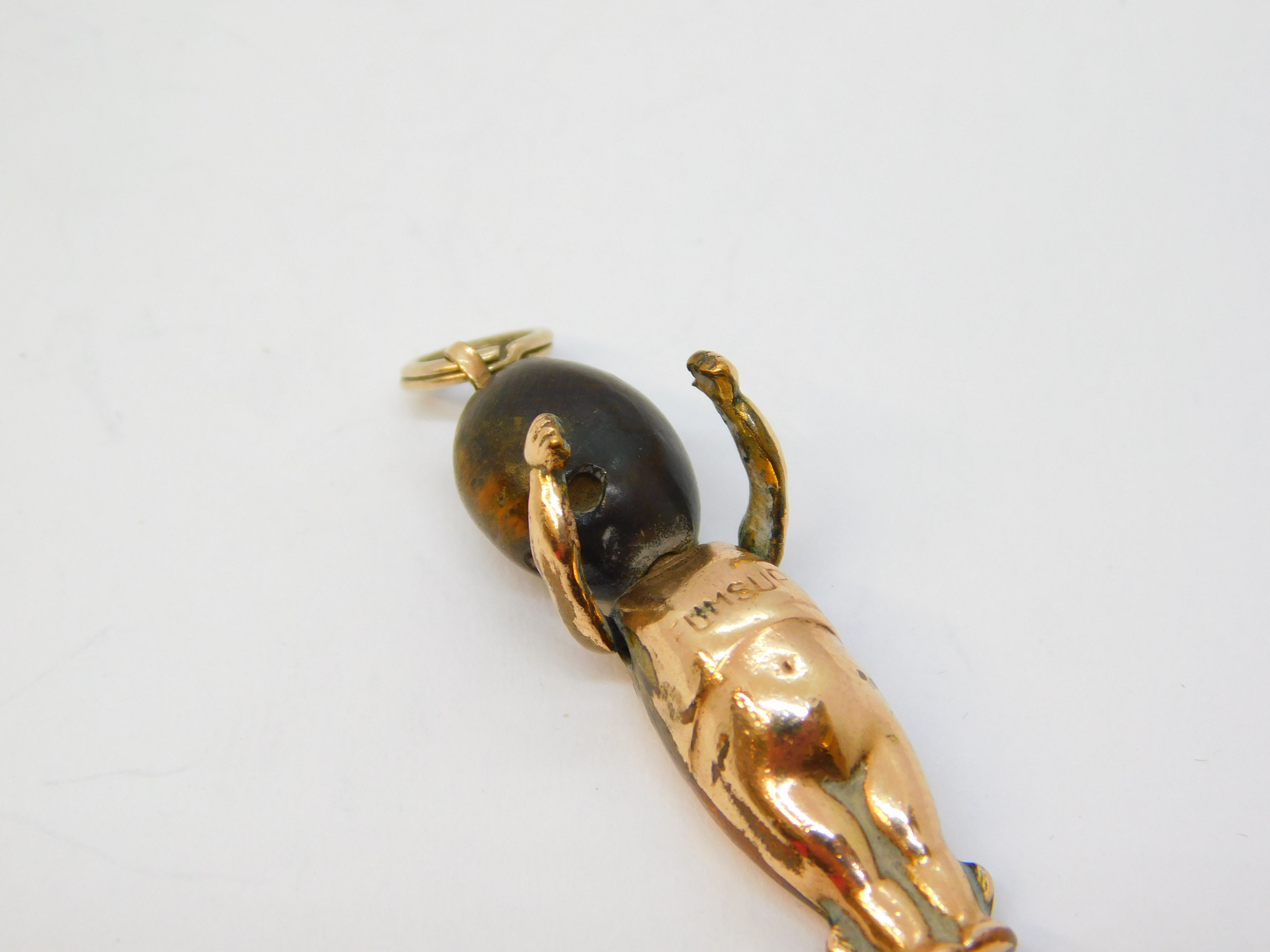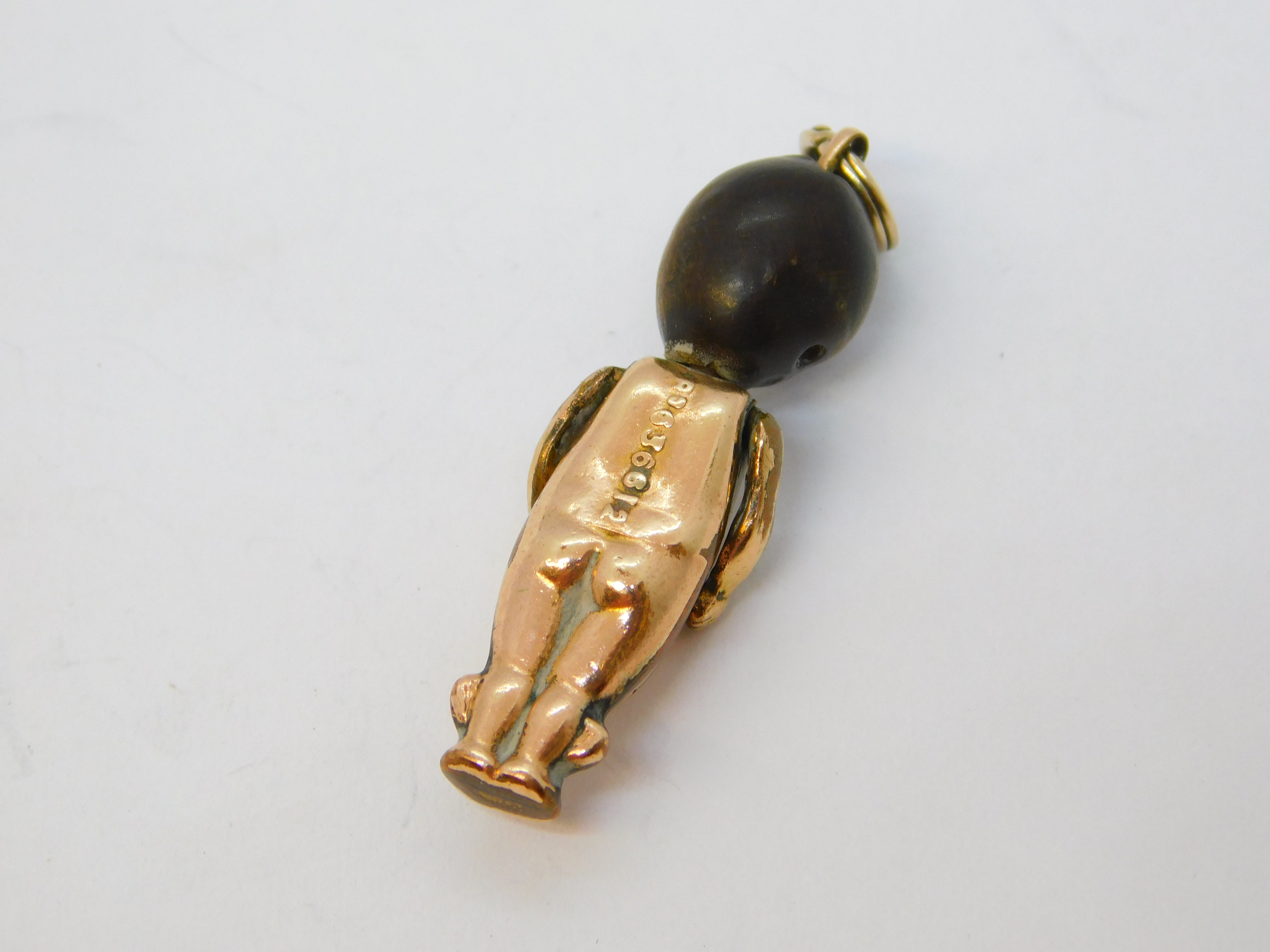 Details: A fantastic and wonderfully designed antique WW1-era lucky 9ct yellow gold cased and wooden head articulated 'Fumsup' or 'Touch Wud' charm pendant with articulated arms, reg. marks to the reverse and XRF tests as 9ct although the gold can be seen wearing in areas and we believe it to be cased on base metal. This is a wonderful item that would make a perfect gift or addition to any collection. We are more than happy to provide XRF reports for items upon request.
