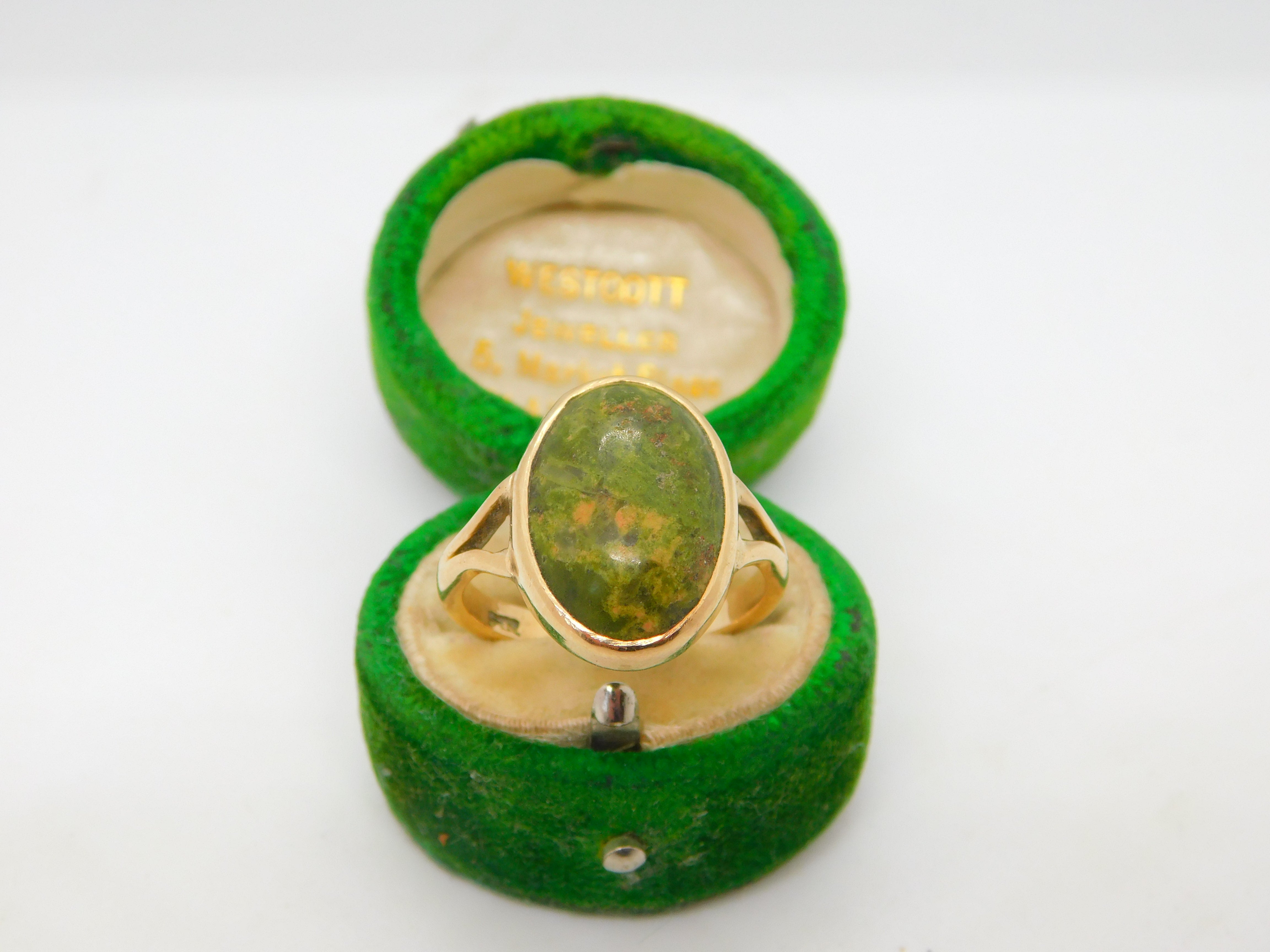 18ct Yellow Gold & Cabochon Unakite Set Signet Ring Vintage c1970