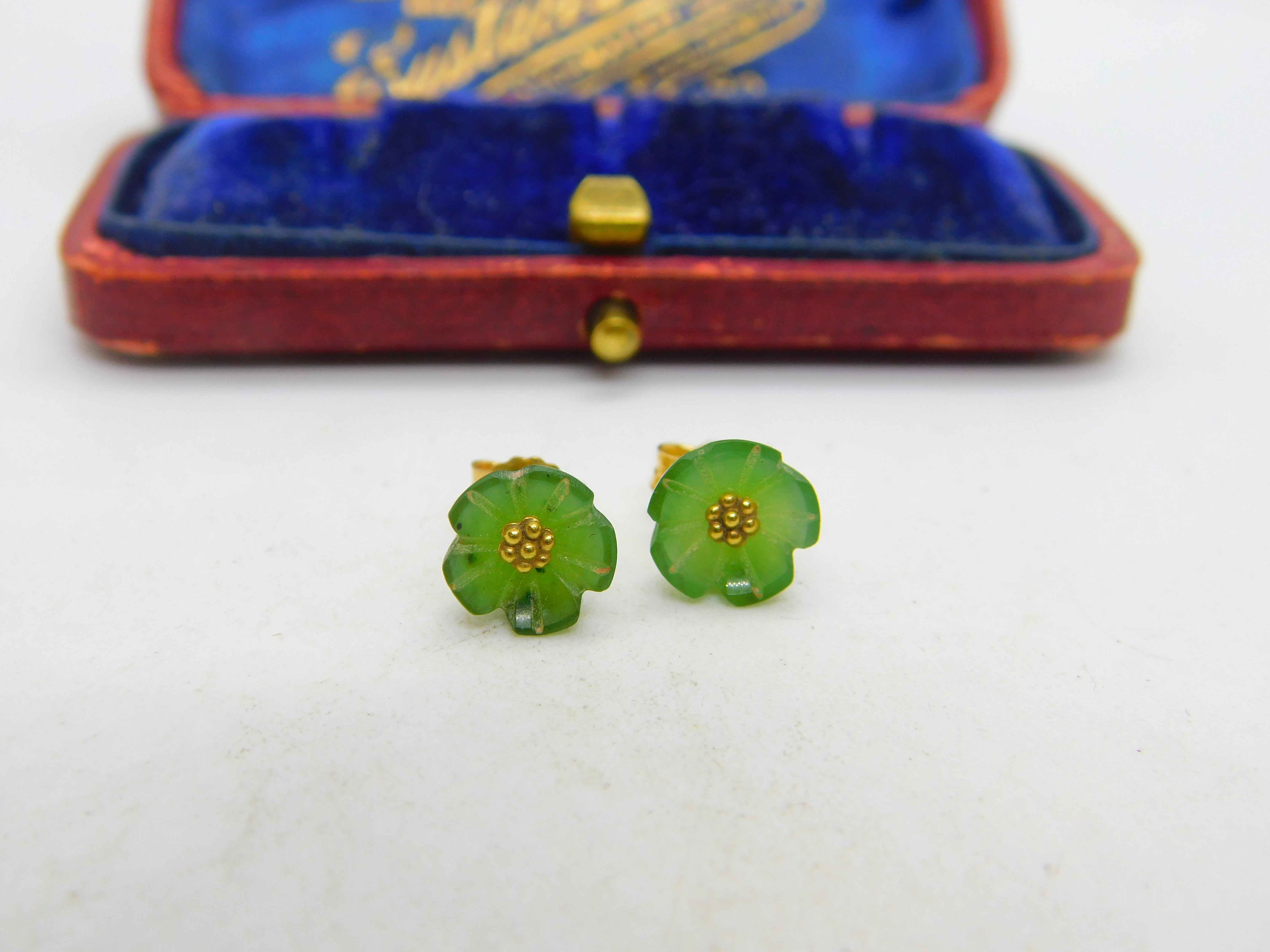 18ct Yellow Gold & Carved Nephrite Jade Floral Stud Earrings Vintage c1980