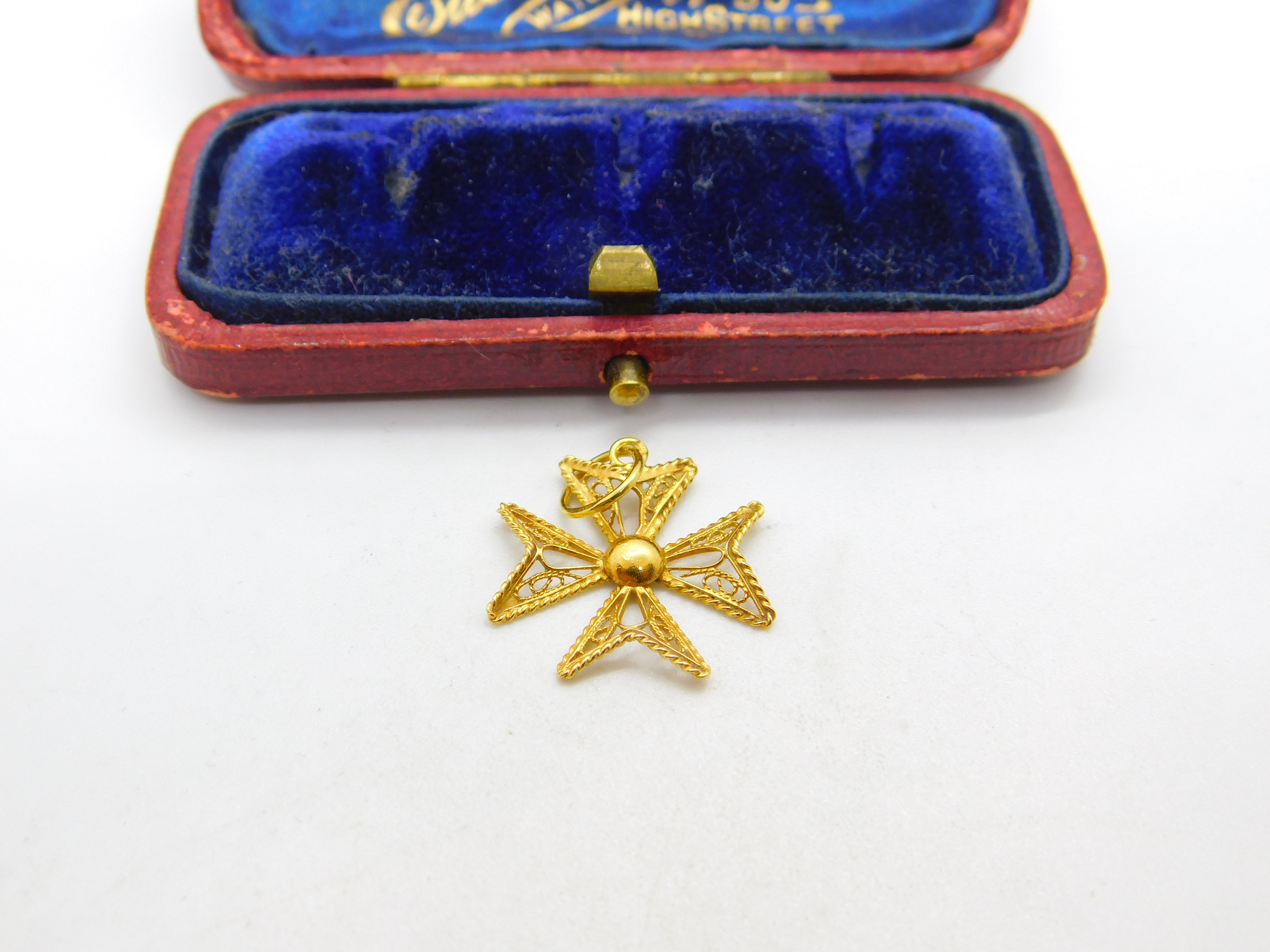 18ct Yellow Gold Filigree Form Maltese Cross Pendant Antique c1940 Art Deco