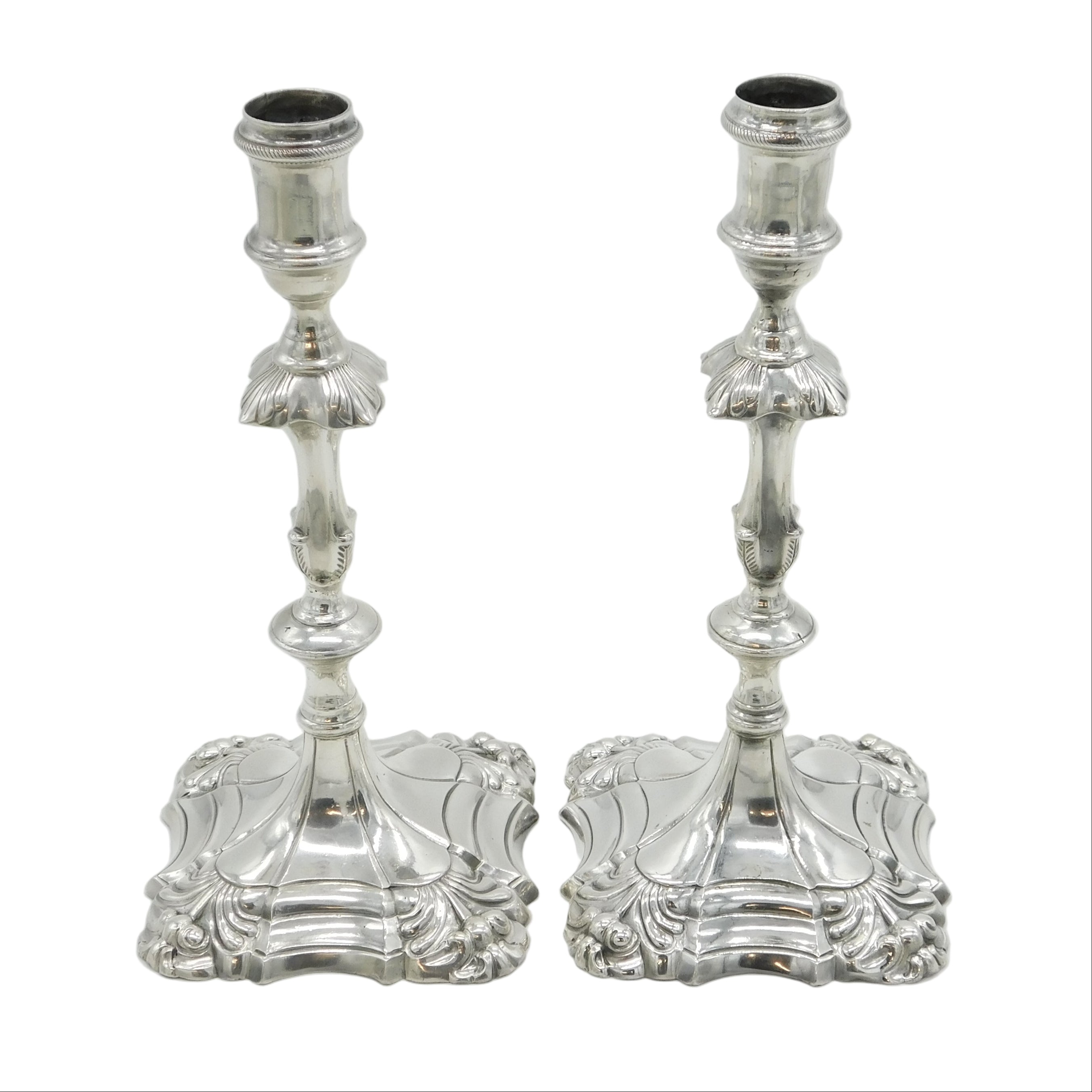 George II Cast Pair of Sterling Silver Candlesticks Antique 1756 London J. Gould
