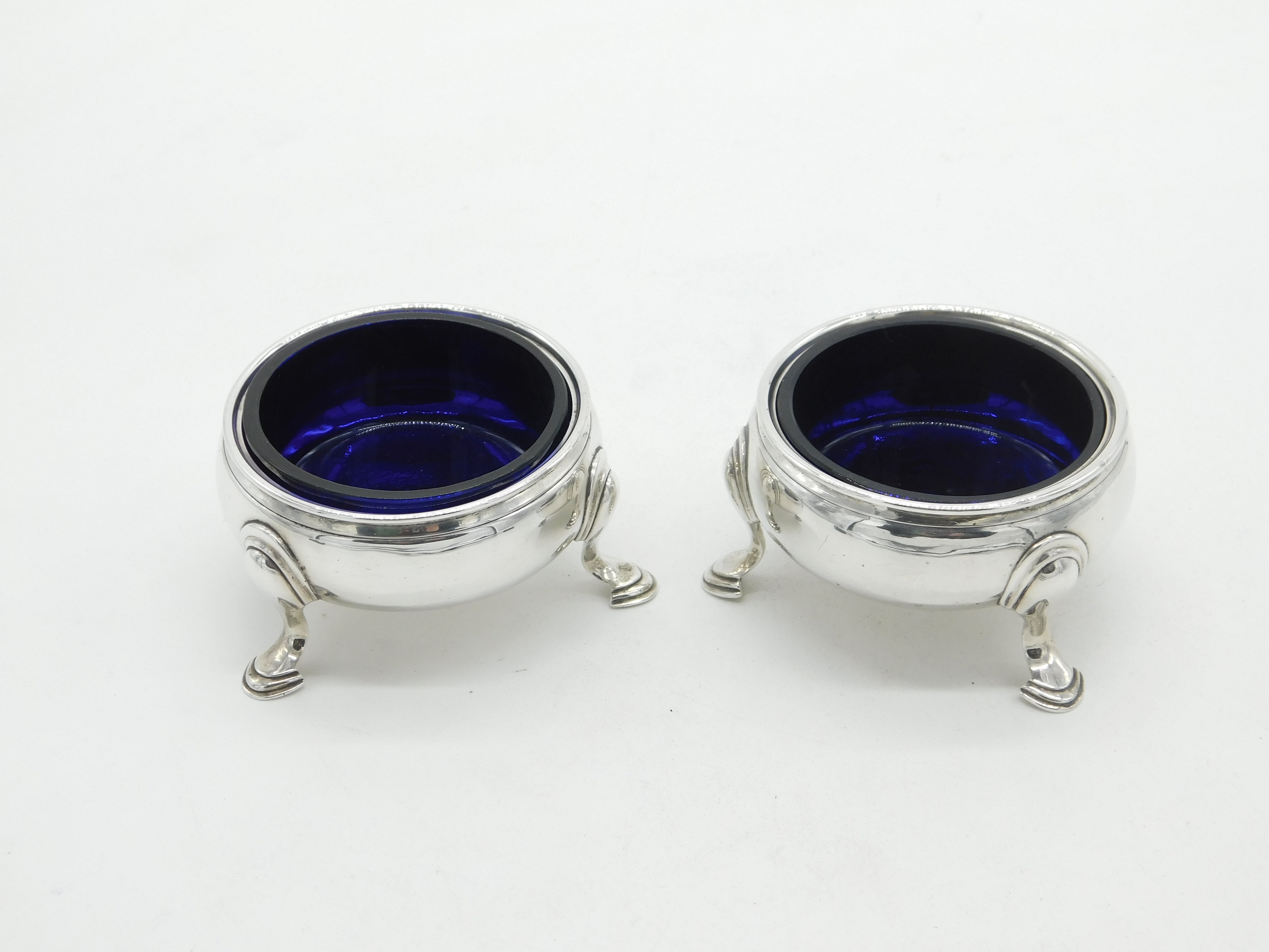 George II Pair Sterling Silver Blue Glass Lined Salt Cellars 1748 London Antique