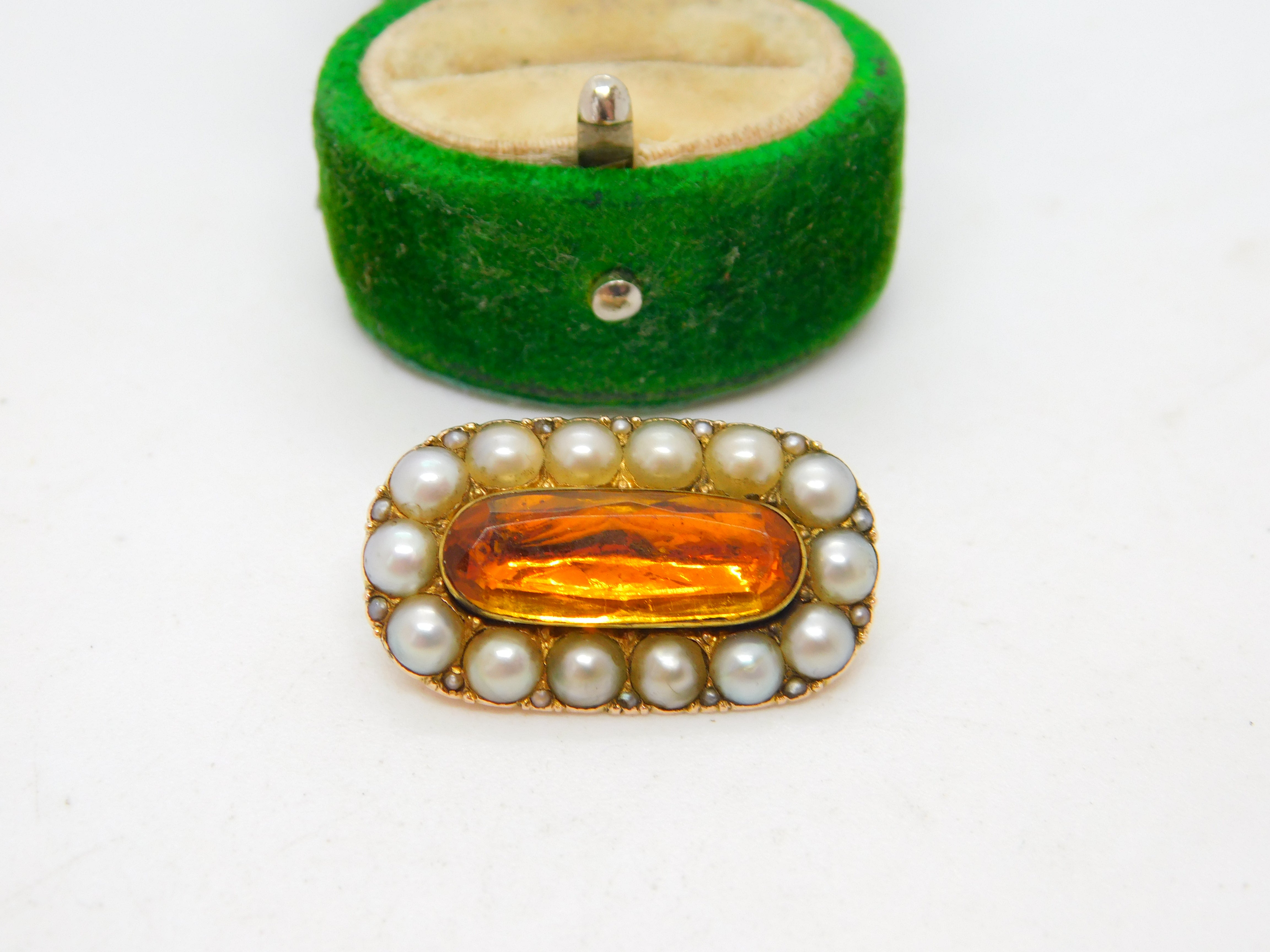 George III 9ct Gold, Pearl & Foil Back Citrine Mourning Brooch Antique c1820