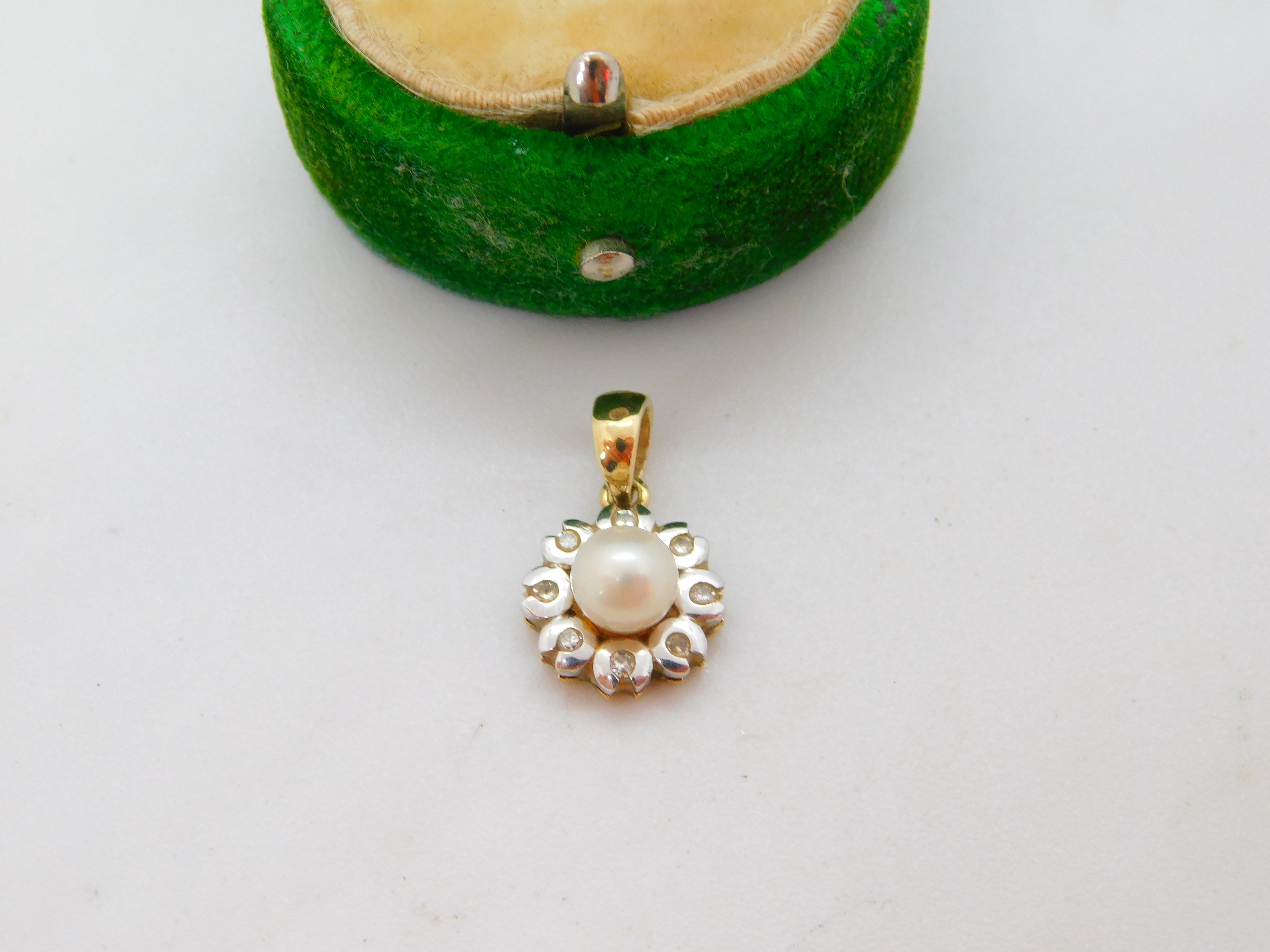 18ct Yellow Gold, Pearl & Diamond Set Floral Drop Pendant Vintage c1980