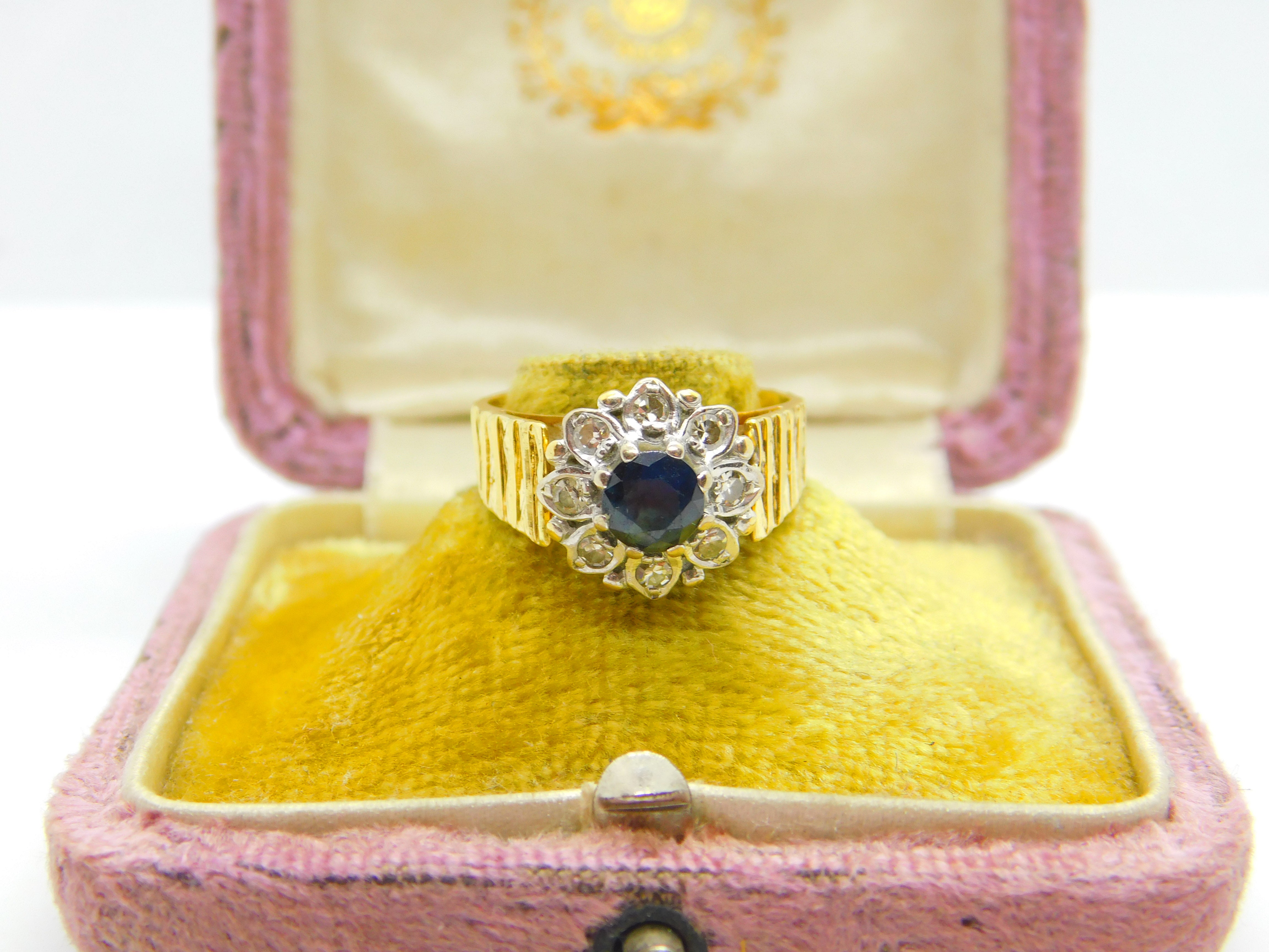 18ct Yellow Gold, Sapphire & 0.4ct Diamond Floral Cluster Ring Vintage 1995 London