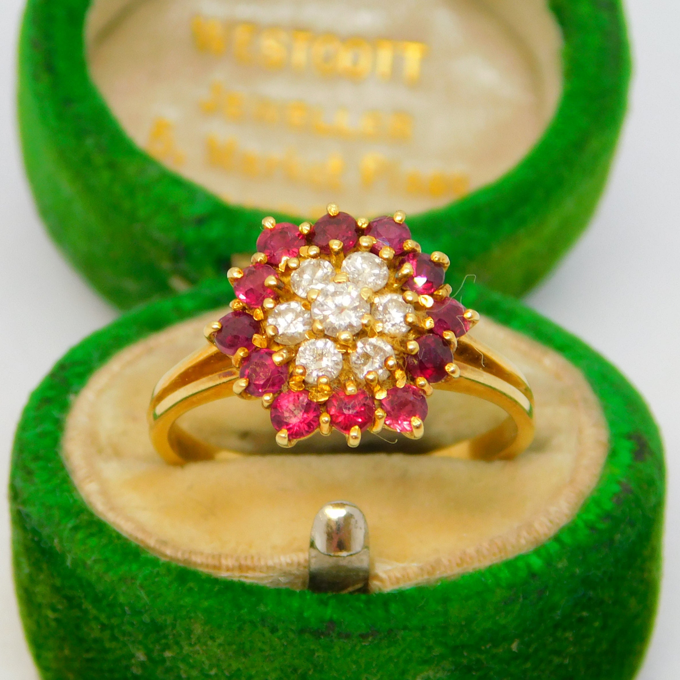 18ct Yellow Gold, Ruby & Diamond Floral Cluster Ring Vintage 1978 London