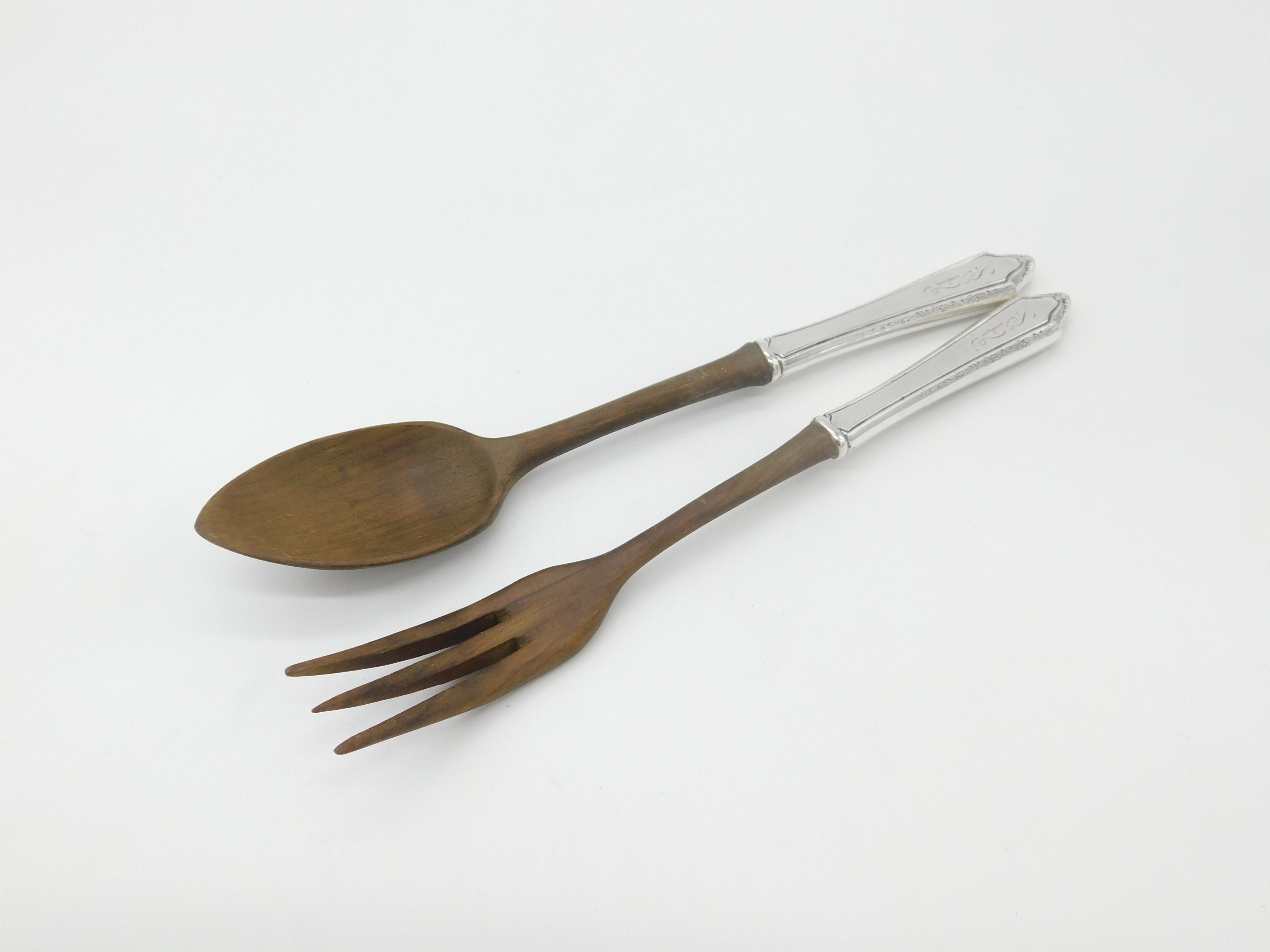 Set of Sterling Silver Handled & Olive Wood Salad Servers Antique c1920 Art Deco