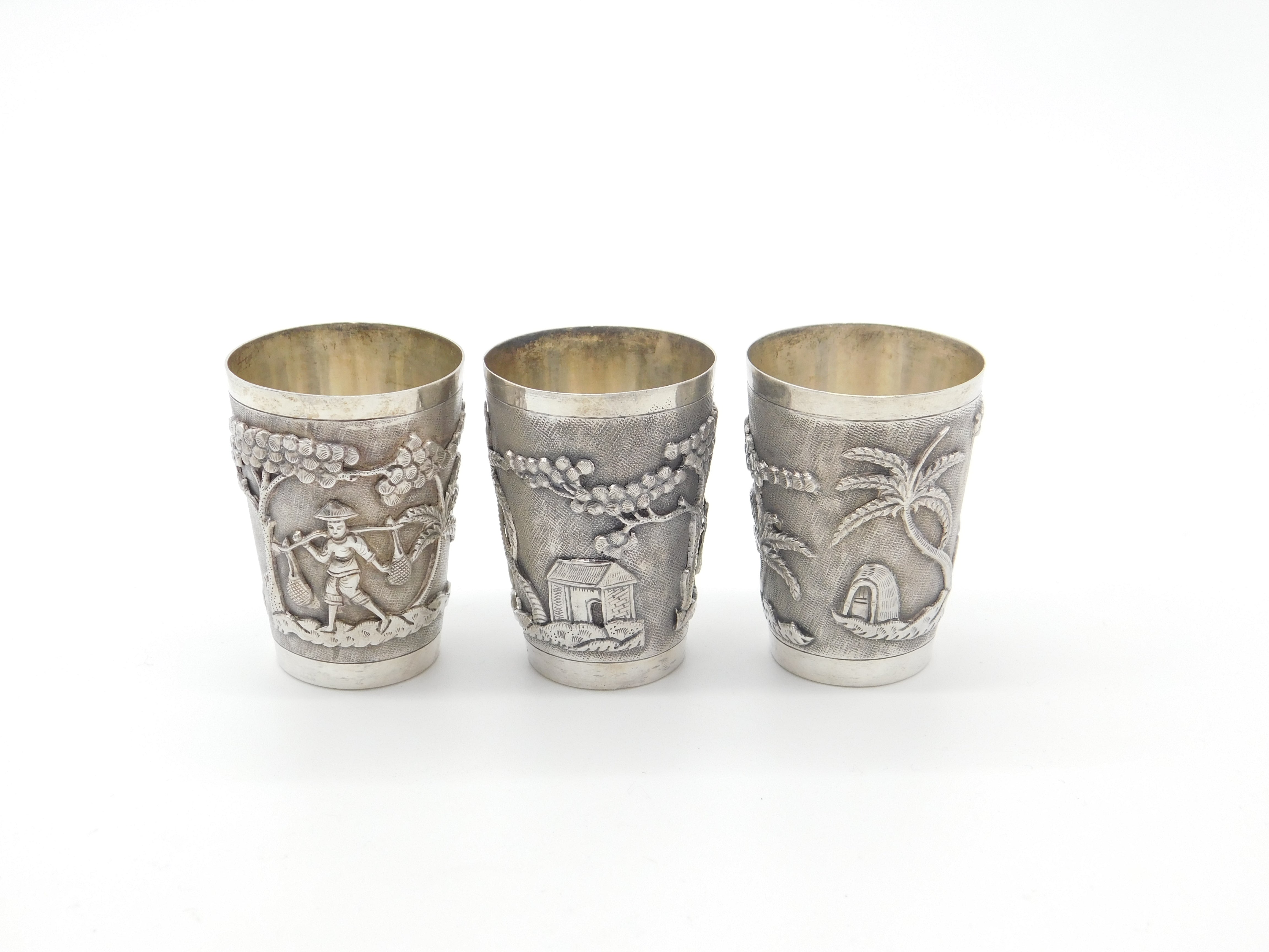Set Of Three Sterling Silver Oriental Shot Cups Rural Scene Antique c1900