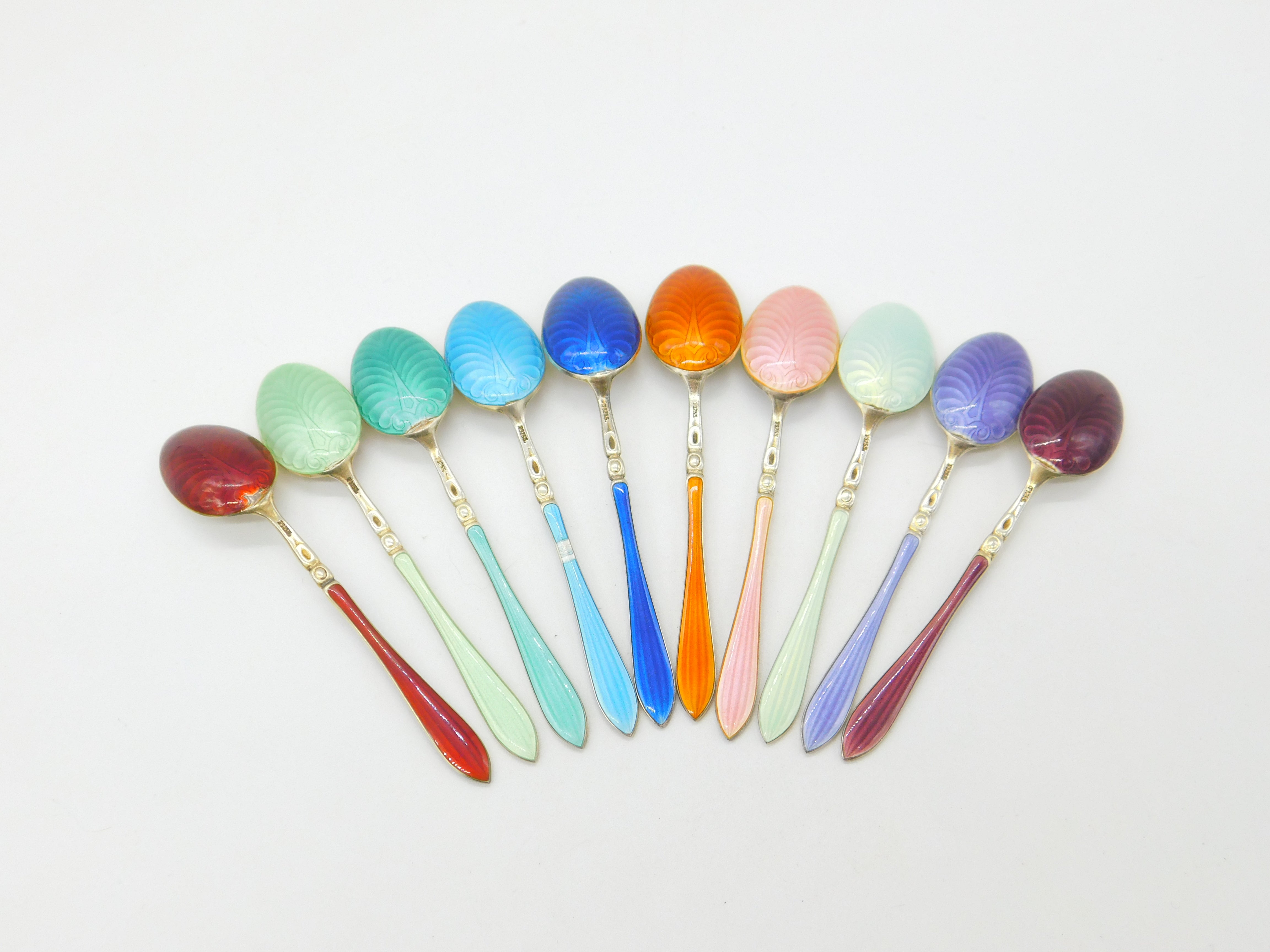 Set of Ten Scandinavian Sterling Silver Rainbow Guilloche Enamel Teaspoons c1920