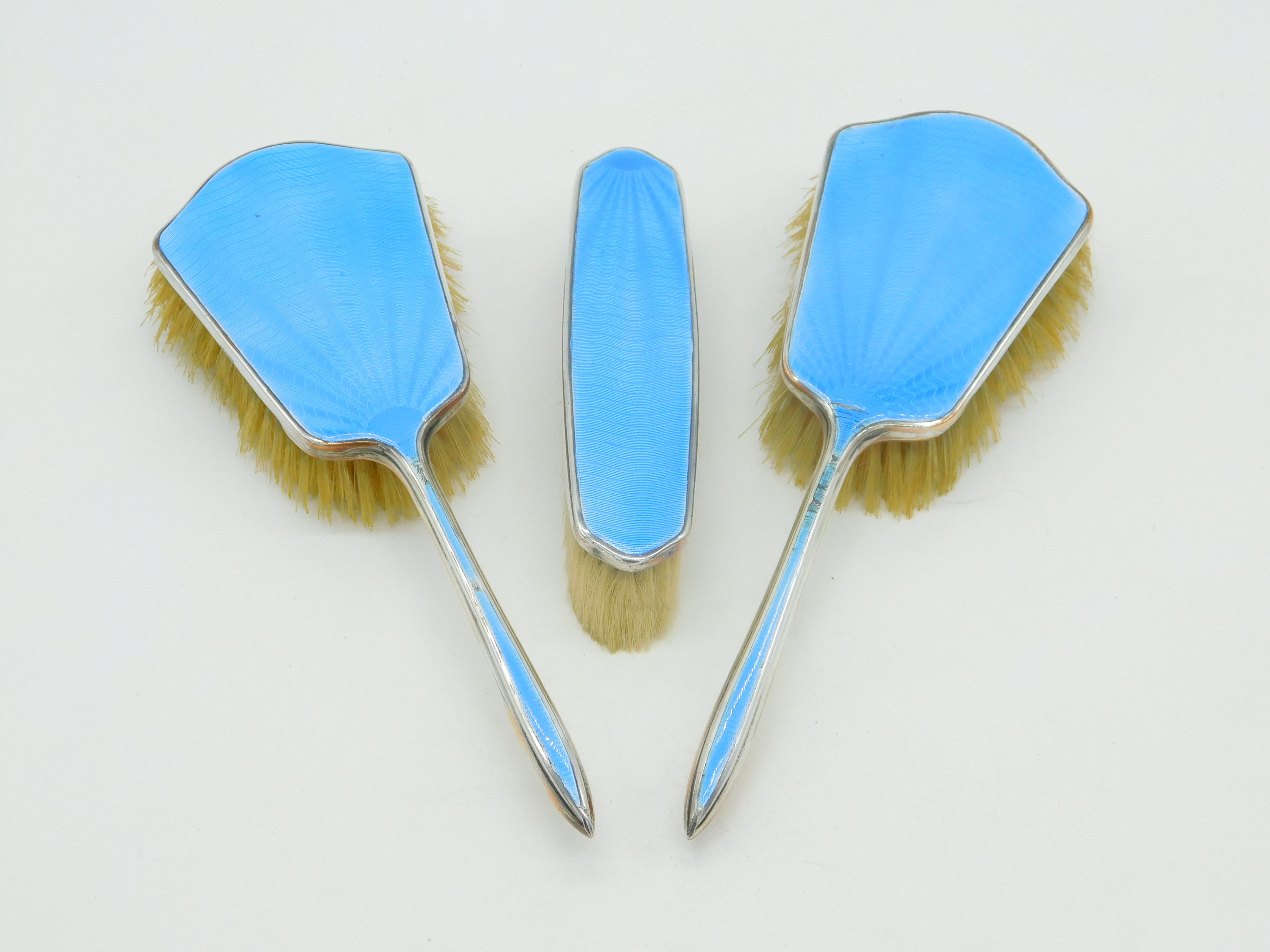 Silver Plated Blue Guilloche Enamel Three Piece Vanity Set Antique c1930 Deco