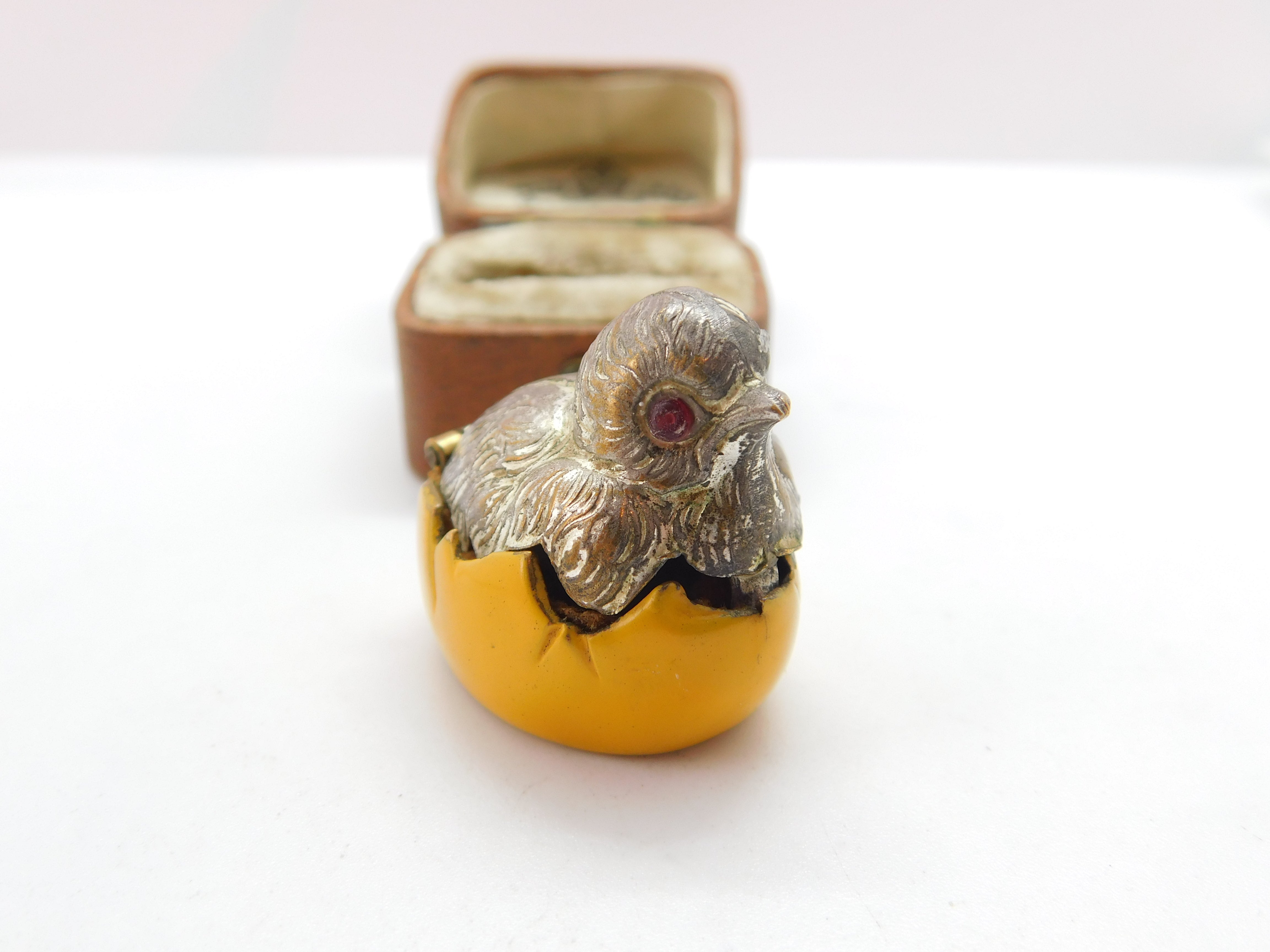 Silver Plated Yellow Enamel Chick in Egg Sewing Thimble Case c1910 Antique