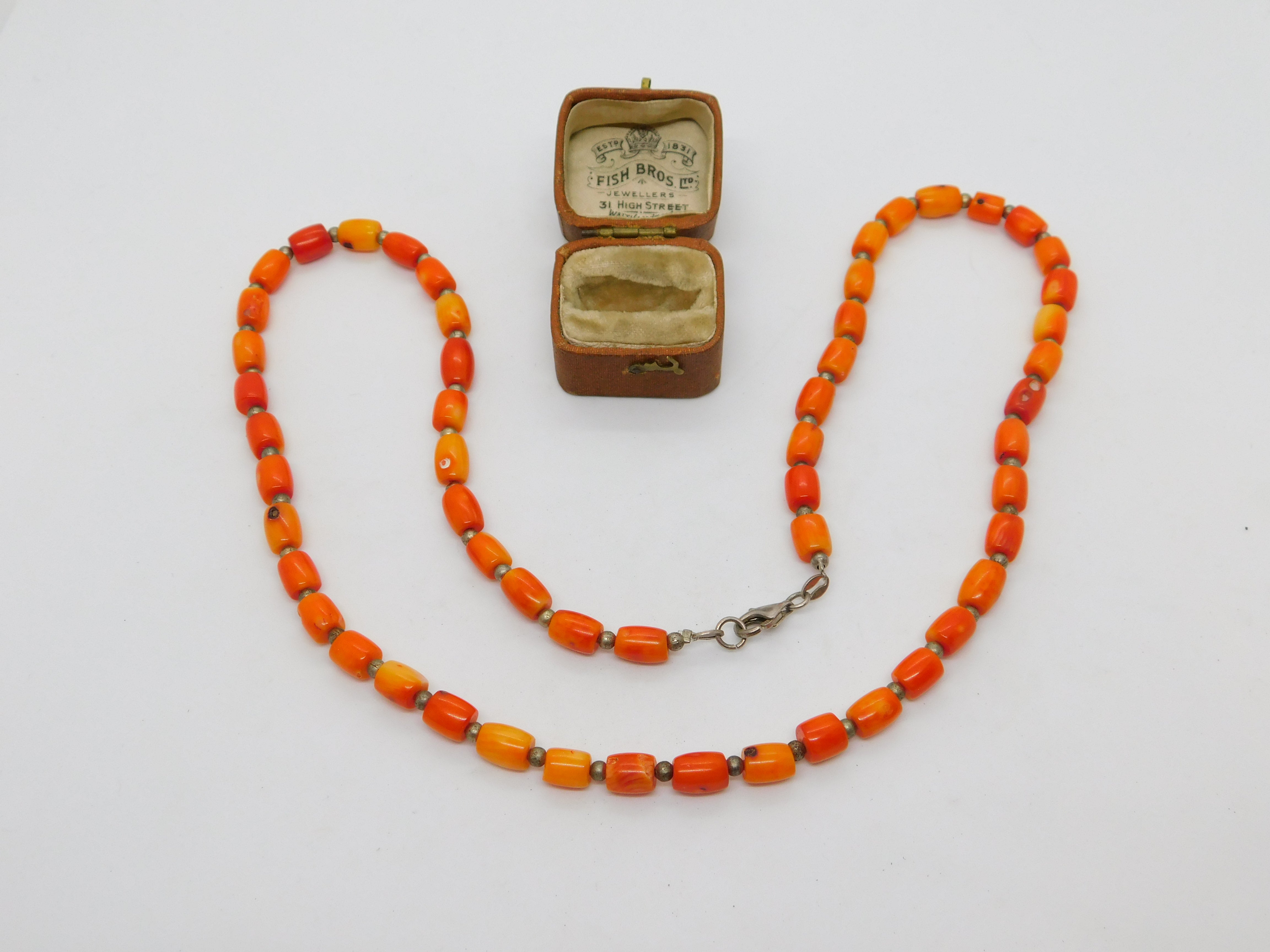 Sterling Silver & Natural Carved Red Coral Bead Necklace Antique c1930 58cm