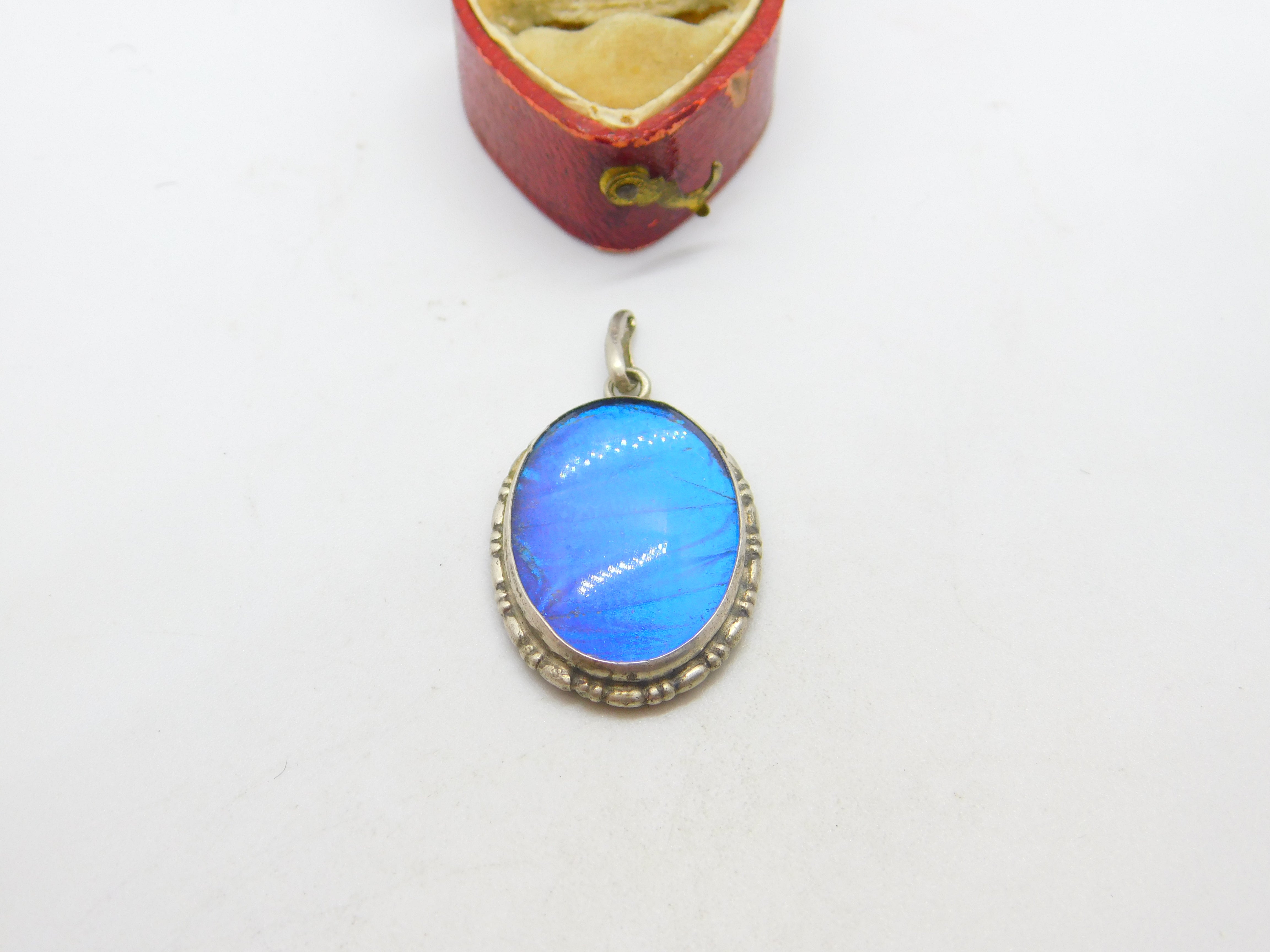 Sterling Silver & Morpho Butterfly Wing Drop Pendant Antique c1920 Art Deco