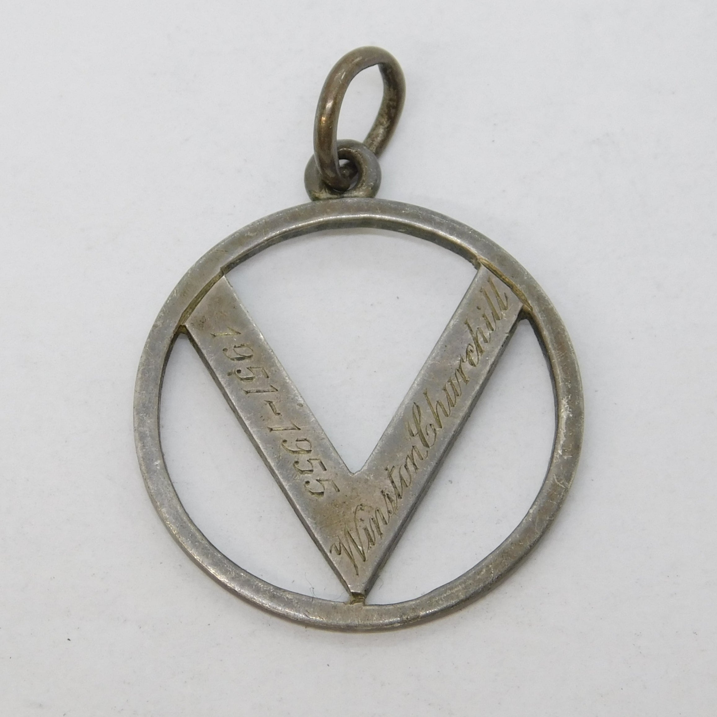 Sterling Silver 'V for Victory' Winston Churchill Pendant Vintage 1954 London