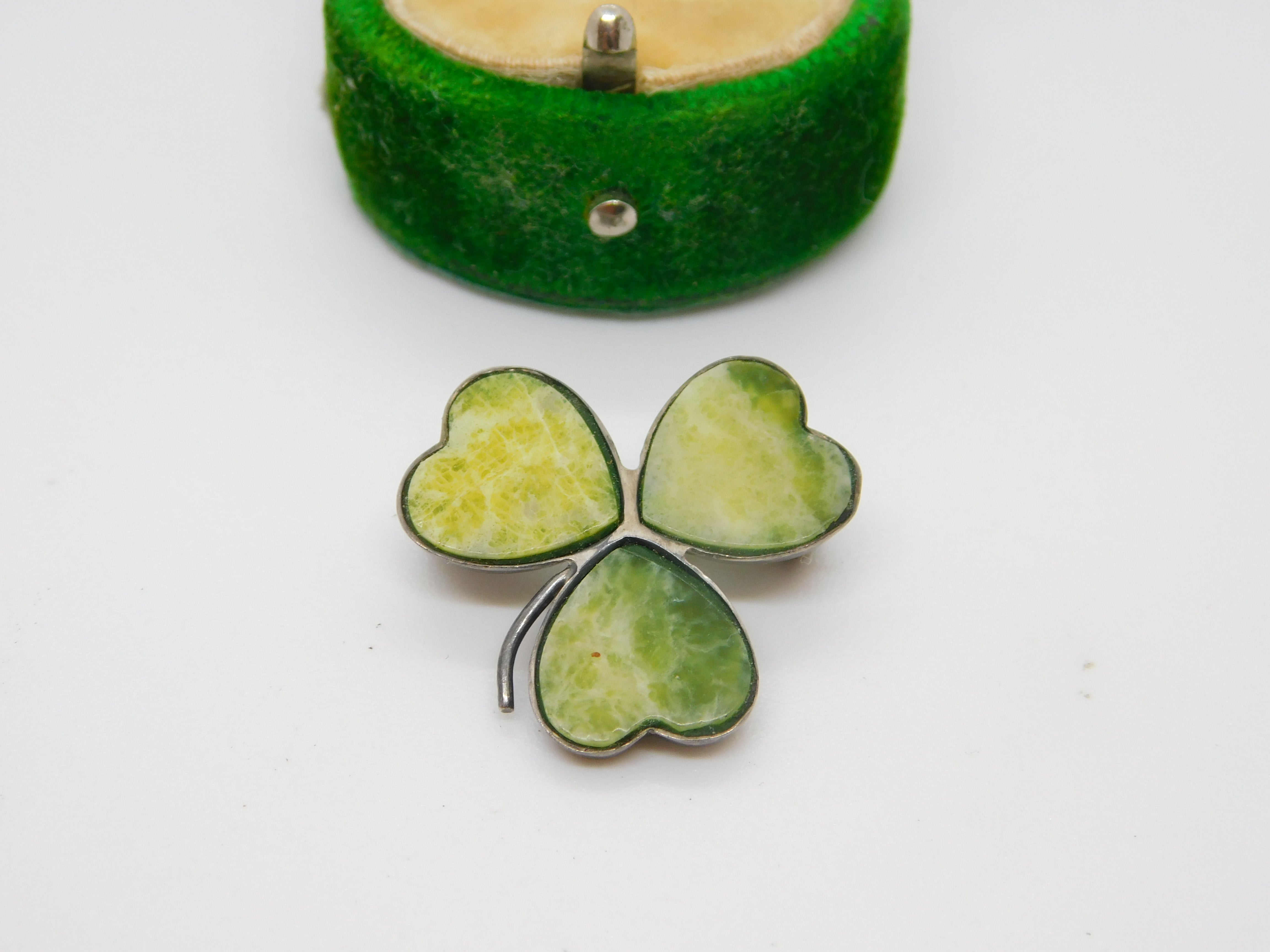 Sterling Silver Connemara Marble Lucky Shamrock Brooch Antique c1920 Irish