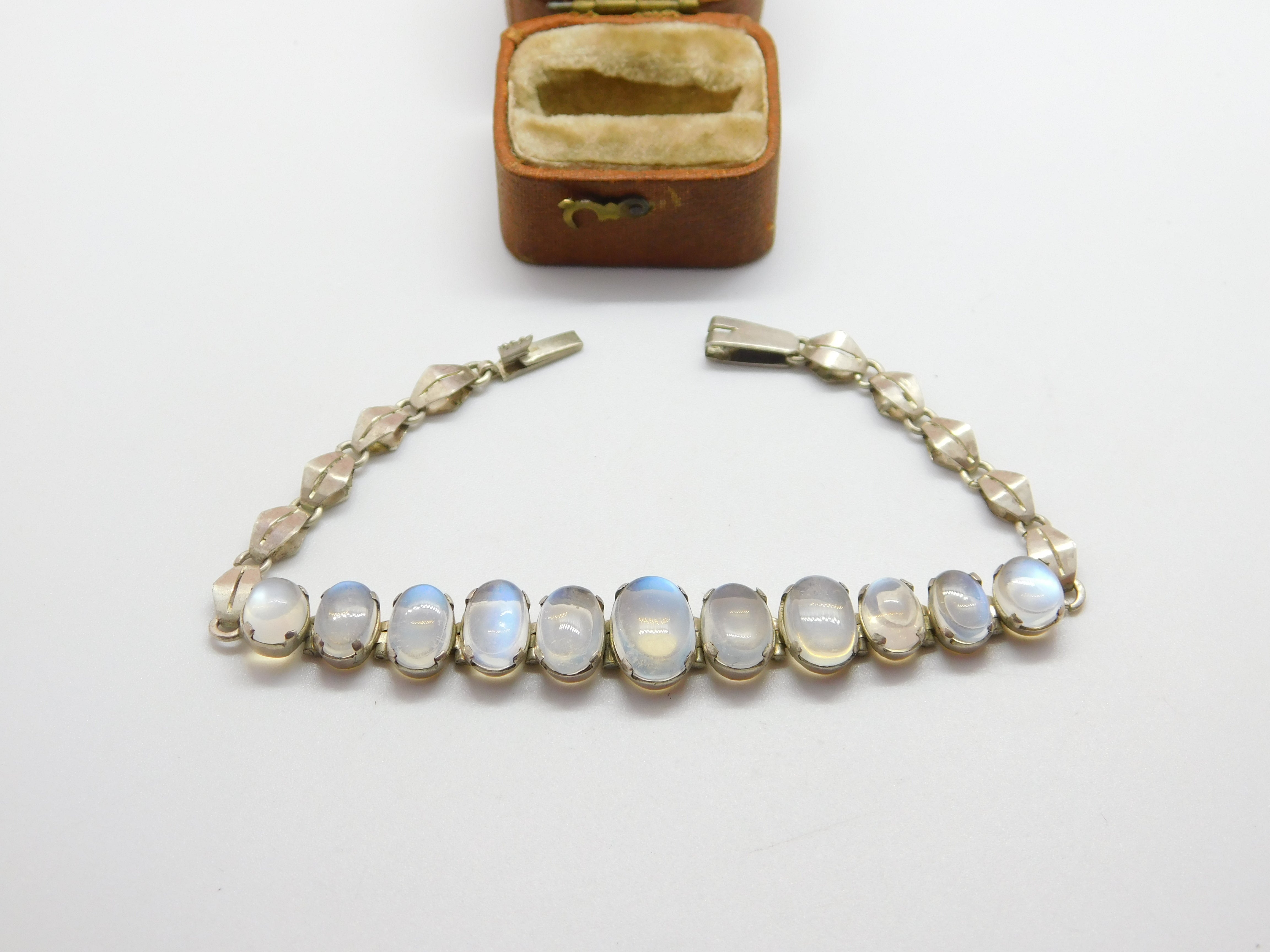 Sterling Silver Graduating Cabochon Moonstone Set Bracelet Antique c1920 Deco
