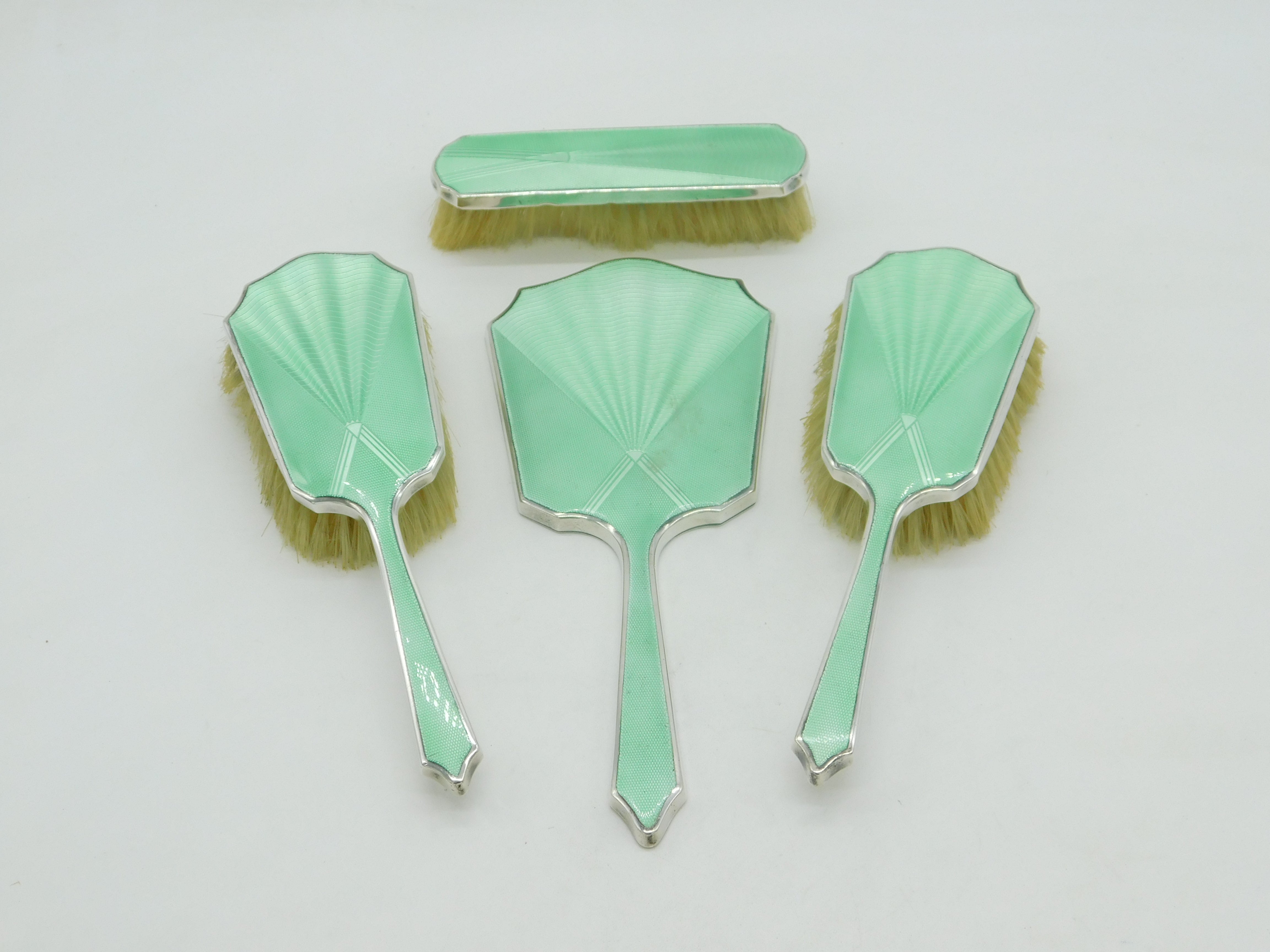 Sterling Silver Green Guilloche Enamel Mirror & Brush Set Antique 1935 Art Deco