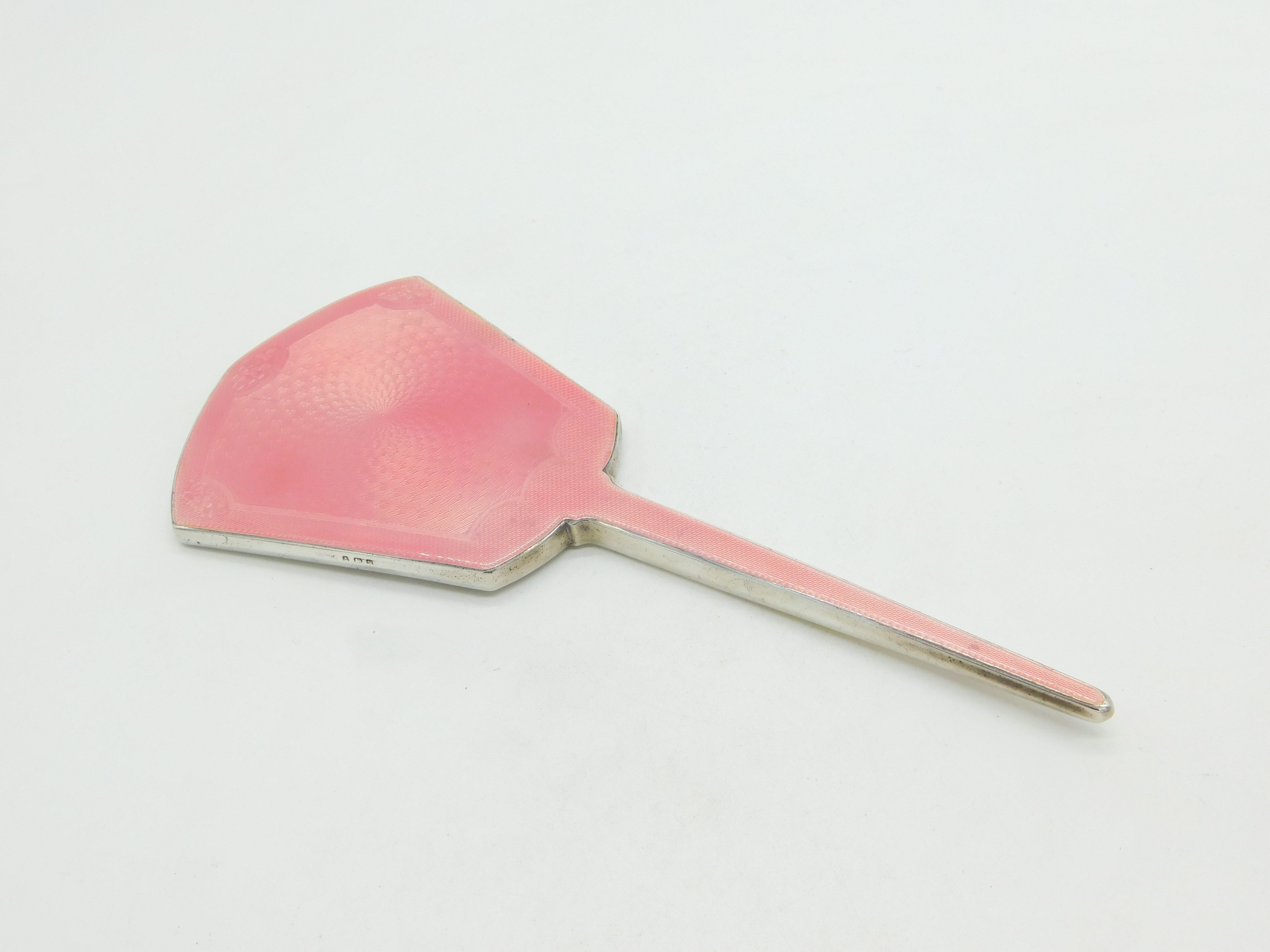 Sterling Silver Guilloche Pink Enamel Hand Mirror Antique 1937 Antique Deco