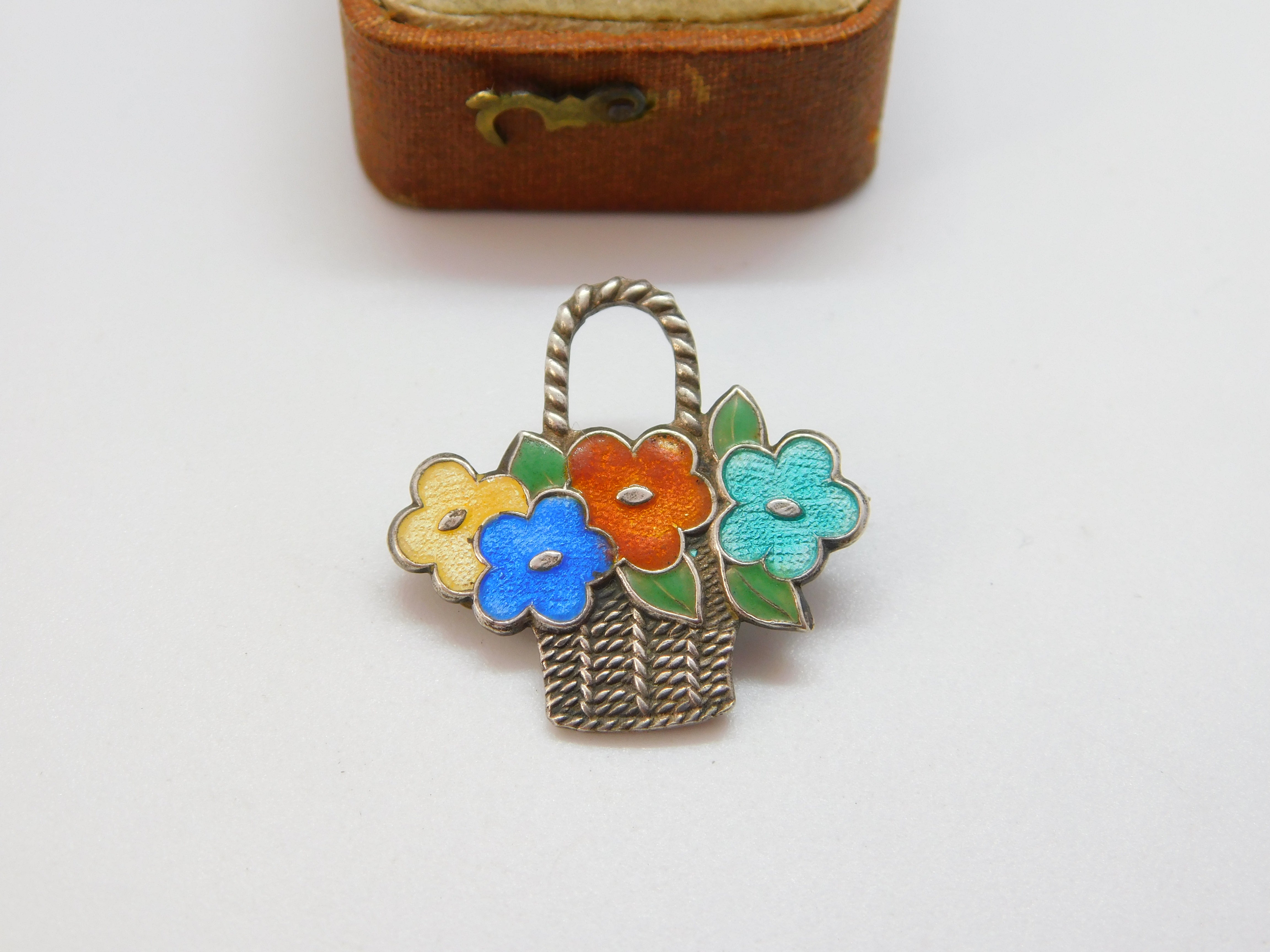 Sterling Silver Guilloche Enamel Flower Basket Brooch Antique c1930 Art Deco