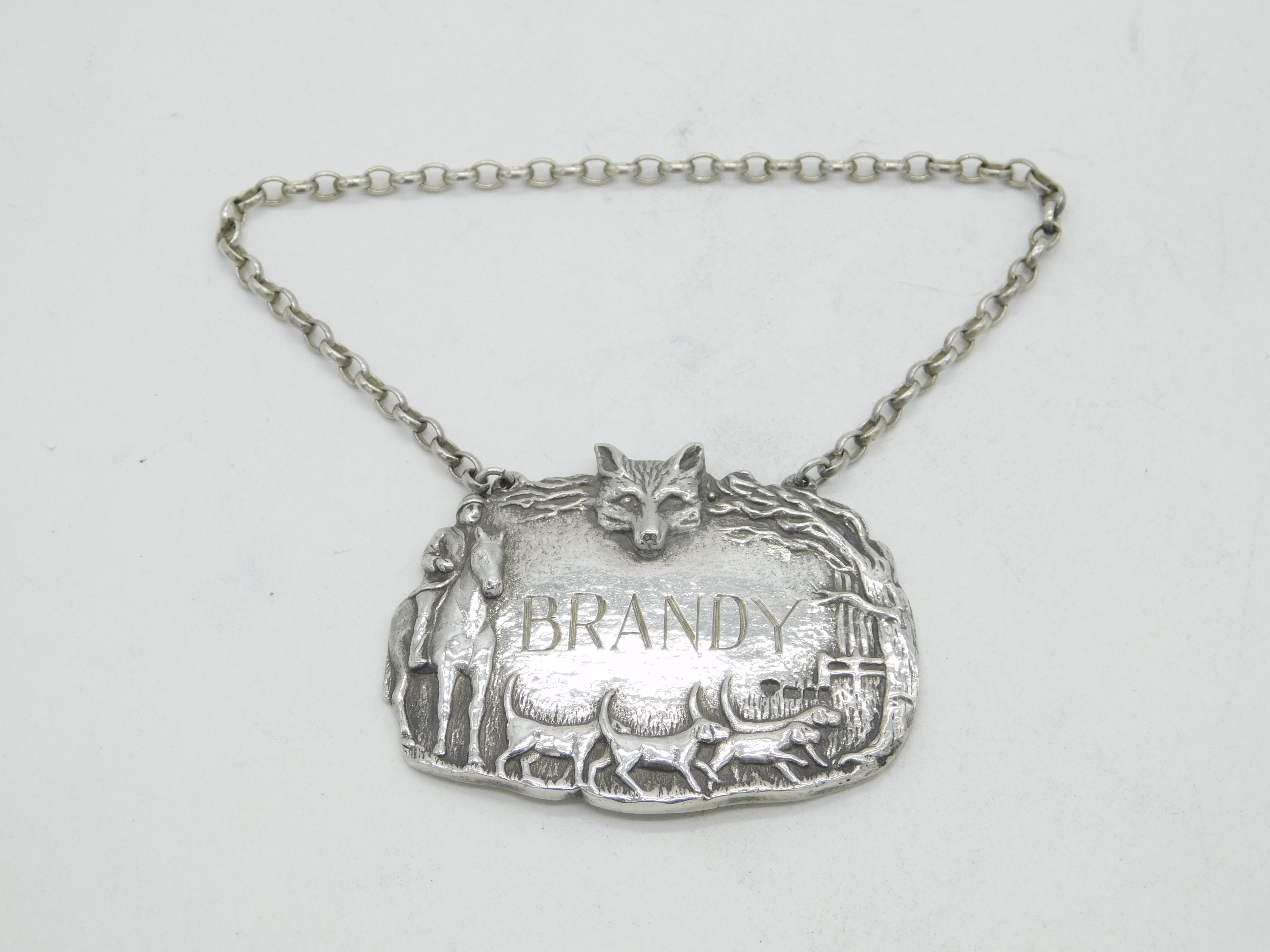 Sterling Silver Hunting Interest Fox Mask Brandy Decanter Label Vintage 1971 London