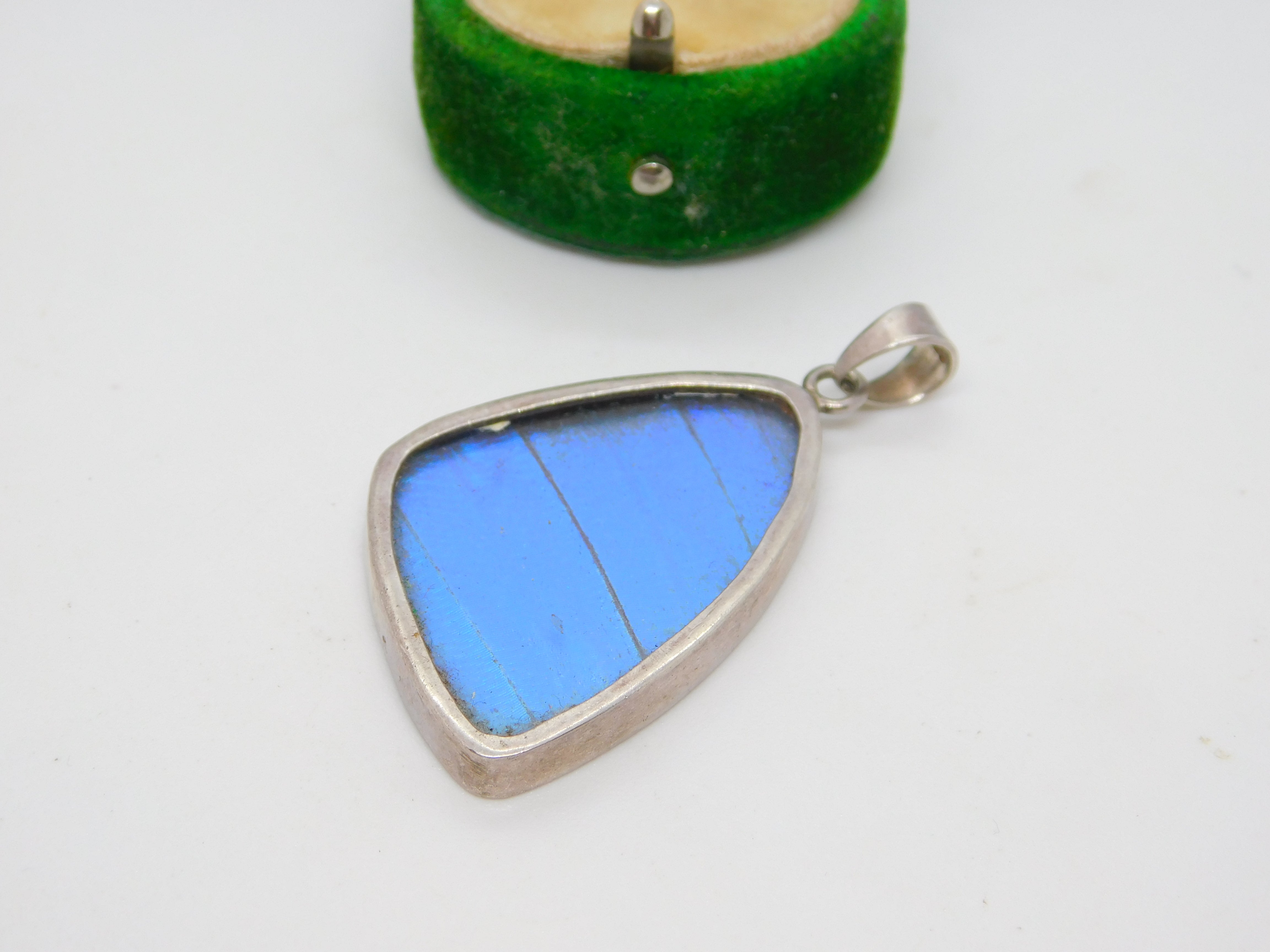 Sterling Silver Mounted Morpho Butterfly Wing Drop Pendant Antique c1940 Deco
