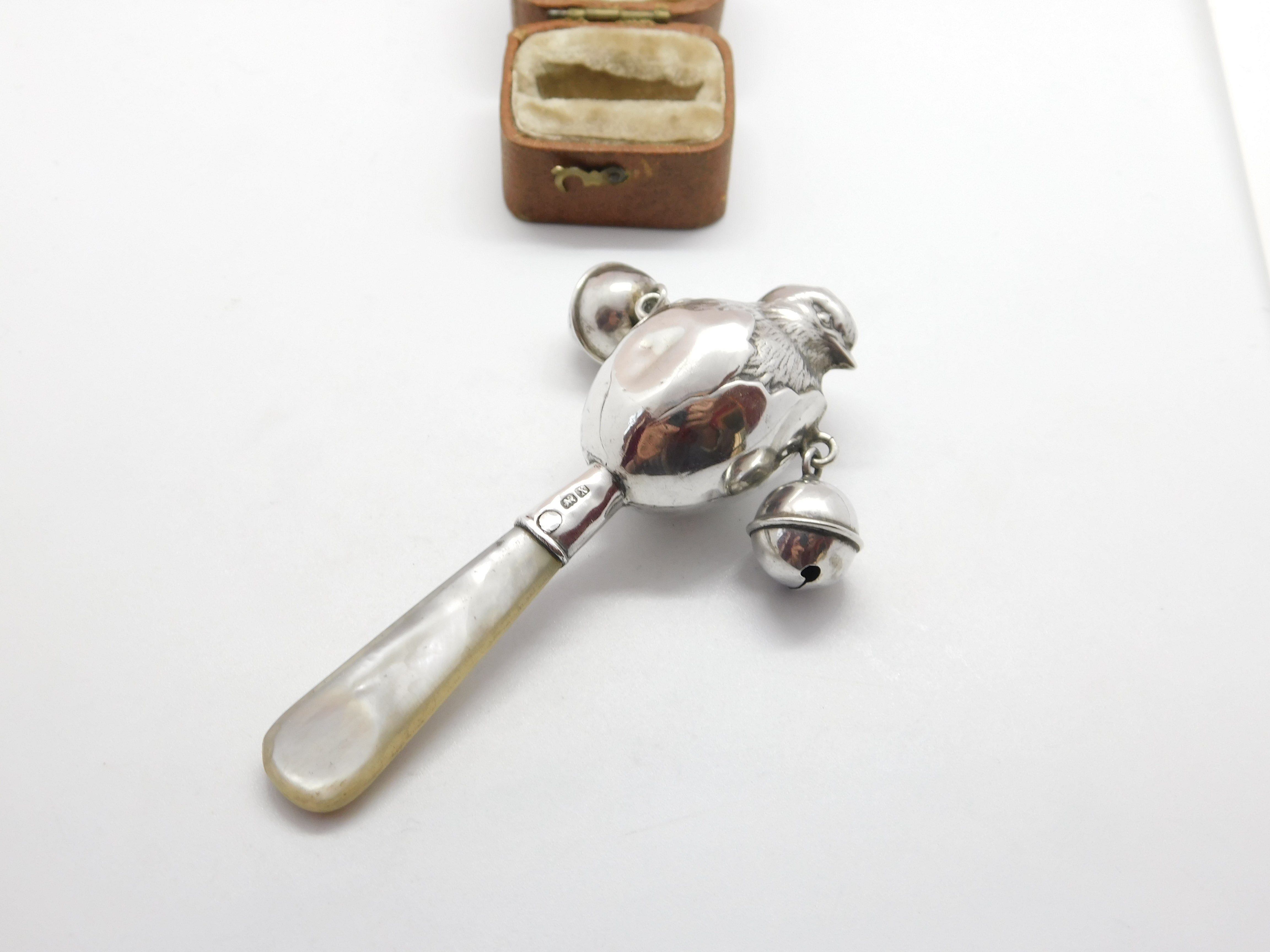 Sterling Silver Mother of Pearl Chick in Egg Baby Rattle & Teether 1922 Antique