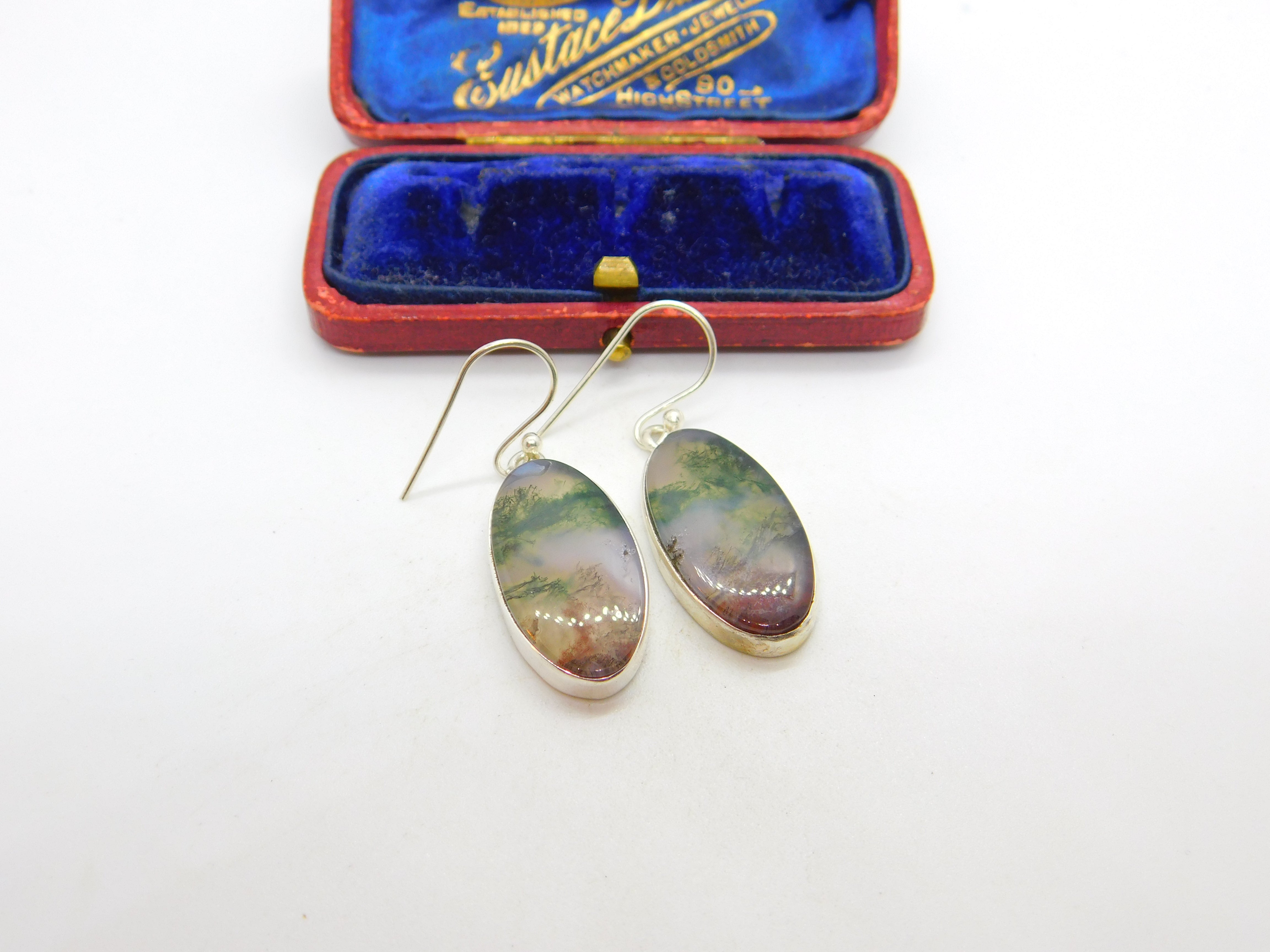 Sterling Silver Mounted Moss Agate Drop Earrings Vintage c1970