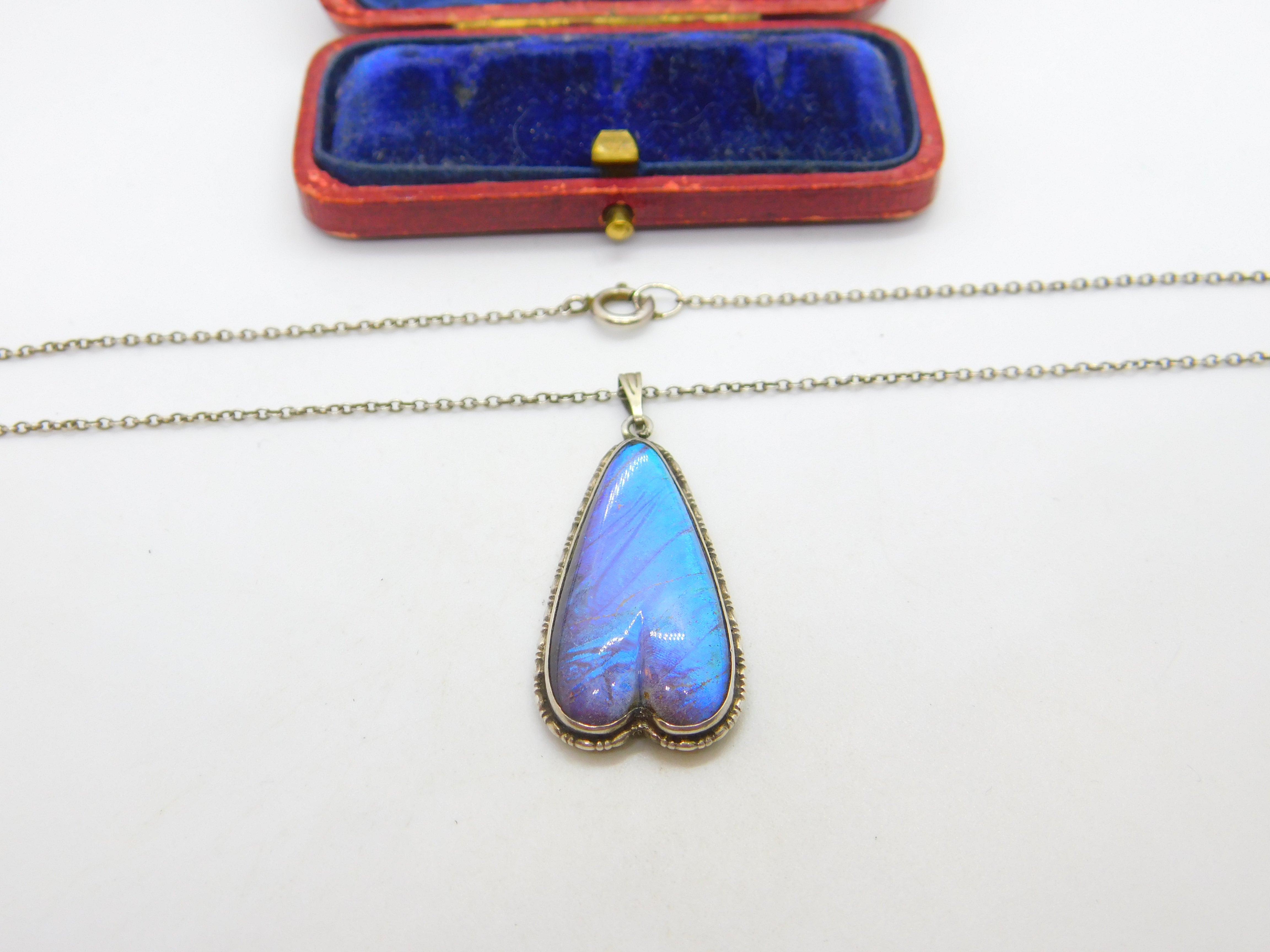 Sterling Silver Morpho Butterfly Wing Set Upside Down Heart Drop Necklace c1920