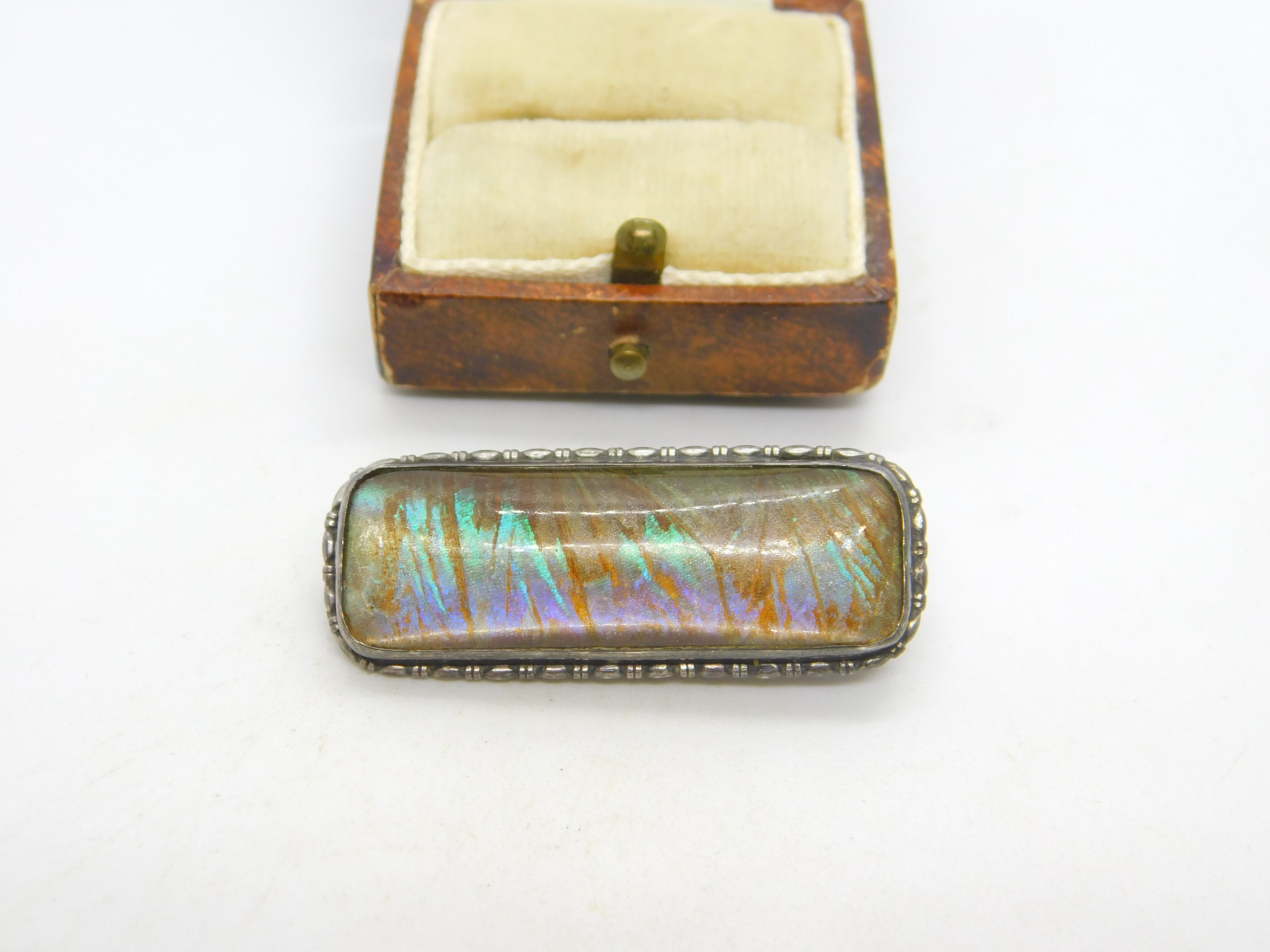 Sterling Silver Mounted Morpho Butterfly Wing Set Brooch Pin Antique c1920